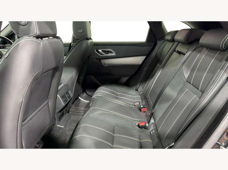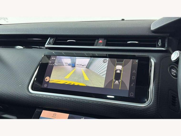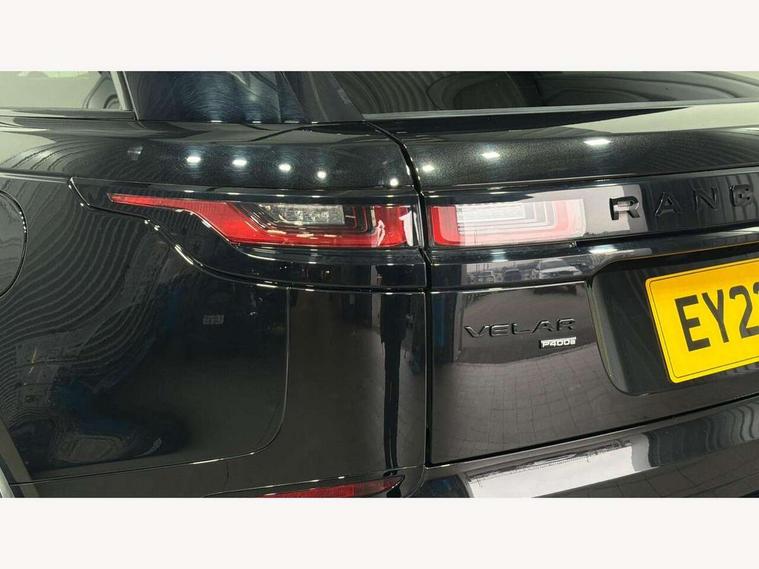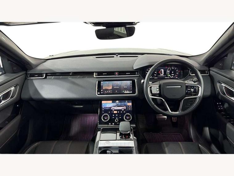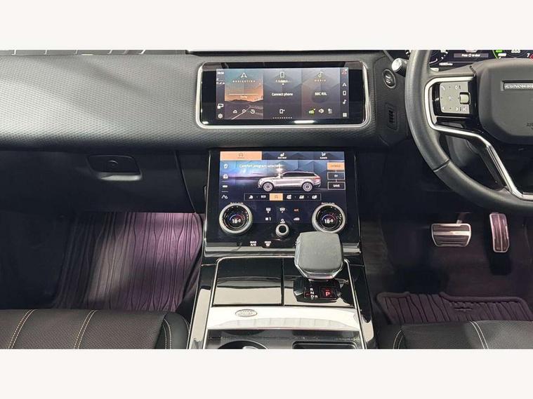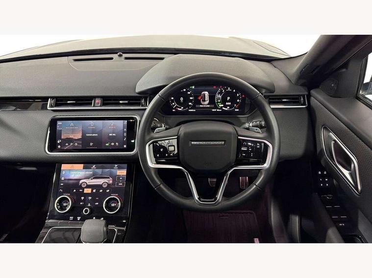 10" deployable touchscreen, Android Auto, Apple car play, Blind spot assist, Bluetooth connectivity, Brake pad wear indicator warning light, Driver condition monitor, eCall emergency call system, InControl remote, Interactive Driver display instrument cluster, Land Rover InControl apps, Lane keep assist, Pivi pro with connected navigation, Push button start, Rear traffic monitor, Service indicator, Speed proportional electronic power assisted steering (EPAS), Traffic sign recognition with adaptive speed limiter, Trip computer, Voice control system, 8 speed automatic transmission, AC/DC charging, Adaptive dynamics, All terrain progress control, Coil suspension system, Home charging cable, Open differential with torque vectoring by braking, Public charging cable, Single speed transfer box, Digital Audio Broadcast radio-DAB, Steering wheel mounted controls, Acoustic laminated windscreen, Adaptive front lighting system, Auto dimming interior rear view mirror, Automatic headlamp levelling, Automatic headlights, Body coloured bumpers, Boot protection plate, Electric heated/power fold door mirrors with approach lights and auto dimming driver side, Electric windows with one touch open/close and anti trap, Flush deployable exterior door handles, Follow me home headlights, Heated rear window with timer, Heated washer jets, Heated windscreen, LED 3rd brake light, Metal load space scuff plates, Rain sensor windscreen wipers, Rear animated directional indicators, Rear fog lights, Rear side wing doors, Rear wash/wipe, Tailgate/boot lid spoiler, Trailer stability assist, Velar and R-dynamic badge, 3 seat bench in 2nd row, Ambient lighting, Bright metal pedals, Driver/passenger sunvisors with illuminated vanity mirrors, Isofix system on outer rear seats, Loadspace cover, Overhead lighting console, Overhead stowage for sunglasses, Passive front headrests, Rear air vents, Rear centre headrest, Satin chrome gearshift paddles, Single front passenger seat, Standard interior, Twin front cupholders, Twin sliding front centre armrest, Online pack with data plan - Velar, 380mm front brakes and 325mm rear brakes, 3x3 point rear seatbelts, Anti-lock braking system (ABS), Cornering brake control, Curtain airbags, Customer configurable autolock, Door side intrusion beams, Driver airbag, DSC - Dynamic Stability Control, Electronic brake force distribution, Electronic parking brake, Electronic traction control, Emergency brake assist, Emergency braking, Front and rear seatbelt reminder, Hill descent control, Hill launch assist, Low traction launch, Passenger airbag, Power operated child locks, Rear airbags, Roll stability control, Side airbags, Tyre pressure monitoring system, Unpainted brake calipers, Global lock and unlock switch on driver door, Immobiliser, Intrusion sensor, Keyless entry, Lock only switch on front passenger door, Locking wheel nuts, Perimetric alarm, Remote central locking,