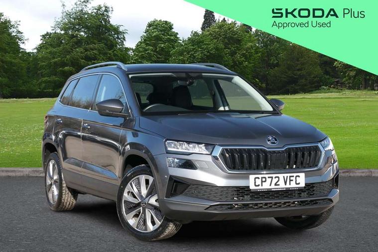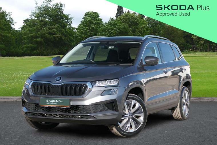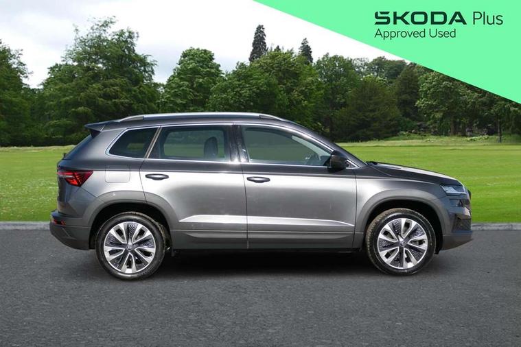 8" Digital display, Care connect, Driver fatigue sensor, Emergency services call system, Outside temperature gauge, Service interval indicator, SmartLink wireless for Apple and wired for Android, Start/stop system with regenerative braking, USB C Port x 2 in front centre console, 8 Speakers, DAB radio with Bluetooth, USB connection, Acoustic glass, Aero front windscreen wipers with intermittent function, Auto dimming rear view mirror with light and rain sensors, Black electric window control buttons, Body colour door mirrors and handles, Dynamic headlight range control with cornering light function, Electric front and rear windows with child proof lock, Heated rear windscreen, LED daytime running lights, LED rear lights with high functionality welcome effect and dynamic indicators, Light assistant (coming/leaving home/tunnel light), Plastic scuff plates, Privacy glass, Rear side wing doors, Rear spoiler, Rear window wiper with washer system and intermittent control, Safety reflectors on front doors, 1.5 litre bottle holders in driver and front passenger door panels, 12V socket in boot, 12v socket in front centre armrest with storage compartment and rear air vents, 2 Folding hooks and nets in boot, 2 spoke leather heated multifunction steering wheel with DSG paddles, 2 x Tablet holder, 3 rear height adjustable headrests, 3 seat bench in 2nd row, 4 foldable roof handles with rear coat hooks, Black floor carpet, Chrome inner door handles, Decorative door sills with KAROQ badging, Double sided boot floor, Foldable hooks in the boot, Front head restraints, Height adjustable front three point seats belts with tensioners, Height/reach adjust steering wheel, Ice scraper, Illuminated glovebox, Illuminated luggage compartment, Isofix child seat preparation for front passenger seat, Isofix child seat preparation outer rear, Manual lumbar support for front seats, Pen holder, Pollen filter, Rear boot cover, Rear reading lights, Rubbish bin door, Safety vest holder, Single front passenger seat, Storage box in upper central dashboard closed, Sunvisors with illuminated vanity mirrors, Textile floor mats, Ticket holder, VarioFlex seats with standard rear seat release, Chrome roof rails + chrome pack - Karoq, Parking pack - Karoq, Automatic door unlocking in case of crash, Automatic fuel cut off in case of crash, Child locks on rear doors, Driver airbag, Electronic parking brake with auto hold function, Emergency rear braking signal, ESC including ABS, MSR, ASR, EDS, HBA, DSR, RBS, MKB and traction control, Front side airbags, Hill hold control, Knee airbags, Passenger airbag with switch-off function, Pedestrian monitor, Seatbelt reminder signalisation and pretensioner for all seats, Three point seatbelts rear, Two tone horn, Tyre pressure display, Tyre pressure monitor, Alarm with interior monitoring, back up horn and tilt sensor with safe function, Electronic engine immobiliser, Keyless entry and start/stop, Remote central locking with 2 remote folding keys, Chrome framed air vents, 18" Procyon silver alloy wheels with anthracite aero inserts, Anti-theft wheel bolts protection, Storage on wheel cover, Tool kit,