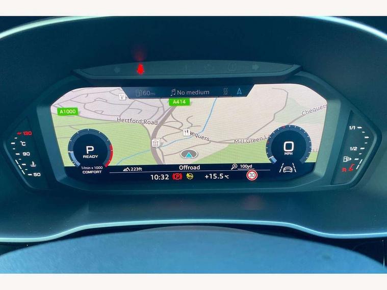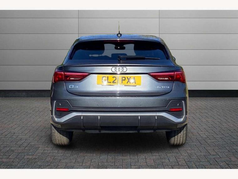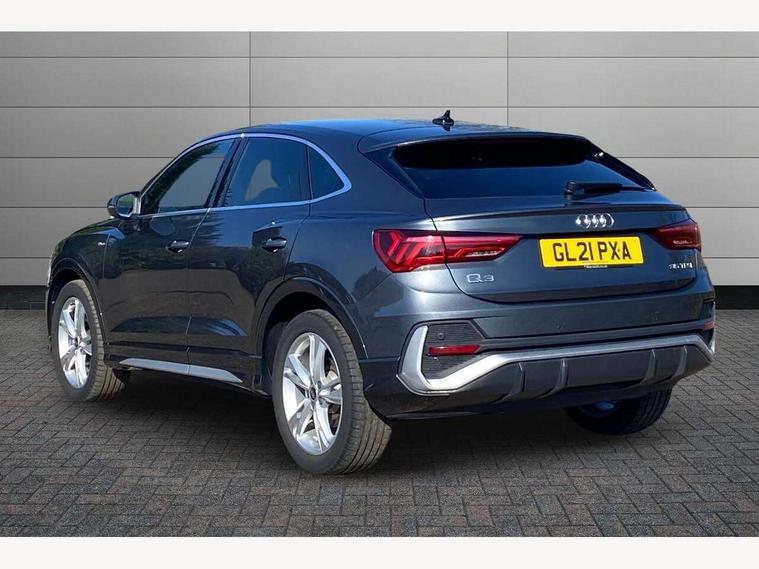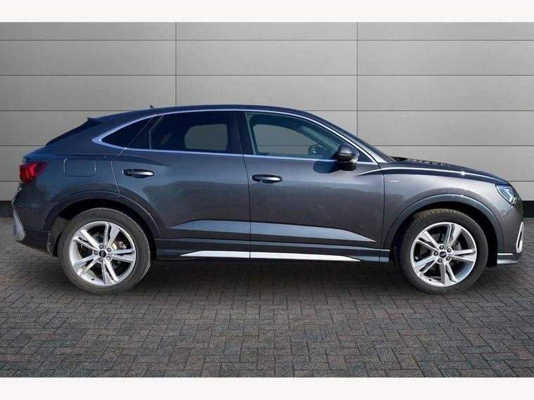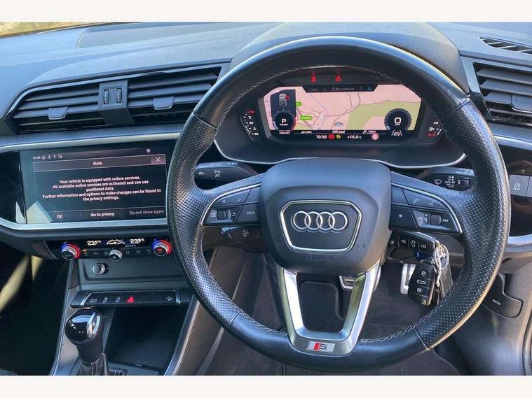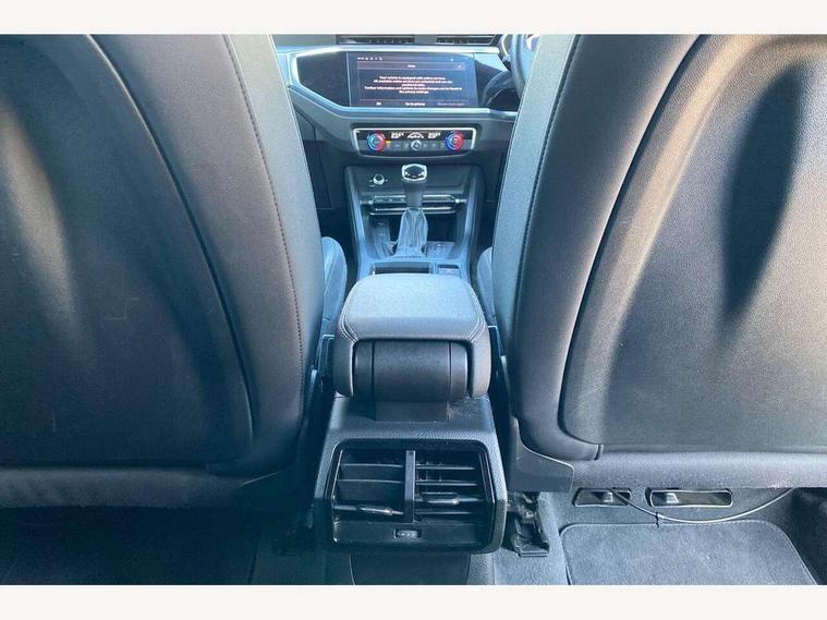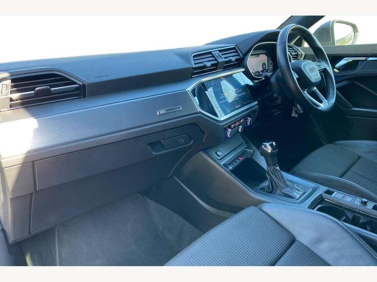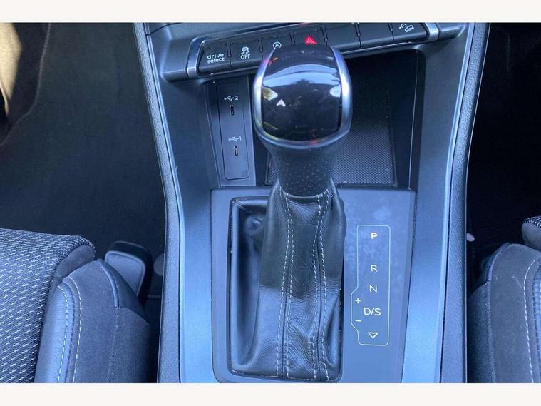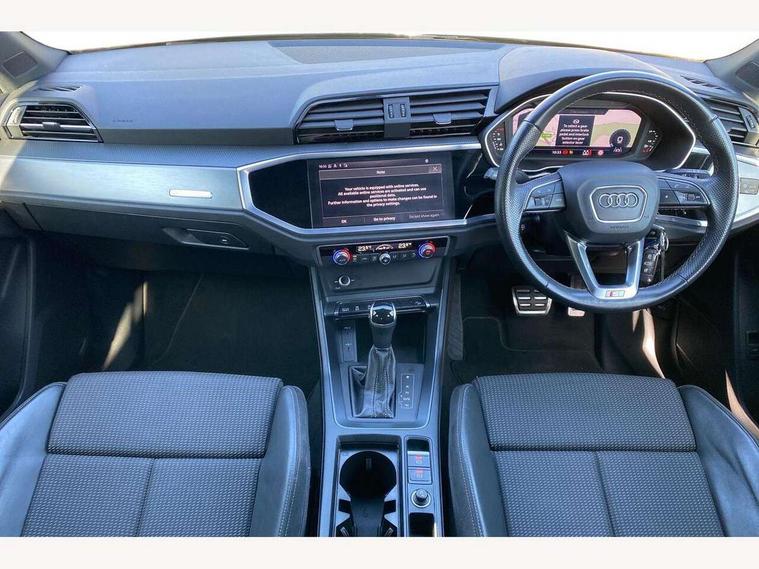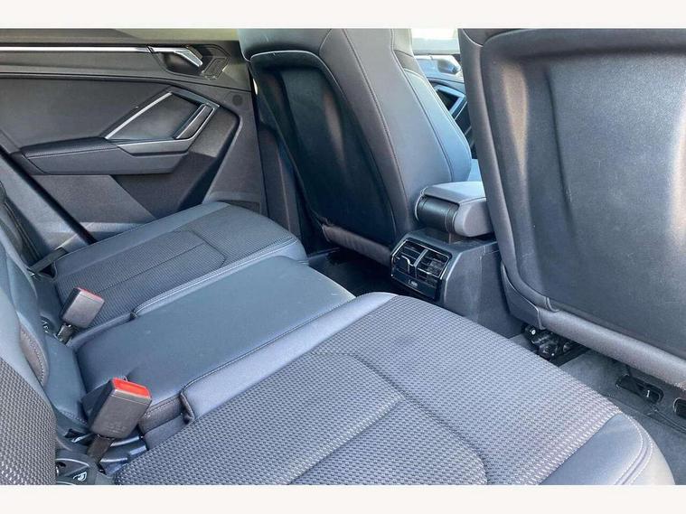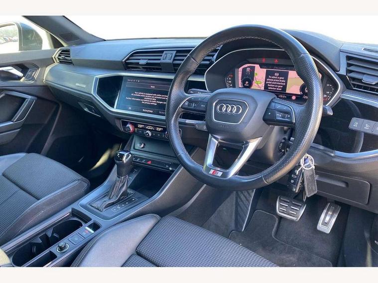 Audi connect safety and service (e-call), Audi drive select, Audi lane departure warning, Audi smartphone interface includes wireless Apple carplay/Android Auto, Audi Virtual Cockpit - 10.25" display, Bluetooth interface, Camera based traffic sign recognition, MMI Navigation Plus with high resolution 10.1 inch touchscreen colour display, Power operated tailgate, Progressive steering, Service interval indicator, Start stop system with recuperation, Voice control system with natural language interaction, 48V Mild hybrid technology, Sports suspension, 2 USB-C ports with charge and data functions, 6 passive loudspeakers, DAB digital radio module, Acoustic windscreen, Aluminium window trim, Auto dimming frameless rear view mirror, Diffuser grille in grained matt black, Diffuser trim in selenite silver, Electrically folding, adjustable and heated door mirrors with integrated LED side indicators and kerb view function for passenger side, Front and rear electric windows, Front fog lights, Front side air inlets in selenite silver, Front underbody protection in manhattan grey paint finish, Grille surround in aluminium silver matt, High gloss black finish B and C pillars, LED headlights with LED daytime running lights and dynamic rear indicator, LED rear lights, Privacy glass dark tinted rear and rear-side windows (from B-pillar backwards), Radiator grille in titanium black with inlay in matt aluminium silver, Rain and light sensors, Rear underbody protection in matt black, S line badges on front wings, Side skirt insert in matt Platinium grey, 12V socket in rear centre console, 40:20:40 folding with manual adjustment for 60:40 forwards/backwards position and backrest angle, Adjustable rear seat bench/backrest with centre armrest and cupholder, Black cloth headlining, Dual zone electronic climate control, Front and rear black floor mats with contrast stitching, Front and rear headrests, Front and rear roof module including reading lights, Front centre armrest, Glove compartment lighting, Height and reach adjustable steering wheel, Illuminated door sill trims with S logo, ISOFIX child seat mounting for front passenger with airbag deactivation and outer rear seat including top tether attachment point for outer rear seats, Luggage compartment light, Manual front seats with height adjustment, Perforated leather gearknob, Stainless steel luggage compartment sill finisher, Stainless steel pedals, Tool kit, Non smoking pack - Q3, 3x3 point rear seatbelts, 6 airbags - Driver, front passenger, curtain and side windows, Electrically operated child locks on rear doors, Electromechanical parking brake, Electronic stabilisation control including ABS, ASR and EDL, Hill descent control, Hill hold assist, Pre sense basic, Seatbelt monitoring, Tyre pressure warning, Warning triangle and first aid kit, Anti theft alarm, Anti theft wheel bolts, Audi pre-sense front with pedestrain and cyclist recognition, Remote central locking, Black dashboard, Dark matt brushed aluminium inlay, Leatherette door armrest, MMI touch colour display in glass look, black with surround in aluminium look, Tyre repair kit,