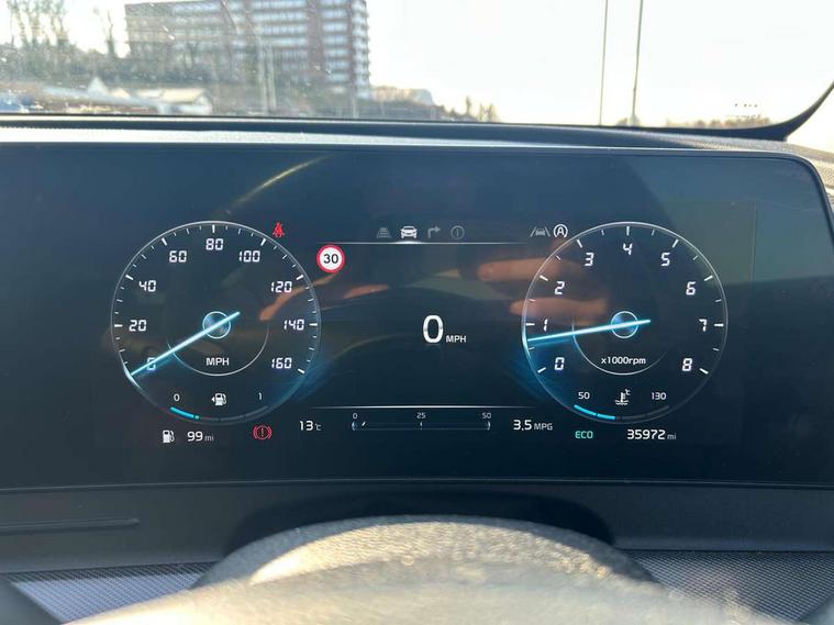 12.3" Display with navigation, 12.3" supervision colour cluster display, Apple car play/Android Auto with voice control, Cruise control + speed limiter, Drive mode selector, E-call, Forward collision avoidance assist (FCA) - city/pedestrian/cyclist/junction covering, Front and rear parking sensors, Intelligent speed limit assist, Kia Connect (UVO), Lane Following Assist (LFA), Lane keep assist, Low washer fluid warning, Rear view monitor, Reversing camera system integrated into centre fascia screen, Speed sensitive power steering, Trip computer, Windscreen washer level indicator, Intelligent Stop and Go, 6 speaker audio system, Bluetooth audio streaming, DAB Radio with MP3, Rear USB port, Steering wheel mounted audio controls, USB port for connection of a media device, All round electric windows with drivers and front passenger auto up/down function, Automatic headlight control system, Automatic window defogger, Backlite glass heated with timer, Black side sill and wheel arch body mouldings, Body colour and black bumper with silver accents, Body colour door mirrors, Body colour exterior door handles, Electrically adjustable/heated/folding door mirrors with LED indicators, High beam assist, Interior electrochromic mirror, LED daytime running lights, LED front fog lamps, LED headlamps (low and high beam - MFR type), LED High mounted stop light, Rain sensing wipers with aero blades, Rear fog lamp, Rear privacy glass, Rear side wing doors, Rear skid plate - silver, Rear spoiler, Rear wiper, Satin finished beltline, Silver radiator upper garnish and door garnish, Silver roof rack, Trailer stability assist, 12V power socket in front centre fascia and luggage compartment, 2nd row personal lamps, 3 seat bench in 2nd row, 3 x passenger assist grips, 40/20/40 split folding rear seat, All-round height adjustable headrests, Centre console storage box, Cloth/faux leather upholstery, Cupholders in rear armrest, Door courtesy lamps, Drink holder at centre armrest, Driver and front passenger side sunvisors with illuminated vanity mirrors, Drivers seat power lumbar support, Electric height adjustable front seats, Front and rear door storage, Front seat and rear pockets, Front/rear centre armrests, Gear shift indicator, Glovebox illumination, Heated front and outer rear seats, Heated steering wheel, Interior door lock/unlock function, ISOFIX Child seat top tethers and anchor fixings outer rear seats, Leather steering wheel, Luggage area light, Luggage area load cover, Luggage net with hooks, Metal paint interior door handles, Overhead console lamp, Rear coat hooks, Single front passenger seat, Three zone climate control, Tilt/telescopic adjustable steering wheel, Ventilation ducts to rear compartment, Active front headrests, All round 3-point seatbelts, Anti-lock braking system (ABS), Dual front side airbags, Dual horn, Electronic parking brake, Electronic stability control with downhill brake control, Front passenger airbag cut-off switch, Front seatbelt pretensioners + load limiters, Height adjustable front seatbelts, Hill start assist control (HAC), Impact sensing auto door unlocking, Multi collision brake assist, Rear door child safety locks, Rear seat alert system, Traction control, Twin curtain airbags, Twin front airbags, Tyre pressure monitoring system, Advanced anti-theft system including immobiliser and alarm, Door deadlocks, Engine Start/Stop Button with Smart Entry System, Locking wheel nuts, Speed sensitive auto door locking, Visible vehicle identification number, Aluminium pattern finish centre fascia and door garnish, 18" Alloy wheels, Tyre mobility kit,