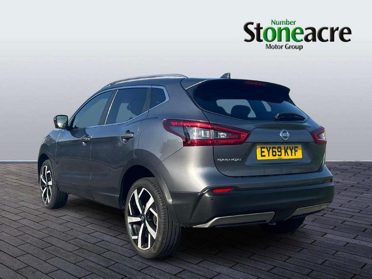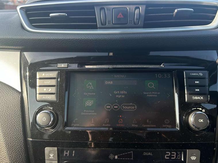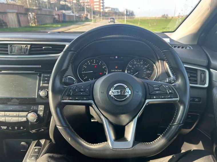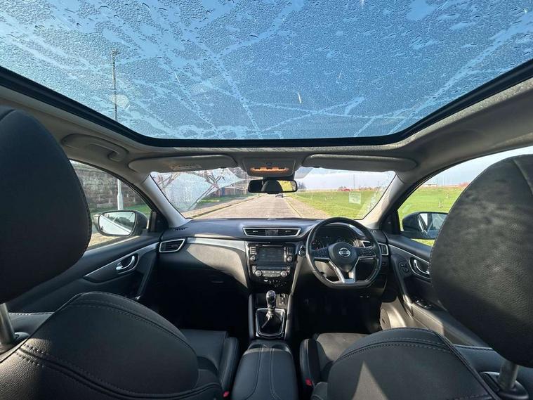 Advanced drive assist display 5'' TFT coloured screen, Android Auto, Apple CarPlay preparation, Bluetooth connectivity, Electric speed sensitive power steering, Front parking sensors, Intelligent around view monitor, Intelligent parking assist, Lane departure warning system, Nissan connect evo 7" touchscreen navigation and entertainment system, Normal or sport selectable steering, Outside temperature sensor, Push button starter, Rear parking sensors, Rear view camera, Service interval indicator, Smartphone integration, Stop/start system, Tomtom connected services, Traffic sign recognition, Trip computer, Voice control system, AM/FM radio, CD audio system, Aux-in socket, Bose premium 8 speaker system, DAB Digital radio, Steering wheel mounted audio controls, USB port, Anti dazzle rear view mirror, Auto wipers, Body colour bumpers, Body coloured door handles, Body coloured door mirrors, Chrome window surround, Daytime running lights dip function when turn signal applied, Electric folding door mirrors, Electric front and rear windows with one touch illuminated window controls, Electric front/rear windows, Electrically adjustable door mirrors, Front fog lights, Halogen headlights, Heated door mirrors, High beam assist, Intelligent auto headlights, LED indicators in door mirrors, Matt silver roof rails, One touch 4x auto windows with illuminated switches, Panoramic sunroof with one touch shade, Privacy glass, Rear roof spoiler, Rear wiper with reverse link, Shark fin antenna, Underbody vortex generators, 2 X front 12v power sockets, 3 height adjustable rear headrests, 60/40 split folding rear seat, Ambient lighting, Ambient lighting in centre console, Boot lighting, Centre console storage box/armrest, Chrome interior door handles, Configurable luggage board system, Dual zone climate control, Electrically adjustable driver seat, Front and rear door pockets with bottle holders, Front and rear seat belt pre-tensioners with load limiters, Height adjustable front headrests, Individual rear seat reading lights, ISOFIX restraints on outer rear seats x2, Leather D shaped steering wheel, Leather gear lever, Leather knee pad, Manual height adjustable front passenger seat, Manual lumbar support on driver seat, Manual lumbar support on passenger seat, Monoform front seats with plastic backboard, One touch electric shade, Parcel shelf stow function under luggage board, Part leather upholstery, Pollen filter, Rear armrest with 2 cupholders, Synthetic leather wrapped door handle with contrasting stitching, Tilt/telescopic adjustable steering wheel, Drive assist package - Qashqai, Heat package - Qashqai, LED pack - Qashqai, Safety shield plus pack - Qashqai, 6 airbags - Driver, front passenger, curtain and side airbags, ABS, ESP, EBD and brake assist, Auto hold function, Child locks on rear doors, Electronic parking brake, Front and rear seat belt warning, Front passenger airbag deactivation, Height adjustable front seatbelts, Hill start assist, Intelligent emergency braking with pedestrian recognition, Three 3 point rear seatbelts, Tyre pressure monitoring system, Anti-theft immobiliser, Intelligent Key, Remote central locking, Thatcham Cat.1 alarm, Carbon graphite dash trim, 19" alloy wheels, Tyre puncture repair kit,