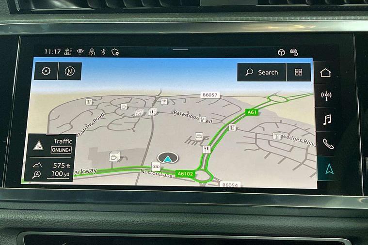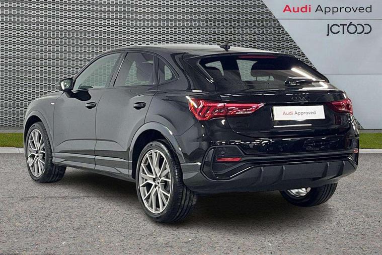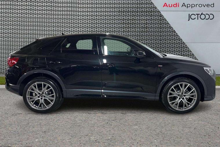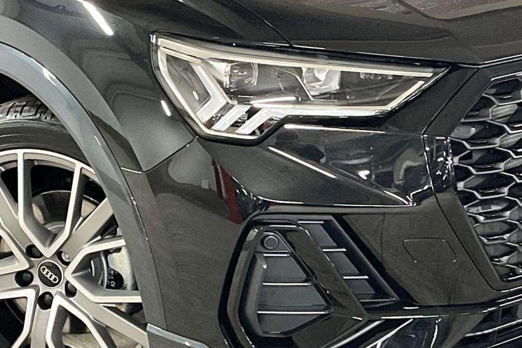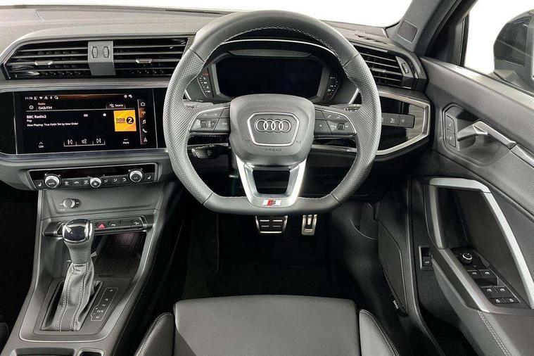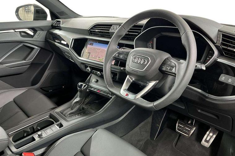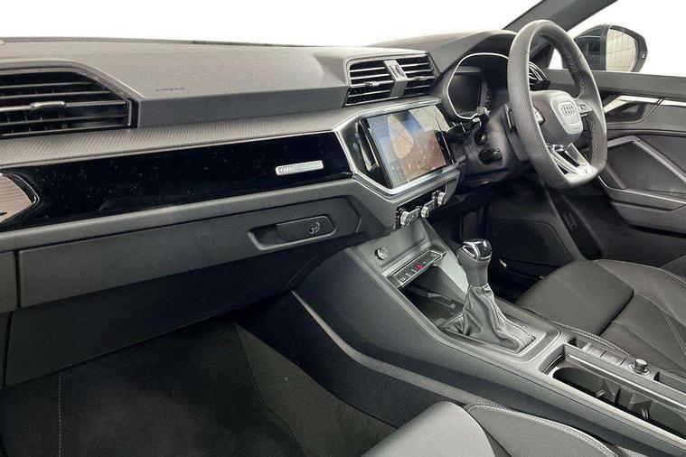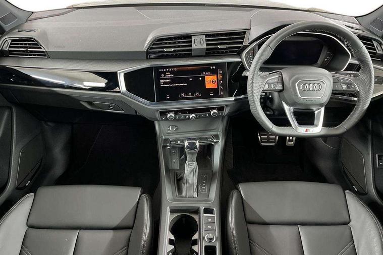 Audi connect safety and service, Audi drive select, Audi lane departure warning, Audi Virtual Cockpit - 10.25" display, Bluetooth interface, Camera based traffic sign recognition, Distraction and Fatigue warning, Legal emergency call, MMI Navigation Plus with high resolution 10.1 inch touchscreen colour display, Power operated tailgate, Progressive steering, Service interval indicator, Smartphone interface includes wireless Apple carplay/Android Auto, Start stop system with recuperation, Voice control system with natural language interaction, Sports suspension, 2 USB-C ports with charge and data functions, 6 passive loudspeakers, DAB digital radio module, Acoustic windscreen, Audi Beam uses LEDs to project the Audi logo onto the ground as you exit your Q3, Auto dimming door mirrors, Auto dimming frameless rear view mirror, Electrically folding, adjustable and heated door mirrors with integrated LED side indicators and kerb view function for passenger side, Front and rear electric windows, Front fog lights, Front underbody protection in manhattan grey paint finish, High gloss black finish B and C pillars, Honeycomb design radiator grille in matt anthracite black, LED Dynamic rear indicators, LED headlights with LED daytime running lights, LED rear lights, LED third brake light, Privacy glass dark tinted rear and rear-side windows (from B-pillar backwards), Rain and light sensors, Rear diffuser grille in grained matt black, Rear diffuser strip in matt anthracite black, Rear side wing doors, Rear underbody protection in matt black, Rear wiper, S line front and rear bumpers and side skirts in contrasting Manhattan grey paint finish, Variable front intermittent wipers, 12V socket in rear centre console, 3 seat bench in 2nd row, 40:20:40 folding with manual adjustment for 60:40 forwards/backwards position and backrest angle, Adjustable rear seat bench/backrest with centre armrest and cupholder, Black carpet mats, Black cloth headlining, Dual zone electronic climate control, Electric lumbar support, Front and rear black floor mats with contrast stitching in rock grey, Front and rear headrests, Front centre armrest, Height and reach adjustable steering wheel, Illuminated door sill trims with S logo, ISOFIX child seat mounting for front passenger with airbag deactivation and outer rear seat including top tether attachment point for outer rear seats, Luggage compartment sill protection in stainless steel, Manual front seats with height adjustment, Perforated leather gearknob, Single front passenger seat, Stainless steel pedals, Twin leather upholstery with front sport seats + S embossing, Black styling pack - Q3, Non smoking pack - Q3, 3x3 point rear seatbelts, 6 airbags - Driver, front passenger, curtain and side windows, Audi pre-sense front with pedestrain and cyclist recognition, Electrically operated child locks on rear doors, Electromechanical parking brake, Electronic stabilisation control including ABS, ASR and EDL, Front seatbelt reminder, Hill descent control, Hill hold assist, Pre sense basic, Seatbelt monitoring, Tyre pressure warning, Warning triangle and first aid kit, Anti theft wheel bolts, Immobiliser, Remote central locking, Thatcham approved category 1 anti theft alarm, Aluminium look interior elements, Detail dashboard around MMI touch colour display in glass look, black with surround in aluminium look, Leatherette door armrest, Piano black inlay,