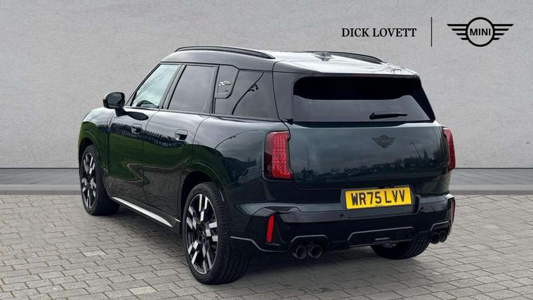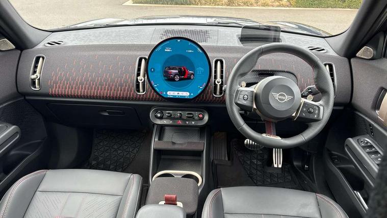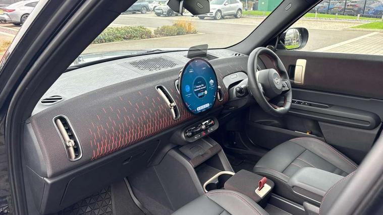 Bluetooth connection, Circular OLED Screen, Compatible mobile phone bluetooth with audio streaming, Cruise Control (DCC), Digital dashboard display, Driving assistant, Driving Assistant Plus Preparation, E-call, Electro-mechanical speed dependant steering assistance, MINI Experience Modes, MINI Head up display, Mini navigation system, MINI TeleServices, Parking assistant in camera and ultrasound based assistance system, rear view camera, parking aid and distance control, Adaptive suspension, Double clutch sports transmission, Larger capacity fuel tank, Quad exhaust system, DAB Digital radio, Harman Kardon surround sound system, Personal eSim, Auto tailgate, Electric adjustable heated door mirrors, Front and rear apron, Front and rear electric windows, Heated rear window, High beam assistant, High gloss hexagonal patterned grille surround, Interior rear-view mirror with automatic anti-dazzle function, LED daytime running lights, LED headlights with extended contents including Adaptable light signatures, LED rear lights, LED third brake light, Rain sensor with auto headlights, Rear roof spoiler with airblades, Rear side wing doors, Rear window wiper, Roof rails, 3 seat bench in 2nd row, 60/40 split rear bench seat, Anthracite headliner, Auto air conditioning, Driver and front passenger seat heating, Floor mats, Front armrest, Front headrests, Heated steering wheel, Height and length steering column adjustment, JCW Front sports seats, Lidded storage box in Black/Red knit, Luggage compartment separating net, Perforated Vescin steering wheel, Rear headrests, Seat adjustment for rear seats, Single front passenger seat, Sunvisors with vanity mirrors, Wireless charging tray, Interior and exterior mirror package - Mini Countryman, 3x3 point rear seat belts, 6 Airbags - front, side, head and seat belt tensioners, ABS, DSC - Dynamic Stability Control, Electronic handbrake, Electronic Stability Programme (ESP), Front ISOFIX (iSize), Hill descent control, Hill hold assist, Hill start assist, JCW logo in brake calipers, JCW Sport brakes with Chilli Red calipers, Manual rear child locks, Traction control, Tyre pressure monitoring system, Warning triangle, Alarm system with tilt sensor, monitoring doors, bonnet interior and tailgate, Auto drive away locking, Comfort access system, Deadlocking function, Electronic vehicle immobiliser, Locking wheel bolts, Remote control locking, Start/stop toggle with keyless go, 19" JCW Runway Spoke Black alloy wheels, Tyre repair kit plus,
