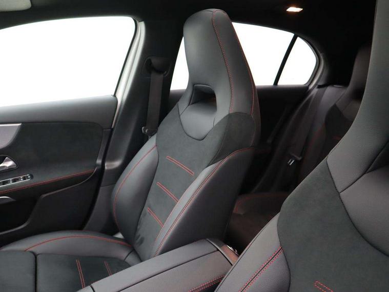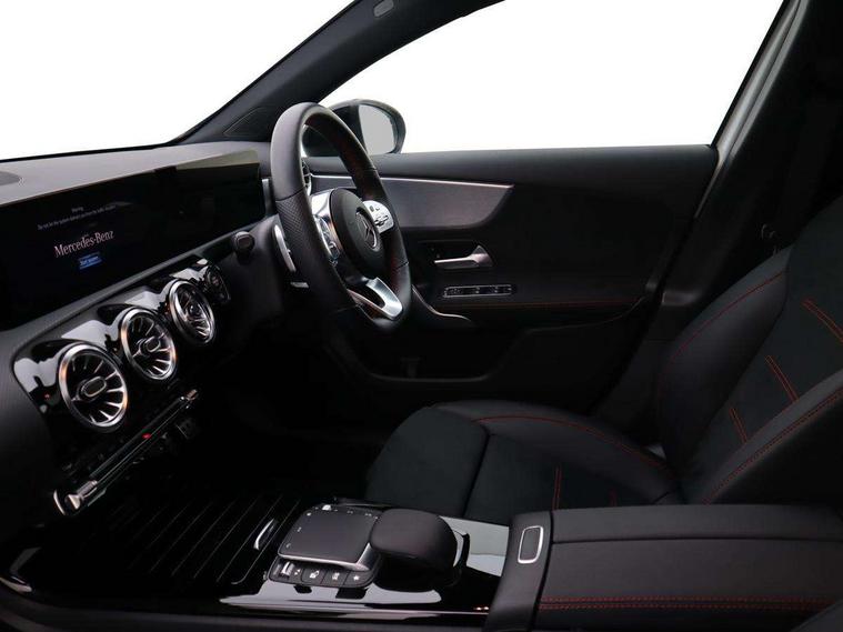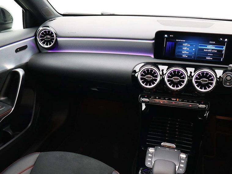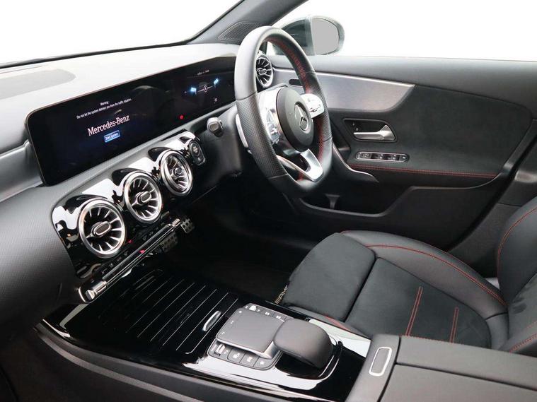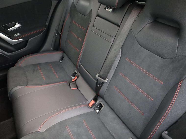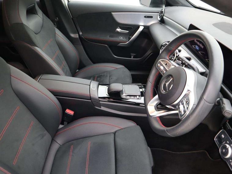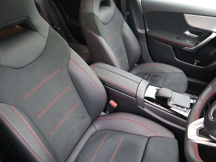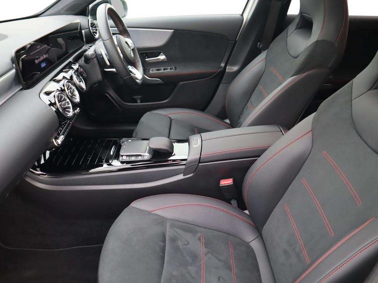 10.25" Digital instrument cluster display screen, 10.25" media display, 180 degree rear view camera with parking guidelines, Active parking assist with visual and audible warning of detected obstacles, Attention assist, Brake pad wear indicator warning light, Car wash mode, Cruise control + speed limiter, Direct steering, Dual bluetooth interfaces, DYNAMIC SELECT with a choice of driving modes (ECO, Comfort, Sport and Individual), ECO start/stop function, Fluid level warning indicator for fuel, oil, coolant and washer fluid, Hard-disk navigation, Hey Mercedes Voice activation, Lamp failure indicator, Lane keeping system, Mercedes me connect including emergency call system, accident recovery, breakdown and maintenance management, Mercedes me remote services, Outside temperature gauge, Owners manual in English, Pre-installation for private car sharing, Preinstallation for Mercedes Benz link, Service indicator (ASSYST), Smartphone integration with Apple CarPlay and Android auto, Speed limit assist, Speed sensitive power steering, Traffic sign assist, Trip computer, Ultrasonic sensors positioned in the front and rear bumpers, Lowered comfort suspension, Rear axle torsion beam, 2 USB ports (type C) in rear stowage compartment and one in front of center console, 6 speakers, DAB Digital radio, MBUX multimedia system with DAB digital radio and touchpad including satellite navigation, Mercedes-Benz sound system - 100W, 4 Electric Front and Rear windows, Adaptive brake lights, AMG bodystyling - Front apron with splitter in chrome, rear apron with chrome trim and chrome visible trim elements in tailpipe, Automatic headlights, Black weather strip, Body colour bumpers, Body colour door handles with chrome inserts, Body colour side skirt, Electric adjustable and heated door mirrors with integrated LED side indicators, Exclusive diamond radiator grille, Exhaust system - Twin visible tailpipes in polished stainless steel, Headlamp assist automatic headlamp activation, Heated glass rear windscreen + timer control, LED daytime running lights, LED High level third brake light, LED tail lamp, Multibeam LED headlights with adaptive highbeam assist plus, Panoramic sliding sunroof, Privacy glass, Radio aerial, Rain sensing windscreen wipers with two sensitivity settings, Rear fog lights, Rear side wing doors, Rear wiper, 3 seat bench in 2nd row, 3 Spoke flat bottom leather multi function steering wheel with perforated leather in grip area, 40:20:40 split folding rear seats, Artico man-made leather/Microfibre Dinamica upholstery with red contrast stitching, Auto Mercedes-Benz child seat recognition sensor, Black air vents with surround in silver chrome, Black roof lining, Brushed stainless steel sports pedals with rubber studs, Controller on centre console with chrome surround, Floor mats with AMG lettering, Front centre armrest with storage compartment, Front seat backs luggage nets, Galvanished gear shift paddles on steering wheel, Heated front seats, Height/reach adjustable steering column, Illuminated Mercedes Benz lettering front door sills with changeable cover, Interior lighting - 64 colour Ambient lighting, Interior mirror with reading lamps in black and frameless, Rear armrest with 2 cupholders, Rear head restraints, Seat occupancy sensor for front passenger seat, Single front passenger seat, Sports seats with integrated headrests, Stowage compartment in centre console with retractable cover, Sunvisors with illuminated vanity mirrors, Touchpad on center console, Twin front cupholders, Two zone thermotronic luxury automatic climate control, Light and sight pack - A Class, Mirror package - A Class, Night pack - A Class Saloon/Hatchback, Seat comfort pack - A Class, 3 rear 3 point seatbelts, ABS with Brake Assist, Active bonnet, Active brake assist includes forward collision warning system with autonomous braking, Adaptive brake assist with hold function and hill start assist, Black seatbelts, Childproof locks manually operated for rear doors and electrically operated for rear power windows, Crash responsive emergency lighting, Driver and passenger head and side airbags, Drivers knee airbag, Dual stage driver/passenger airbags, Electronic parking brake, ESP curve dynamic assist, ESP with ASR, Front and rear seatbelt reminder, Front brake callipers with Mercedes Benz lettering, ISOFIX and top tether child seat fixing points in two outer rear seats, Tyre pressure monitoring system, Warning triangle and first aid kit, Window airbags, Alarm system/interior protection/immobiliser, Keyless entry lock/unlock, Keyless Go, Remote central locking and crash sensor with emergency opening function, Urban guard vehicle protection system with immobiliser and interior protection, Matrix look light longitudinal grain aluminium trim element, 19" multi spoke light alloy wheels painted in black with a high sheen rim flange, Summer tyres, Tirefit sealant kit,