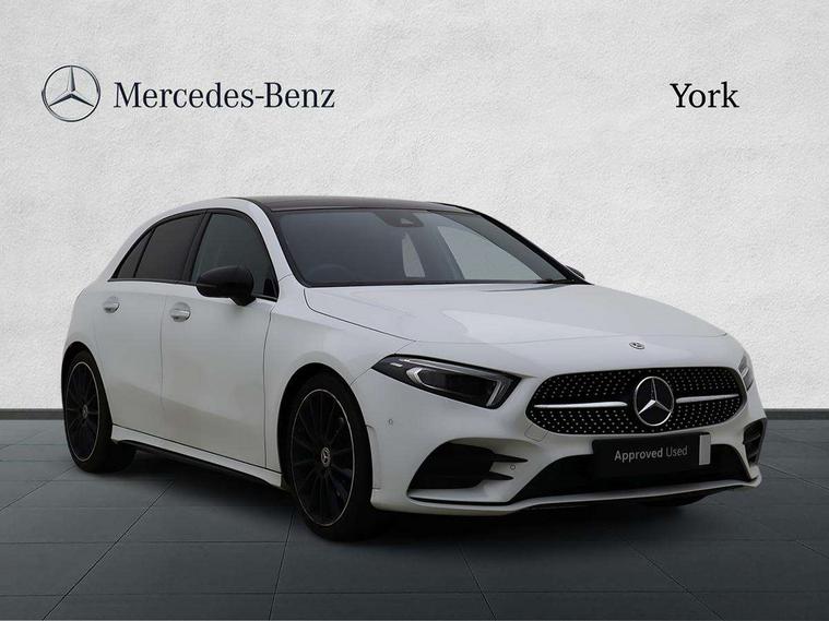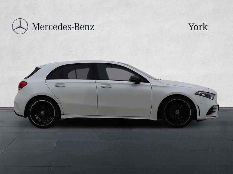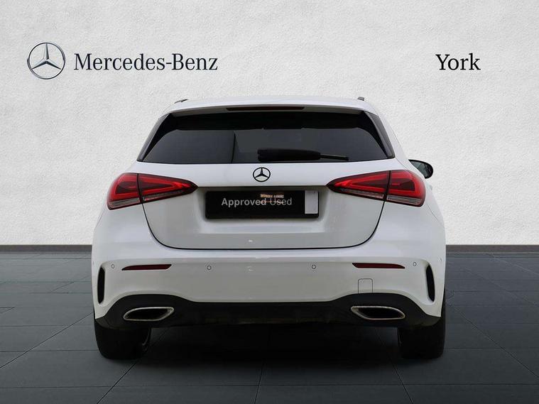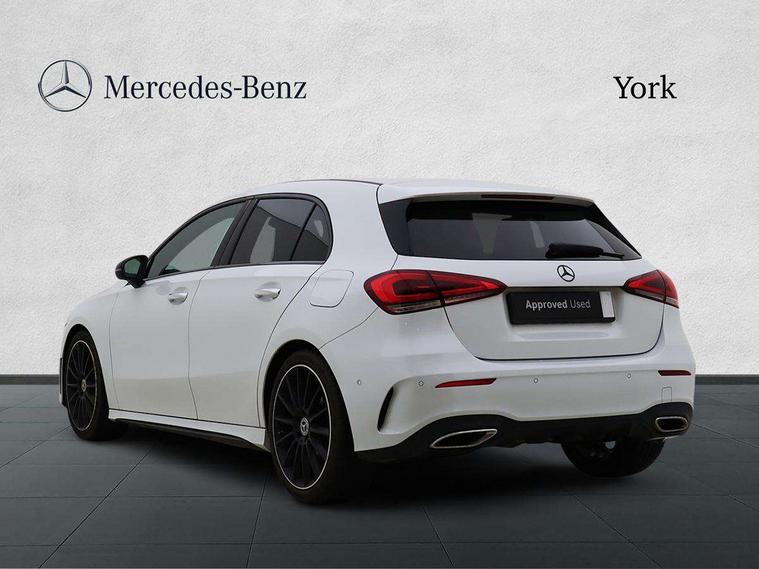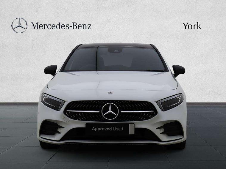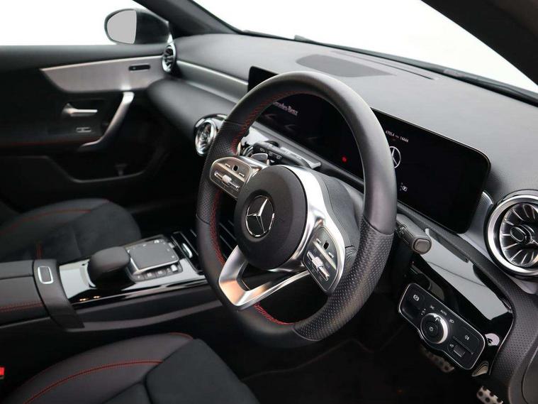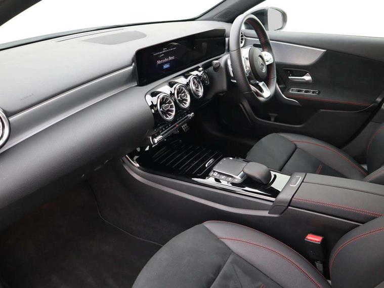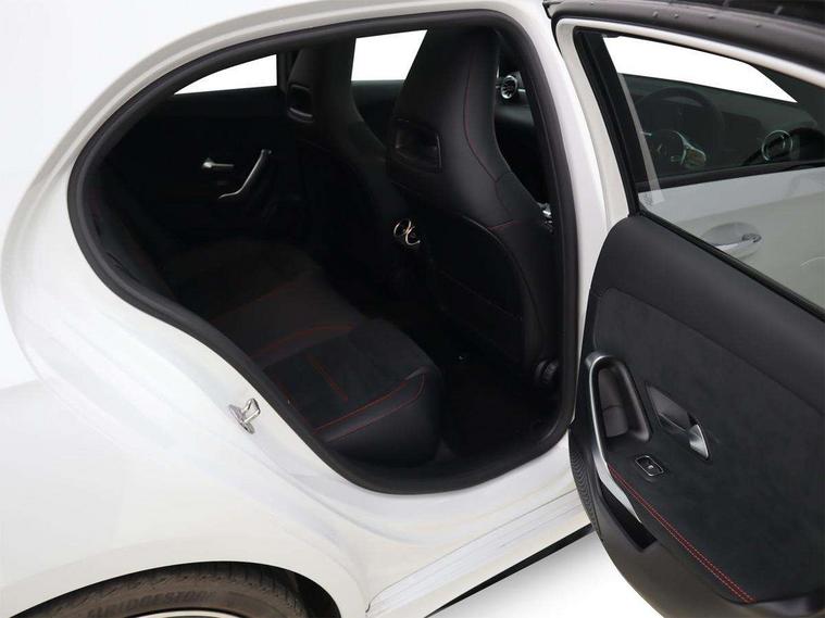 10.25" Digital instrument cluster display screen, 10.25" media display, 180 degree rear view camera with parking guidelines, Active parking assist with visual and audible warning of detected obstacles, Attention assist, Brake pad wear indicator warning light, Car wash mode, Cruise control + speed limiter, Direct steering, Dual bluetooth interfaces, DYNAMIC SELECT with a choice of driving modes (ECO, Comfort, Sport and Individual), ECO start/stop function, Fluid level warning indicator for fuel, oil, coolant and washer fluid, Hard-disk navigation, Hey Mercedes Voice activation, Lamp failure indicator, Lane keeping system, Mercedes me connect including emergency call system, accident recovery, breakdown and maintenance management, Mercedes me remote services, Outside temperature gauge, Owners manual in English, Pre-installation for private car sharing, Preinstallation for Mercedes Benz link, Service indicator (ASSYST), Smartphone integration with Apple CarPlay and Android auto, Speed limit assist, Speed sensitive power steering, Traffic sign assist, Trip computer, Ultrasonic sensors positioned in the front and rear bumpers, Lowered comfort suspension, Rear axle torsion beam, 2 USB ports (type C) in rear stowage compartment and one in front of center console, 6 speakers, DAB Digital radio, MBUX multimedia system with DAB digital radio and touchpad including satellite navigation, Mercedes-Benz sound system - 100W, 4 Electric Front and Rear windows, Adaptive brake lights, AMG bodystyling - Front apron with splitter in chrome, rear apron with chrome trim and chrome visible trim elements in tailpipe, Automatic headlights, Black weather strip, Body colour bumpers, Body colour door handles with chrome inserts, Body colour side skirt, Electric adjustable and heated door mirrors with integrated LED side indicators, Exclusive diamond radiator grille, Exhaust system - Twin visible tailpipes in polished stainless steel, Headlamp assist automatic headlamp activation, Heated glass rear windscreen + timer control, LED daytime running lights, LED High level third brake light, LED tail lamp, Multibeam LED headlights with adaptive highbeam assist plus, Panoramic sliding sunroof, Privacy glass, Radio aerial, Rain sensing windscreen wipers with two sensitivity settings, Rear fog lights, Rear side wing doors, Rear wiper, 3 seat bench in 2nd row, 3 Spoke flat bottom leather multi function steering wheel with perforated leather in grip area, 40:20:40 split folding rear seats, Artico man-made leather/Microfibre Dinamica upholstery with red contrast stitching, Auto Mercedes-Benz child seat recognition sensor, Black air vents with surround in silver chrome, Black roof lining, Brushed stainless steel sports pedals with rubber studs, Controller on centre console with chrome surround, Floor mats with AMG lettering, Front centre armrest with storage compartment, Front seat backs luggage nets, Galvanished gear shift paddles on steering wheel, Heated front seats, Height/reach adjustable steering column, Illuminated Mercedes Benz lettering front door sills with changeable cover, Interior lighting - 64 colour Ambient lighting, Interior mirror with reading lamps in black and frameless, Rear armrest with 2 cupholders, Rear head restraints, Seat occupancy sensor for front passenger seat, Single front passenger seat, Sports seats with integrated headrests, Stowage compartment in centre console with retractable cover, Sunvisors with illuminated vanity mirrors, Touchpad on center console, Twin front cupholders, Two zone thermotronic luxury automatic climate control, Light and sight pack - A Class, Mirror package - A Class, Night pack - A Class Saloon/Hatchback, Seat comfort pack - A Class, 3 rear 3 point seatbelts, ABS with Brake Assist, Active bonnet, Active brake assist includes forward collision warning system with autonomous braking, Adaptive brake assist with hold function and hill start assist, Black seatbelts, Childproof locks manually operated for rear doors and electrically operated for rear power windows, Crash responsive emergency lighting, Driver and passenger head and side airbags, Drivers knee airbag, Dual stage driver/passenger airbags, Electronic parking brake, ESP curve dynamic assist, ESP with ASR, Front and rear seatbelt reminder, Front brake callipers with Mercedes Benz lettering, ISOFIX and top tether child seat fixing points in two outer rear seats, Tyre pressure monitoring system, Warning triangle and first aid kit, Window airbags, Alarm system/interior protection/immobiliser, Keyless entry lock/unlock, Keyless Go, Remote central locking and crash sensor with emergency opening function, Urban guard vehicle protection system with immobiliser and interior protection, Matrix look light longitudinal grain aluminium trim element, 19" multi spoke light alloy wheels painted in black with a high sheen rim flange, Summer tyres, Tirefit sealant kit,