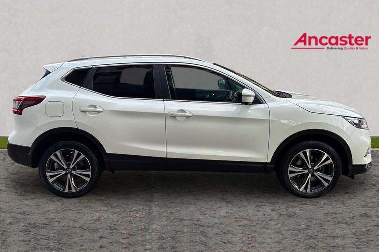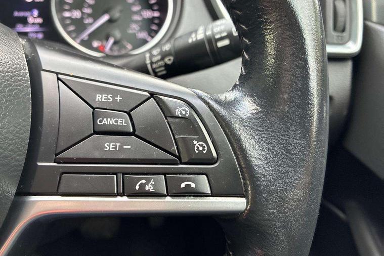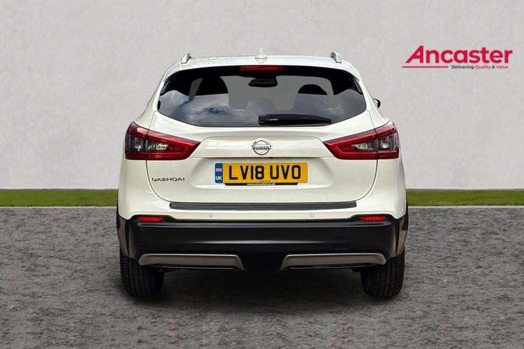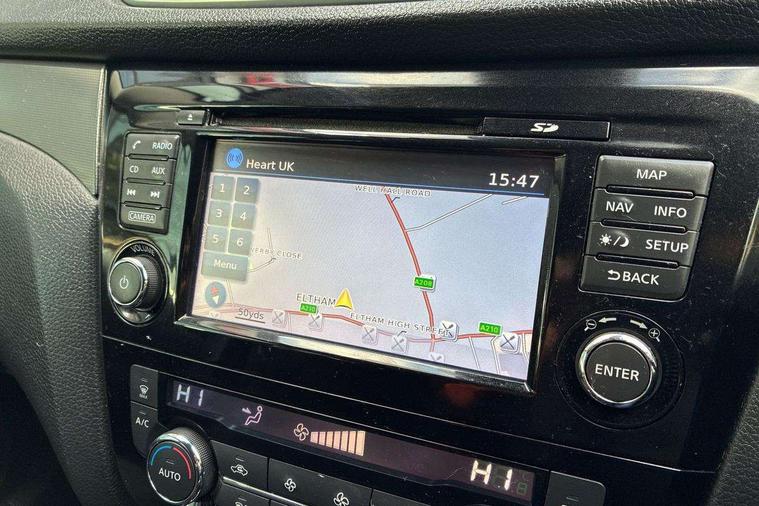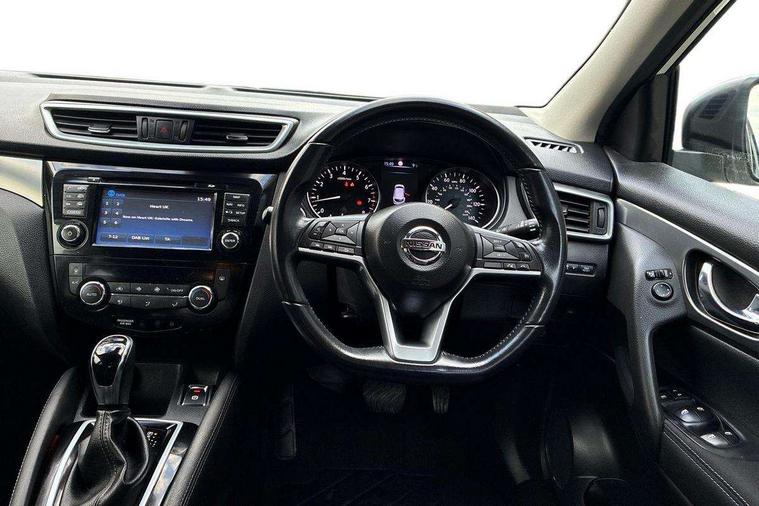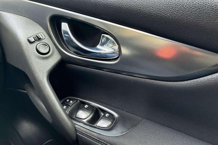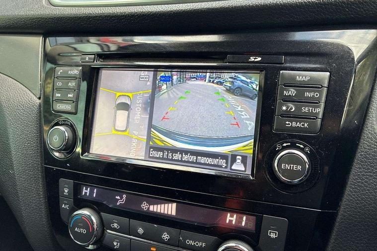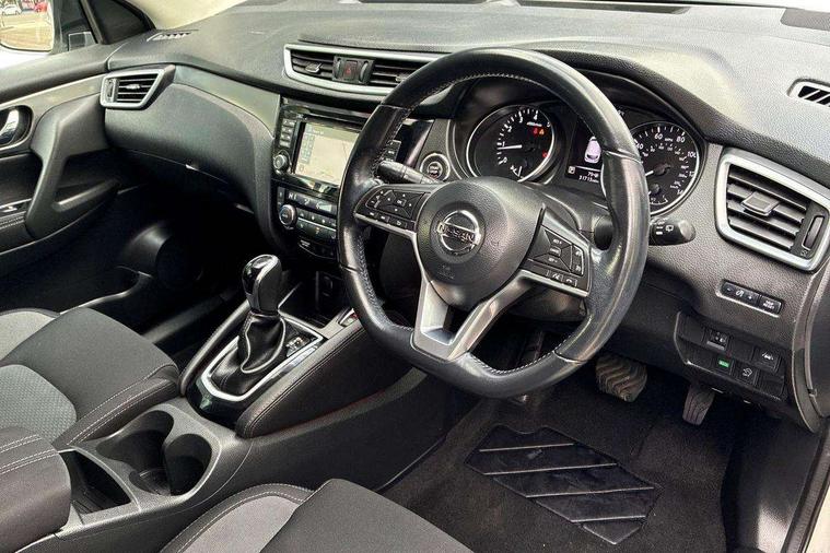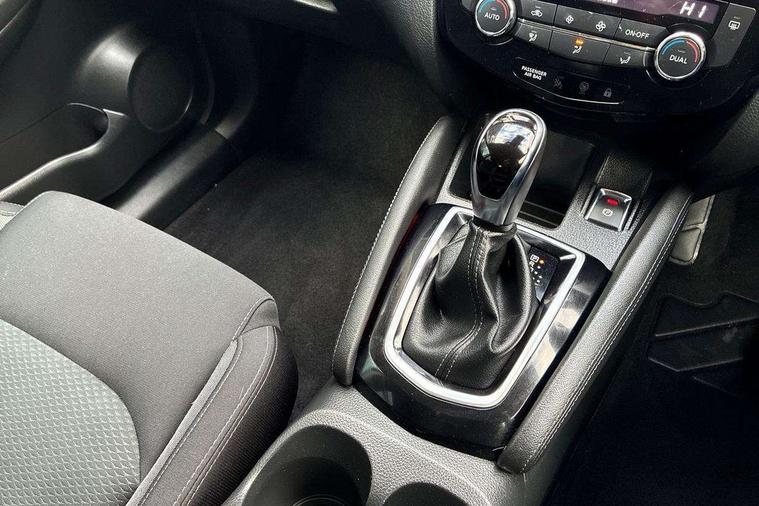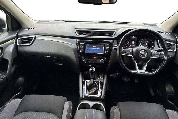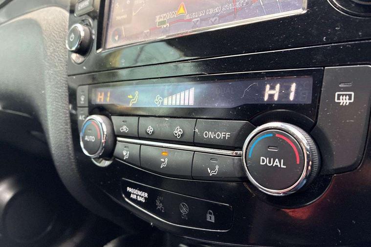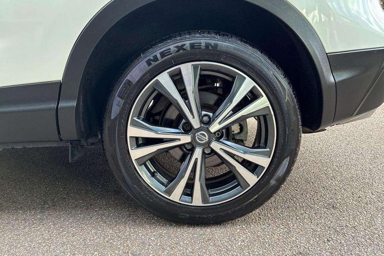 Piano black interior trim, 18" Bi-colour alloy wheels, Tyre puncture repair kit, Alarm, Immobiliser, Intelligent Key, Remote central locking, 'Shark fin' mobile antenna, 6 speakers, DAB Digital radio, Radio/CD, Smartphone apps, Steering wheel mounted audio controls, USB/aux input socket, ABS, brake assist and EBD, Child locks on rear doors, Curtain airbags, Driver/front passenger airbag, Electronic parking brake, ESP + traction control, Forward emergency braking, Front passenger airbag deactivation, Height adjustable front seatbelts, Hill start assist, Seatbelt warning, Side airbags, Three 3 point rear seatbelts, Tyre pressure monitoring system, Automatic headlamp activation, Body colour bumpers, Body colour door handles, Body colour door mirrors, Chrome window surround, Electric folding and heated door mirrors, Front fog lights, High beam assist, Interior mirror with auto anti dazzle, LED indicators in door mirrors, Matt silver roof rails, One touch electric front/rear windows, Privacy glass, Rain sensor windscreen wipers, Rear roof spoiler, Rear wiper, 2 X front 12v power sockets, 60/40 split folding rear seat, Ambient interior lighting, Centre console with armrest, Chrome interior door handles, Cloth upholstery, Configurable luggage board system, Driver + front passenger lumbar support, Dual zone climate control, Front and rear door pockets with bottle holders, Front headrests, Front seat belt pre-tensioners with load limiters, Height adjustable driver's seat, Height adjustable passenger seat, Illuminated electric window switch, Isofix child seat preparation, Leather gearknob, Leather interior door handles, Leather knee rest, Leather steering wheel, Luggage compartment lighting, Parcel shelf, Pollen filter, Rake/reach adjustable steering wheel, Rear armrest with 2 cupholders, Rear headrests, 5" TFT driver information centre, Around View Monitor, Bluetooth phone integration system, Cruise control, Electric speed sensitive power steering, Front and rear parking sensors, Lane departure warning system, Nissan connect sat nav system, Outside temperature display, Push button starter, Rear view camera, Service interval indicator, Speed limiter, Traffic sign recognition, Trip computer,