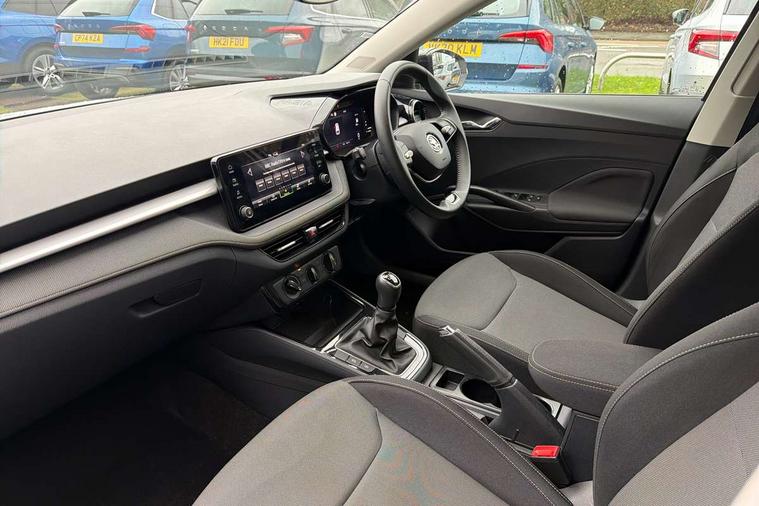 Advanced driver attention and drowsiness monitor, Bluetooth connection, Electromechanical power steering, Exterior temperature gauge, Service interval indicator, Traffic sign recognition, Virtual cockpit with 10.25" colour display, Wireless SmartLink for Apple CarPlay and Android Auto, 6 Speakers (4 in front and 2 in rear), Auxiliary socket for external MP3 player, DAB digital radio reception, Body coloured bumpers, Dimming rear view mirror with black frame, Door mirror integrated indicators, Front and rear electric windows, Front window wiper intermittent control, Headlight range control - Automatic, Ice scraper in fuel cap, LED daytime running lights with coming and leaving home feature, LED rear lights, Privacy glass, Rear LED fog light, Rear side wing doors, Rear window wiper with washing nozzles, Roof mounted spoiler, SKODA tailgate lettering in chrome, Third brake light, 2 reading lights in front and 2 reading lights in rear, 3 rear headrests, Backrest split and folding, Central console with removable cup holder and storage box, Chrome handbrake release button, Fabric upholstery, Front centre armrest, Gearshift knob/handle in leather, Grain satin black interior door handles, Hand brake lever handle in leather, Height adjustable front headrests, Height adjustable front seats, Height adjustable steering wheel, ISOFIX and TopTether anchorage points to the outer rear seats, ISOFIX and TopTether on the front passenger seat, Luggage compartment lighting, Manually adjustable lumbar support in front seats, Pollen filter, Rear seat bench unsplit, Single front passenger seat, Storm grey headlining, Sun visors with mirror and airbag label on passenger side, Textile floor mats, Ticket holder, Umbrella in drivers door, 3-point height adjustable front seats belts with pretensioner and force limiter, Automatic warning lights in case of crash, Driver and passengers airbag with switch off function, e-Call+, ESC including ABS, MSR, ASR, EDS, HBA and XDS, Front and rear seat belt warning, FRONT ASSIST (AEB City and AEB Inter Urban), Front side airbags, Head airbags, One tone horn, Pedestrian protection, Three rear 3-points safety seat belts with pretensioner and force limiter including stop function for outer rear seat belts, Tyre pressure monitoring system, Anti-theft alarm system including immobiliser, interior monitoring, backup horn, and towing protection, Central locking with radio remote control, interior controls, SAFE function and 2 foldable keys, Colour Edition air vents, Grain satin black central console cover, Metallic grey upper decorative trim, Satin black door and side trim panel in front, Textile Kota grey lower decorative inserts, Anti-theft wheel bolts protection, Super-low rolling resistance tyres,