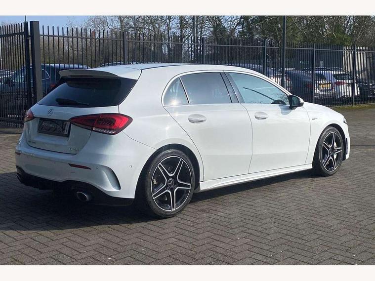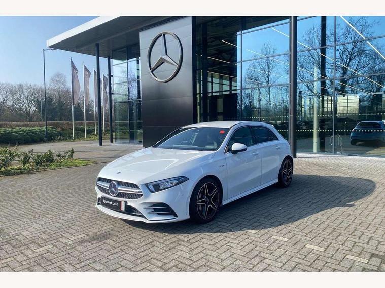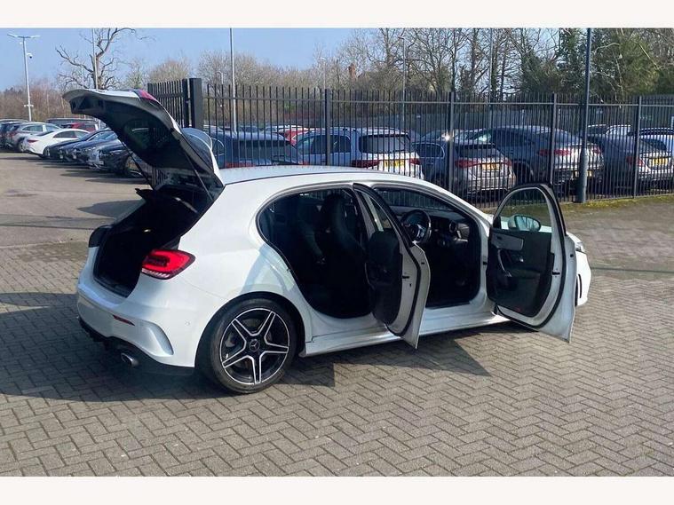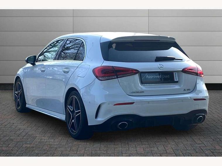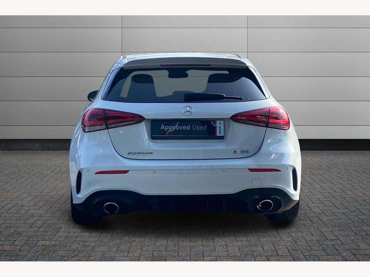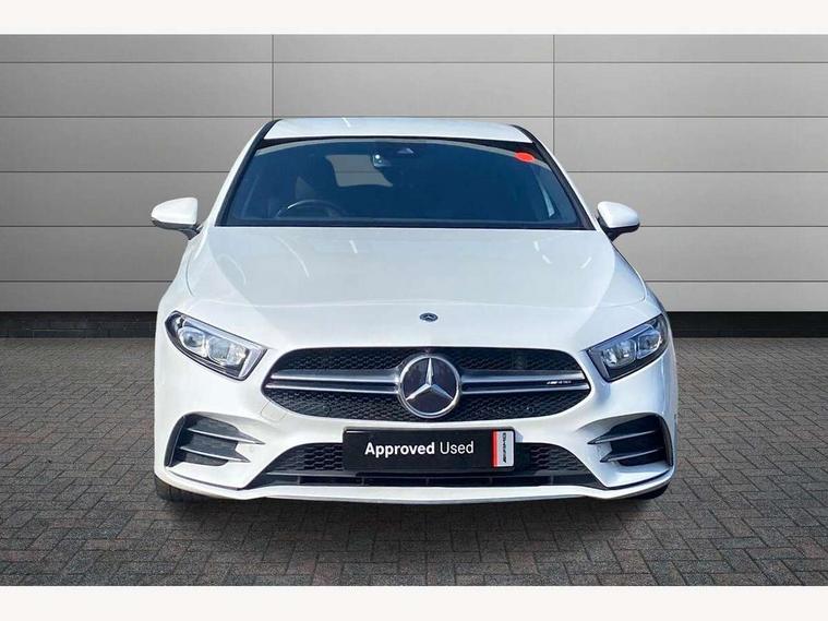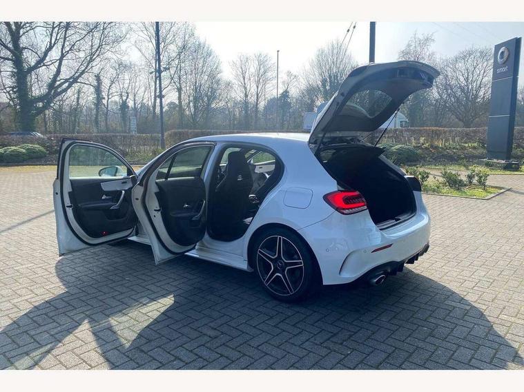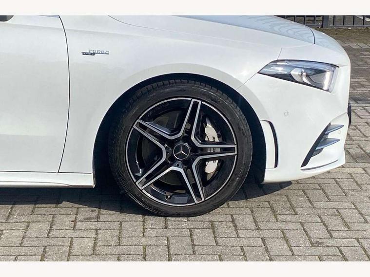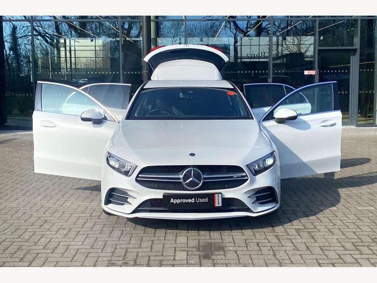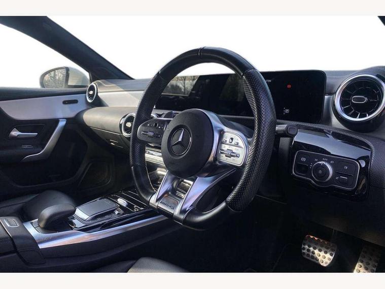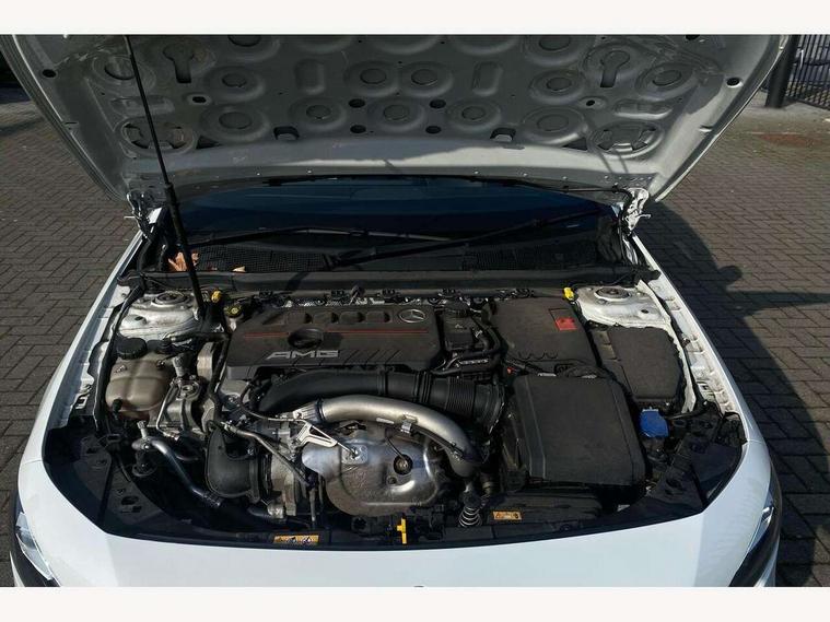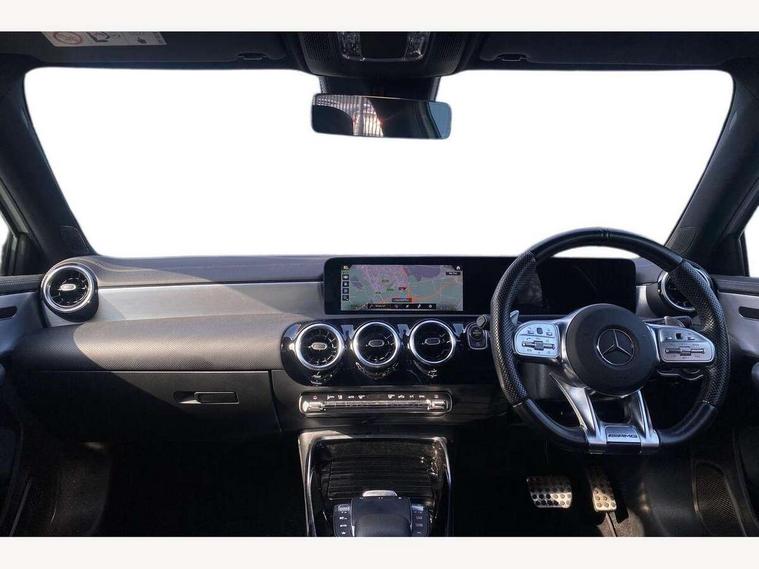 10.25" media display, 180 degree rear view camera with parking guidelines, 7" colour screen in instrument panel, Active parking assist with visual and audible warning of detected obstacles, Attention assist, Brake pad wear indicator warning light, Car wash mode, Cruise control + speed limiter, Direct steering, Dual bluetooth interfaces, DYNAMIC SELECT with driving programs (Slippery, Comfort, Sport, Sport+ and Individual), ECO start/stop function, Fluid level warning indicator for fuel, oil, coolant and washer fluid, Hard-disk navigation, Hey Mercedes Voice activation, Lamp failure indicator, Mercedes me connect including emergency call system, accident recovery, breakdown and maintenance management, Mercedes me remote services, Outside temperature gauge, Owners manual in English, Pre-installation for private car sharing, Preinstallation for Mercedes Benz link, Service indicator (ASSYST), Smartphone integration with Apple CarPlay and Android auto, Speed sensitive power steering, Trip computer, Ultrasonic sensors positioned in the front and rear bumpers, Wireless charging, AMG performance suspension, Rear axle multi-link, 2 USB ports (type C) in rear stowage compartment and one in front of center console, 6 speakers, DAB Digital radio, MBUX multimedia system with DAB digital radio and touchpad including satellite navigation, Mercedes-Benz sound system - 100W, 4 Electric Front and Rear windows, Adaptive brake lights, AMG bodystyling - Front apron with splitter in chrome, rear apron with chrome trim and chrome visible trim elements in tailpipe, AMG Front apron with flics as air deflector elements on the outer air intakes, AMG radiator grille with twin blade lamella and AMG Lettering, AMG Rear apron with specific diffuser look with four vertical fins and two round chrome plated tailpipe trim elements with a diameter of 90 mm, AMG spoiler lip on roof, AMG Sports exhaust system with two round tailpipes measuring 90 mm in diameter attached in rear apron, AMG lettering plus ribbing on the inside of the, Black weather strip, Body colour bumpers, Body colour door handles, Body colour side skirt, Body coloured door mirrors, Chrome beltline trim, Electric adjustable and heated door mirrors with integrated LED side indicators, Front wings wheel arches with TURBO 4MATIC lettering, Headlamp assist automatic headlamp activation, Heated glass rear windscreen + timer control, LED high performance headlamps with integrated LED daytime running lights, LED tail lamp, LED third brake light, Privacy glass, Radio aerial, Rain sensing windscreen wipers with two sensitivity settings, Rear fog lights, Rear wiper, Trim elements on louvres in outer air inlets in silver chrome, Wider wheel arches for AMG wheels, Window line trim strip in chrome, 40:20:40 split folding rear seats, AMG Performance steering wheel in nappa leather, Auto Mercedes-Benz child seat recognition sensor, Black air vents with surround in silver chrome, Black roof lining, Brushed stainless steel sports pedals with rubber studs, Controller on centre console with chrome surround, Floor mats with stitched edging and AMG lettering, Front centre armrest with storage compartment, Front door sills with Mercedes Benz lettering, Front seat backs luggage nets, Front seat cushion length adjustment, Heated front seats, Height/reach adjustable steering column, Interior mirror with reading lamps in black and frameless, Manual height adjustable front seats, Rear head restraints, Seat occupancy sensor for front passenger seat, Silver coloured aluminium gear shift paddles on steering wheel, Sports seats with integrated headrests, Stowage compartment in centre console with retractable cover, Sunvisors with illuminated vanity mirrors, Touchpad on center console, Twin front cupholders, Two zone thermotronic luxury automatic climate control, Light and sight pack - A Class, Mirror package - A Class, Seat comfort pack - A Class, 3 rear 3 point seatbelts, ABS with Brake Assist, Active bonnet, Active brake assist includes forward collision warning system with autonomous braking, Adaptive brake assist with hold function and hill start assist, Black seatbelts, Childproof locks manually operated for rear doors and electrically operated for rear power windows, Crash responsive emergency lighting, Driver and passenger head and side airbags, Drivers knee airbag, Dual stage driver/passenger airbags, Electronic parking brake, ESP curve dynamic assist, ESP with ASR, Front and rear seatbelt reminder, Front brake calipers with AMG lettering, ISOFIX and top tether child seat fixing points in two outer rear seats, Perforated front brake discs, Tyre pressure monitoring system, Warning triangle and first aid kit, Window airbags, Alarm system/interior protection/immobiliser, Keyless Go, Remote central locking and crash sensor with emergency opening function, Urban guard vehicle protection system with immobiliser and interior protection, Light aluminium with longitudinal grain interior trim, 18" AMG 5 twin spoke design bicolour alloy wheels, Summer tyres, Tirefit sealant kit,
