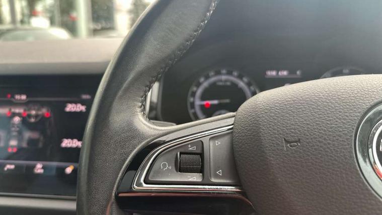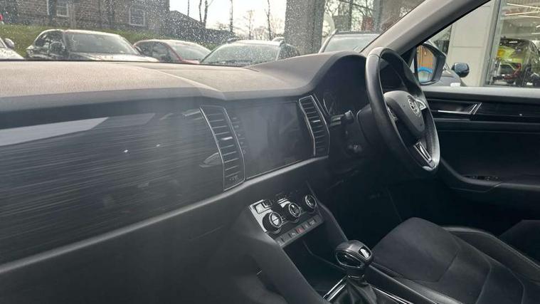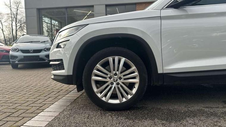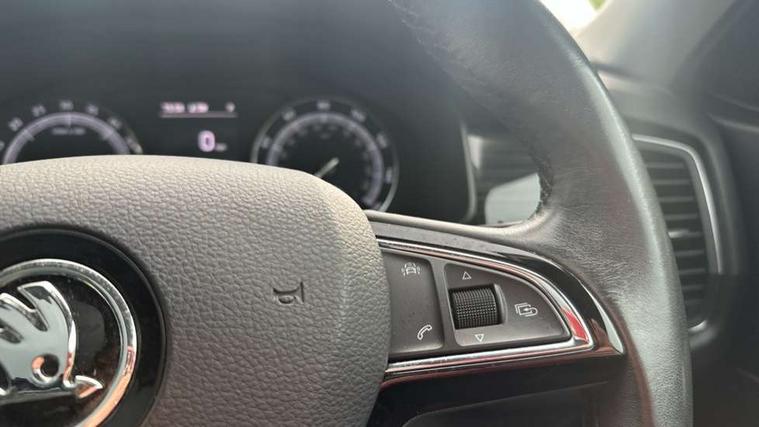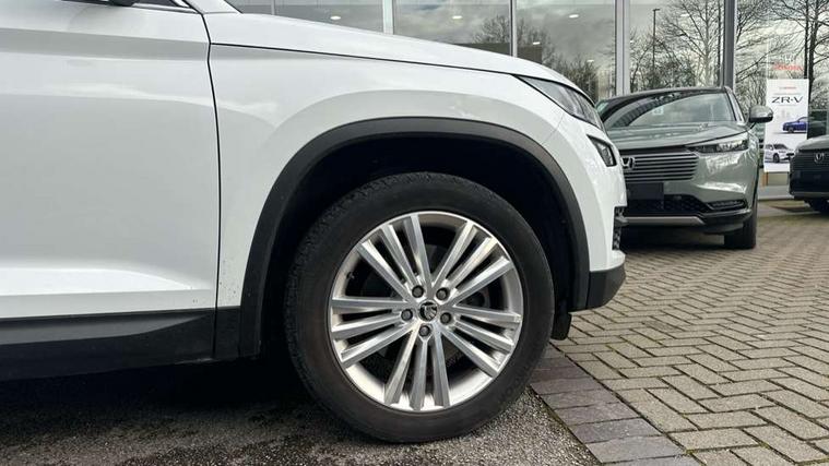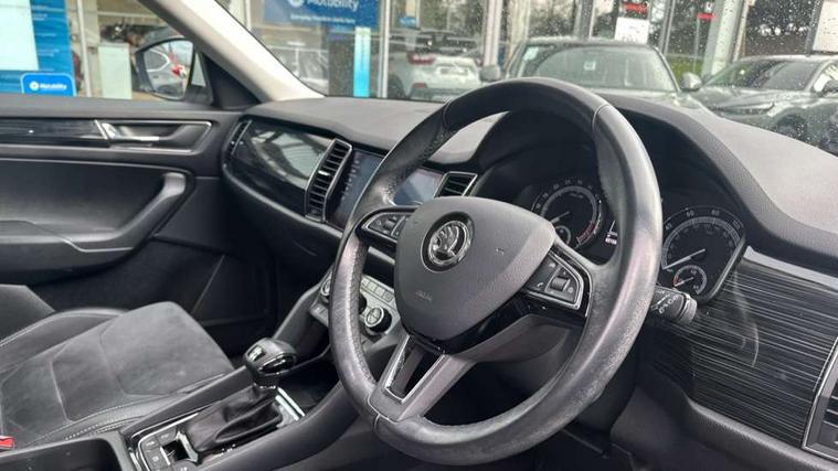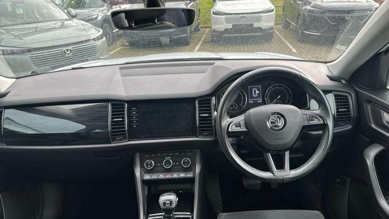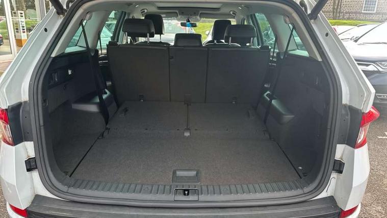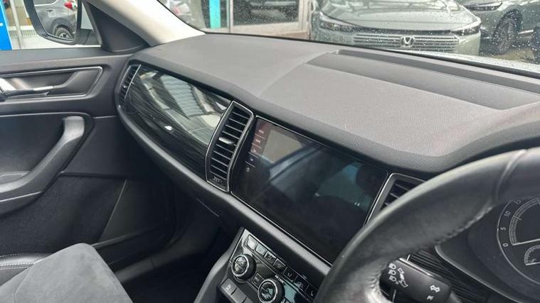 Bluetooth system, Columbus satellite navigation with 9.2" touch screen and integrated Wi-Fi, Drive mode selector, Exterior temperature gauge, Power tailgate, SmartLink, Speed limiter, Bolero Radio, DAB Digital radio, DVD System, SD card slot, USB connection, Adaptive front lighting system, Aero wiper + intermittent function, Auto dimming door mirrors, Auto dimming rear view mirror, Automatic activation of hazard warning lights, Body colour bumpers, Body colour door mirrors and handles, Electric adjustable/heated/folding door mirrors, Electric front windows, Electric rear windows, Front and Rear door steps, Headlight washers, Heated rear window, High gloss black grille with chrome inserts, LED daytime running lights, LED front fog lights with static cornering light function, LED Headlights, Light assistant (coming home/tunnel light), Rain and light sensors, Rear spoiler, Rear wiper, Sunset privacy glass, Tinted windows, 12V Accessory socket in centre console, 12V power point in luggage area, 3 rear height adjustable headrests, 4 lashing points on luggage floor, 60/40 split fold rear seat back, Boot storage compartments, Centre console with storage/cupholders, Chrome gear shift lever, Chrome inner door handles, Driver + front passenger lumbar support, Driver's glovebox with lid, Driver's storage box, Folding grab handles with rear coat hooks, Front and rear bottle holders, Front centre armrest with storage compartment, Front/rear courtesy lights, Height adjustable front seats, Height/tilt adjustable front headrests, Illuminated air conditioned glovebox, Illuminated luggage compartment, Isofix system on outer rear seats, Luggage compartment cover, Luggage nets in boot, Manually adjustable steering column, Passenger side net compartment on centre console, Pollen filter, Rear centre armrest with cupholders, Removable LED light in boot, Storage compartment under front seats, Sunglasses storage, Sunvisors with illuminated vanity mirrors, Ticket holder, Chrome pack - Kodiaq, 3 point front/outer rear seatbelts+pre-tensioners, ABS + EDL + ASR + MSR + ESC, Automatic unlocking of doors in case of impact, Driver and passenger airbags, Drivers knee airbag, Electromechanical parking brake, Front assist including city emergency braking, Front side airbags, Fuel cut off safety device, Head airbags, Hill hold control, Hydraulic Brake Assist (HBA), Passenger airbag deactivate switch, Seatbelt warning, Two tone horn, Tyre pressure monitor, Alarm with interior monitoring and tilt sensor, Anti-theft wheel bolts, Immobiliser, Keyless entry and keyless start, Remote central locking,