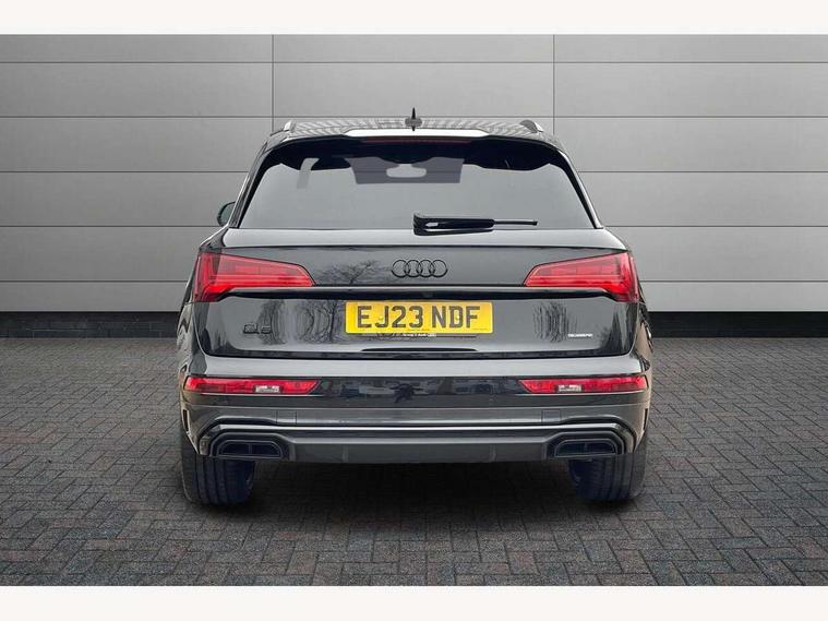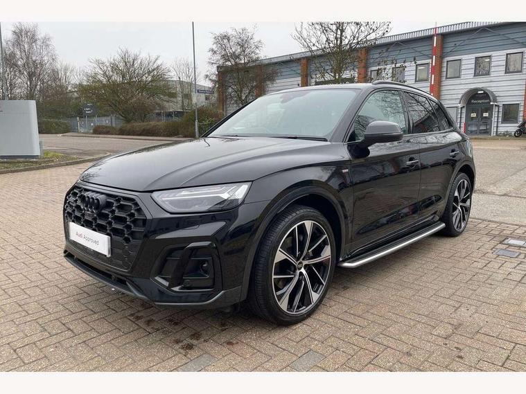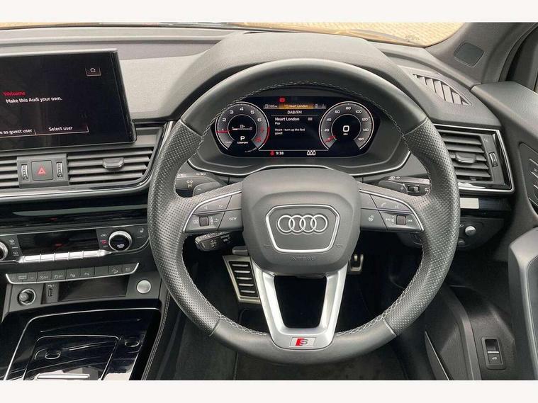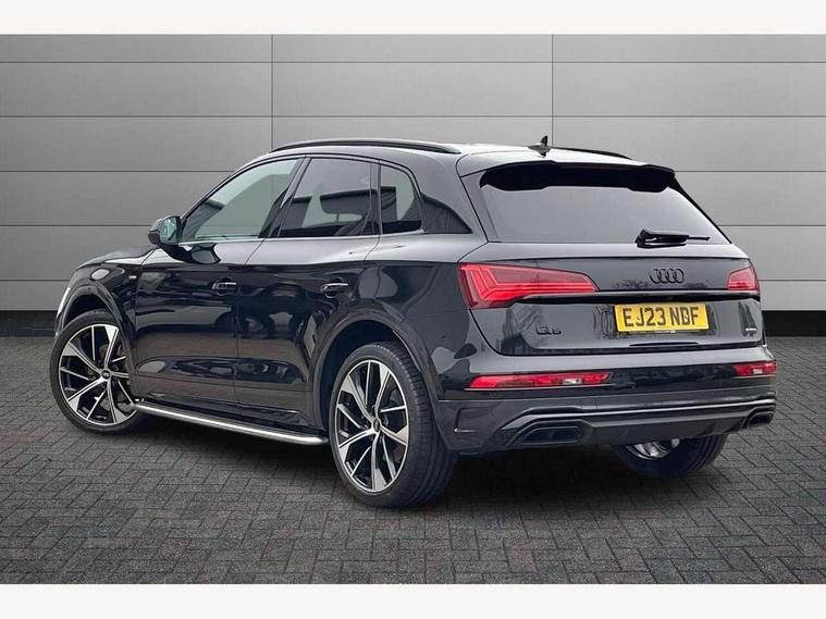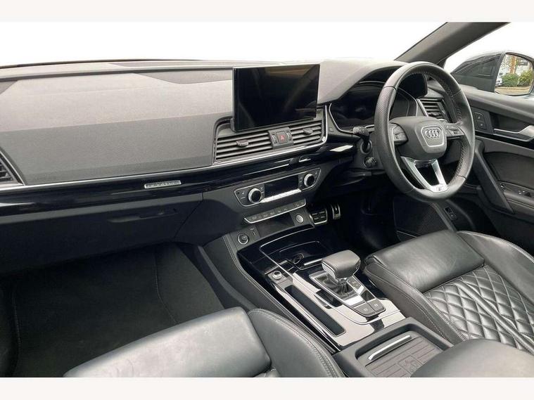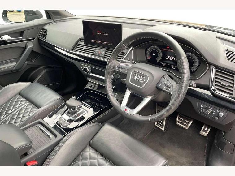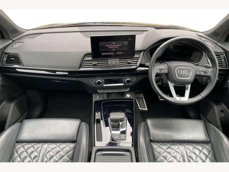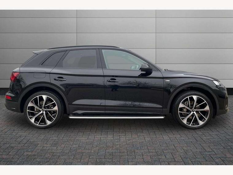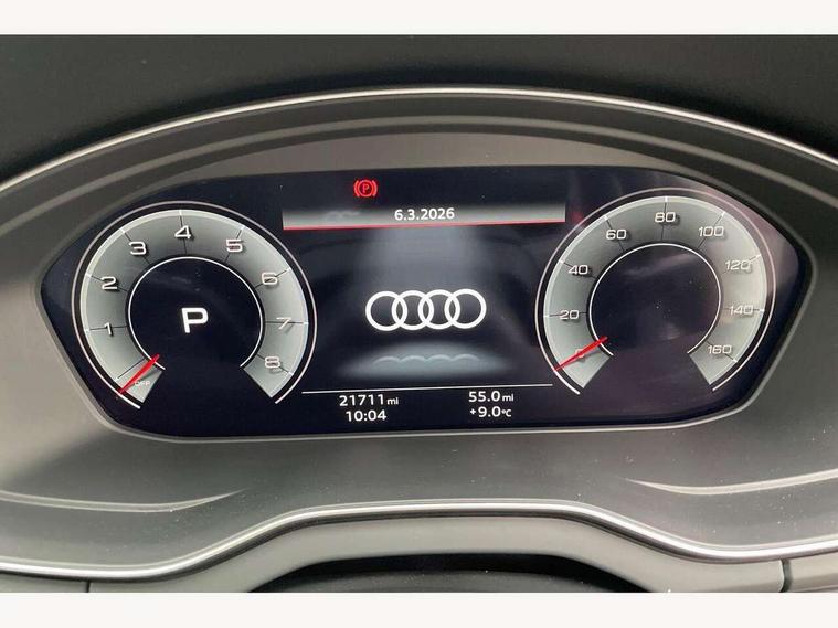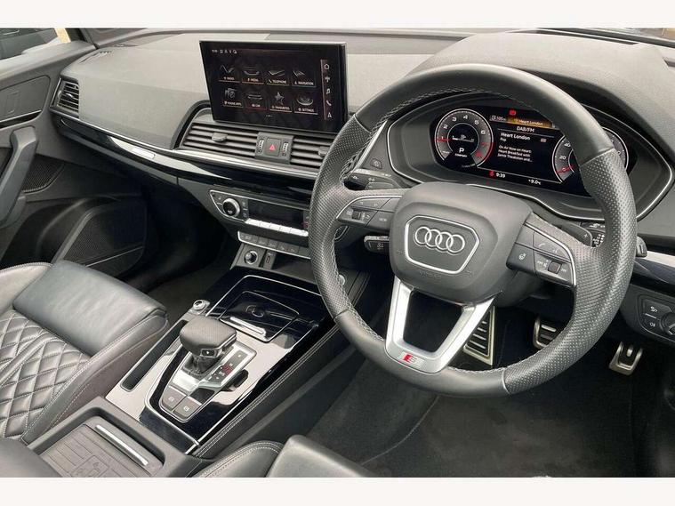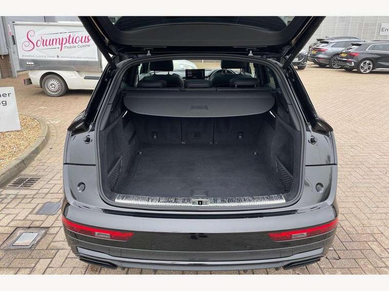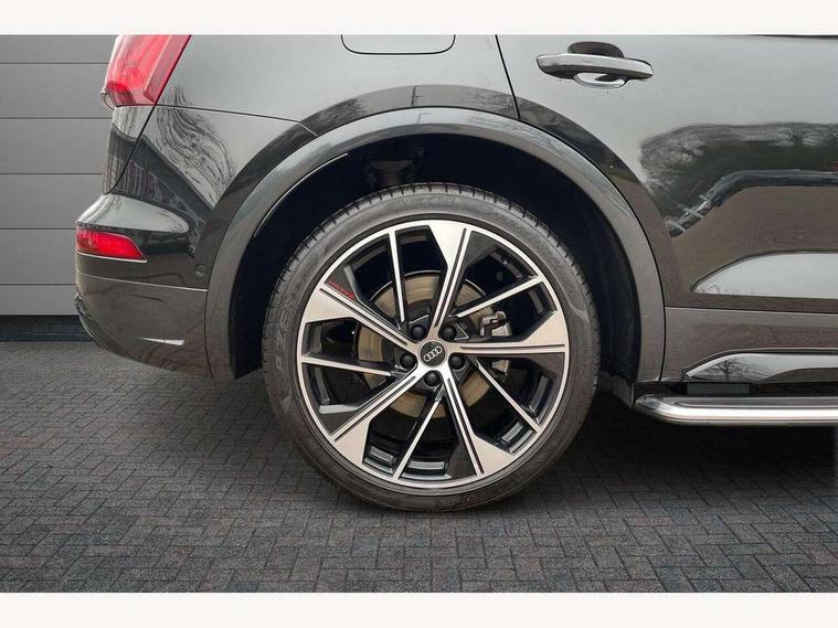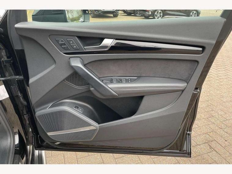 360 degree camera with top view, Advanced key with electric hands free boot opening system, Audi connect safety and service (e-call), Audi connect with Amazon Alexa Integration, Audi drive select, Audi Phone Box with wireless charging - Qi enabled compatible phone and additional bluetooth interface, Audi virtual cockpit plus with 12.3" screen and three different layout designs, Audi wireless smartphone interface, Automatic start-stop system with coasting functionality and efficiency programme, Electro - mechanical power assisted steering, Head up Display, MMI navigation plus with 10.1" touch screen, Mobile telephone preparation - bluetooth interface, Park assist with parking aid plus, Power tailgate, Service interval indicator, Voice control system with Audi hotword activation "Hey Audi", Adaptive air suspension, Quattro on demand, 2 x USB charging port with aux input socket, Bang + Olufsen sound system, DAB Digital radio, 3rd brake light, Acoustic windscreen, Audi beam with 'Vorsprung' logo, Audi matrix LED headlights with OLED rear lights + dynamic front and rear indicators, Auto dimming door mirrors, Auto dimming rear view mirror, Automatic headlight adjustment, Automatic headlights and windscreen wipers, Black roof rails, Body colour bumpers, Body colour underbody protection, Chrome plated exhaust trims, Daytime running lights, Door sills in Selenite silver, Electric adjustable/heated/folding door mirrors, Front air inlet surrounds in titanium black, Front and rear electric windows, Gloss black finish for Audi rings and Q5 logos without engine badging, Headlight washers, High gloss black B pillar trims and triangular rear door trim, Lower bumpers painted in contrast Manhattan grey, Panoramic sunroof, Rear chrome trim strip below lights, Rear privacy glass and rear side windows, Rear side wing doors, Rear wiper, Roof bars, Running boards, S Line rear spoiler, 3 rear headrests, 3 spoke heated leather multi-function steering wheel, 4 way electric lumbar support for driver and front passenger, 40:20:40 split folding 3 rear bench seat in 2nd row with rear centre armrest, Black cloth headlining, Comfort front centre armrest, Contrast stitching on seats, steering wheel and gear lever gaiter, Deluxe 3 zone electronic climate control, Electrically adjustable front seats with driver memory, Fine Nappa leather upholstery with diamond pattern contrast stitching + front sport seats with S embossed logo, Front/rear floor mats, Gear lever in black leather, Heated front and outer rear seats, Height adjustable front head restraints, Illuminated door sill trims with aluminium inlays, ISOFIX child seat mounting and top tether, Luggage compartment cover, Massage function for front seats, Rear seat bench plus, Removable luggage compartment floor, Single front passenger seat, Stainless steel pedals, Sunvisors with vanity mirrors, Black styling package - Q5, City Assist pack - Q5, Extended interior upholstery pack - Q5, Extended LED Interior multi coloured Lighting Pack - Q5, Tour pack - Q5, 3 point seatbelts on all seats, 6 airbags - Driver, front passenger, curtain and side airbags, Electrically operated child locks on rear doors, Electromechanical parking brake, Electronic stabilisation control including ABS, ASR and EDL, Front passenger airbag deactivation, Hill descent control, Hill hold assist, Multi collision brake assist, Pop-up bonnet for pedestrian protection, Pre sense city, Seat belt force limiter, Seatbelt monitoring, Tyre pressure warning, Warning triangle and first aid kit, Anti theft alarm, Anti-theft wheel bolts, Keyless Go access/ignition system, Remote central locking, Piano black finish inlay, Tool kit, Tyre repair kit,