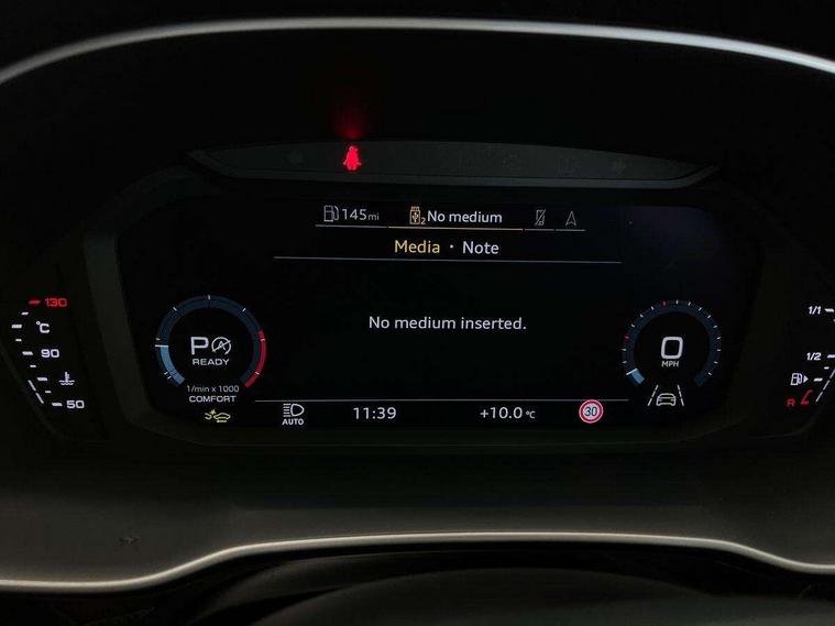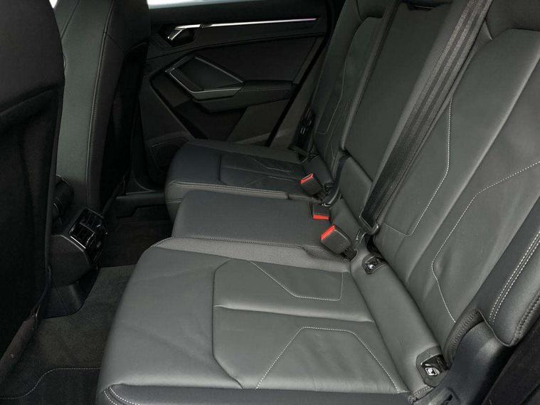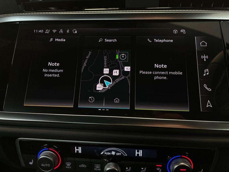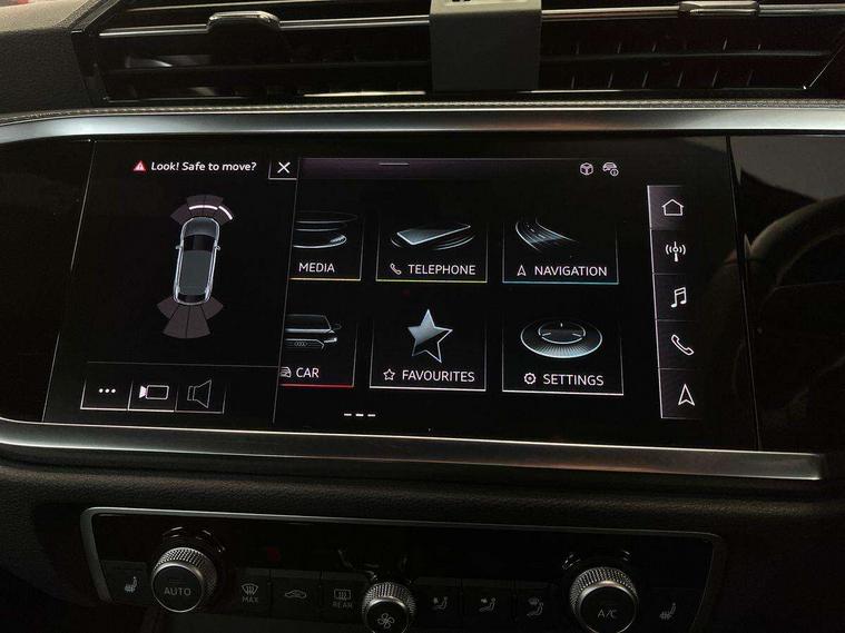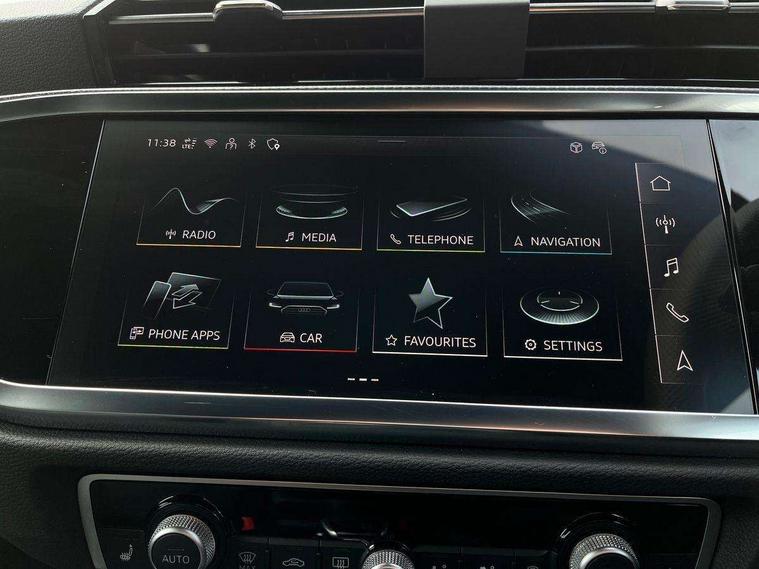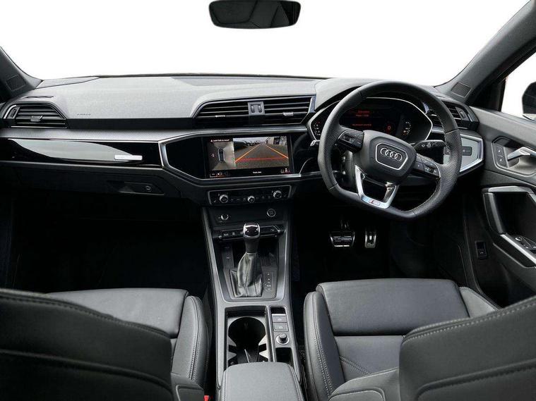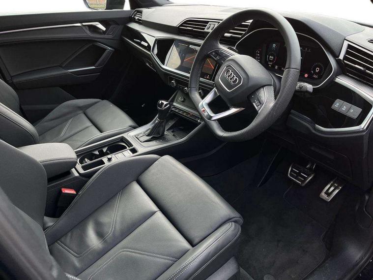 Audi connect safety and service, Audi drive select, Audi lane departure warning, Audi Virtual Cockpit - 10.25" display, Bluetooth interface, Camera based traffic sign recognition, Distraction and Fatigue warning, Legal emergency call, MMI Navigation Plus with high resolution 10.1 inch touchscreen colour display, Power operated tailgate, Progressive steering, Service interval indicator, Smartphone interface includes wireless Apple carplay/Android Auto, Start stop system with recuperation, Voice control system with natural language interaction, Diesel particulate filter, Sports suspension, 2 USB-C ports with charge and data functions, 6 passive loudspeakers, DAB digital radio module, Acoustic windscreen, Audi Beam uses LEDs to project the Audi logo onto the ground as you exit your Q3, Auto dimming door mirrors, Auto dimming frameless rear view mirror, Electrically folding, adjustable and heated door mirrors with integrated LED side indicators and kerb view function for passenger side, Front and rear electric windows, Front fog lights, Front underbody protection in manhattan grey paint finish, High gloss black finish B and C pillars, Honeycomb design radiator grille in matt anthracite black, LED Dynamic rear indicators, LED headlights with LED daytime running lights, LED rear lights, LED third brake light, Privacy glass dark tinted rear and rear-side windows (from B-pillar backwards), Rain and light sensors, Rear diffuser grille in grained matt black, Rear diffuser strip in matt anthracite black, Rear side wing doors, Rear underbody protection in matt black, Rear wiper, S line front and rear bumpers and side skirts in contrasting Manhattan grey paint finish, Variable front intermittent wipers, 12V socket in rear centre console, 3 seat bench in 2nd row, 40:20:40 folding with manual adjustment for 60:40 forwards/backwards position and backrest angle, Adjustable rear seat bench/backrest with centre armrest and cupholder, Black carpet mats, Black cloth headlining, Dual zone electronic climate control, Electric lumbar support, Front and rear black floor mats with contrast stitching in rock grey, Front and rear headrests, Front centre armrest, Height and reach adjustable steering wheel, Illuminated door sill trims with S logo, ISOFIX child seat mounting for front passenger with airbag deactivation and outer rear seat including top tether attachment point for outer rear seats, Luggage compartment sill protection in stainless steel, Manual front seats with height adjustment, Perforated leather gearknob, Single front passenger seat, Stainless steel pedals, Twin leather upholstery with front sport seats + S embossing, Black styling pack - Q3, Non smoking pack - Q3, 3x3 point rear seatbelts, 6 airbags - Driver, front passenger, curtain and side windows, Audi pre-sense front with pedestrain and cyclist recognition, Electrically operated child locks on rear doors, Electromechanical parking brake, Electronic stabilisation control including ABS, ASR and EDL, Front seatbelt reminder, Hill descent control, Hill hold assist, Pre sense basic, Seatbelt monitoring, Tyre pressure warning, Warning triangle and first aid kit, Anti theft wheel bolts, Immobiliser, Remote central locking, Thatcham approved category 1 anti theft alarm, Aluminium look interior elements, Detail dashboard around MMI touch colour display in glass look, black with surround in aluminium look, Leatherette door armrest, Piano black inlay,