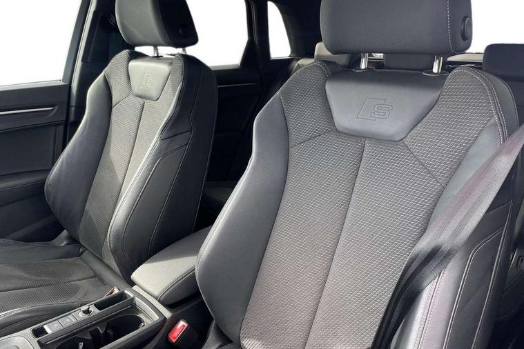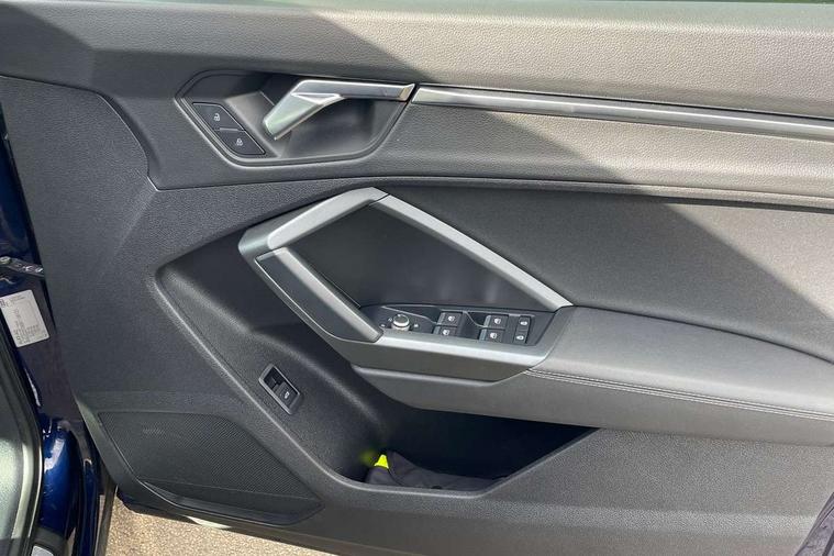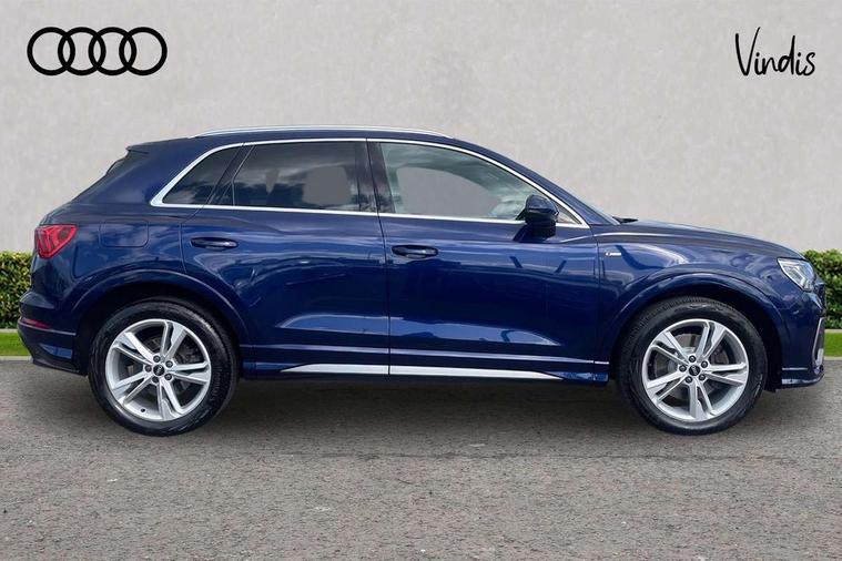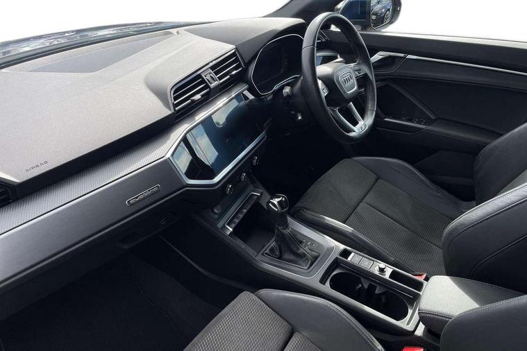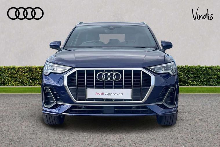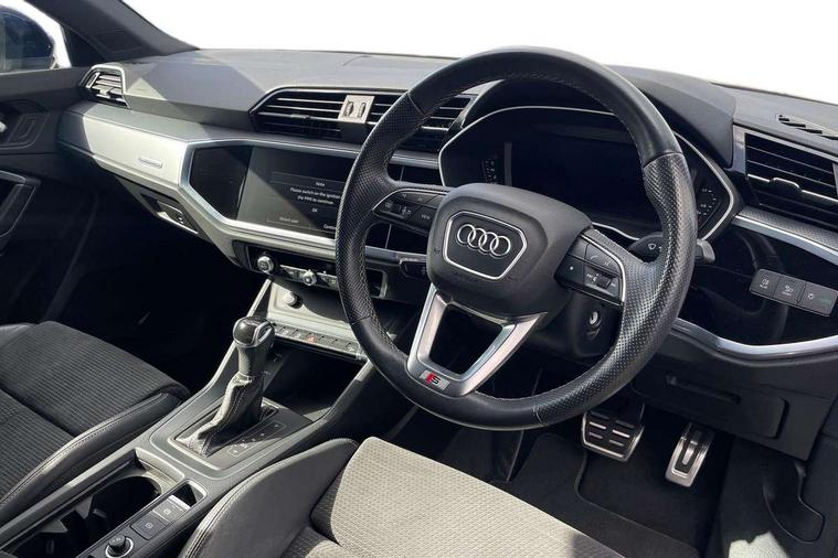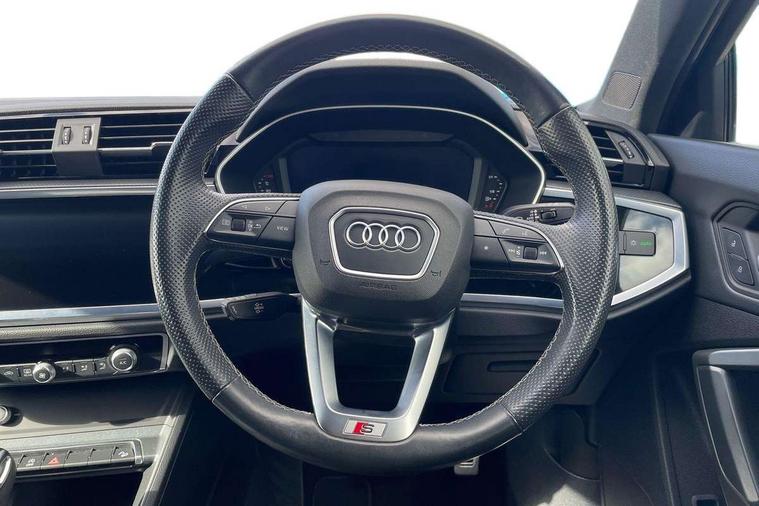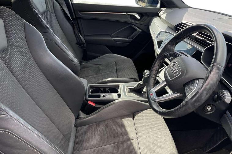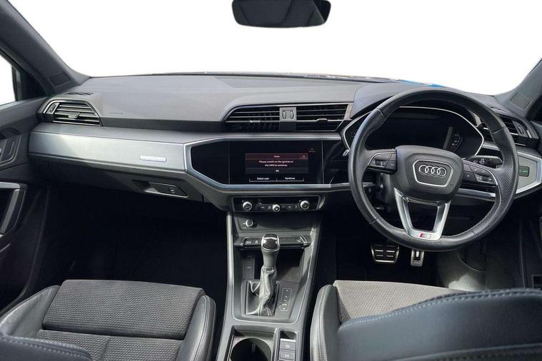 Amazon alexa Integration, Audi connect safety and service (e-call), Audi drive select, Audi lane departure warning, Audi Virtual Cockpit - 10.25" display, Bluetooth interface, Camera based traffic sign recognition, MMI Navigation Plus with high resolution 10.1 inch touchscreen colour display, Power operated tailgate, Progressive steering, Service interval indicator, Smartphone interface includes wireless Apple carplay/Android Auto, Start stop system with recuperation, Voice control system with natural language interaction, Sports suspension, 2 USB-C ports with charge and data functions, 6 passive loudspeakers, DAB digital radio module, Acoustic windscreen, Aluminium roof rails, Aluminium window trim, Auto dimming frameless rear view mirror, Body coloured bumpers, Electrically folding, adjustable and heated door mirrors with integrated LED side indicators and kerb view function for passenger side, Front and rear electric windows, Front fog lights, Front side air inlets in matt platinum grey, Front spoiler blade in matt platinum grey, Grille vertical bars in aluminium silver/Matt, High gloss black finish B and C pillars, LED headlights with LED daytime running lights and dynamic rear indicator, LED rear lights, Privacy glass dark tinted rear and rear-side windows (from B-pillar backwards), Rain and light sensors, Rear diffuser strip in matt titanium black, S line badges on front wings, S Line front and rear bumpers, Side skirt insert in matt Platinium grey, Silver chrome grille surround, Titanium black radiator grille, 12V socket in rear centre console, 40:20:40 folding with manual adjustment for 60:40 forwards/backwards position and backrest angle, Adjustable rear seat bench/backrest with centre armrest and cupholder, Black cloth headlining, Dual zone electronic climate control, Front and rear black floor mats with contrast stitching in rock grey, Front and rear headrests, Front and rear roof module including reading lights, Front centre armrest, Glove compartment lighting, Height and reach adjustable steering wheel, Illuminated door sill trims with S logo, ISOFIX child seat mounting for front passenger with airbag deactivation and outer rear seat including top tether attachment point for outer rear seats, Luggage compartment light, Manual front seats with height adjustment, Perforated leather gearknob, Stainless steel luggage compartment sill finisher, Stainless steel pedals, Non smoking pack - Q3, 3x3 point rear seatbelts, 6 airbags - Driver, front passenger, curtain and side windows, Audi pre-sense front with pedestrain and cyclist recognition, Electrically operated child locks on rear doors, Electromechanical parking brake, Electronic stabilisation control including ABS, ASR and EDL, Hill descent control, Hill hold assist, Pre sense basic, Seatbelt monitoring, Tyre pressure warning, Warning triangle and first aid kit, Anti theft alarm, Anti theft wheel bolts, Remote central locking, Dark matt brushed aluminium inlay, Detail dashboard around MMI touch colour display in glass look, black with surround in aluminium look, Leatherette door armrest,