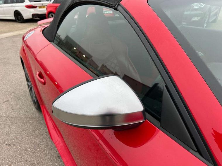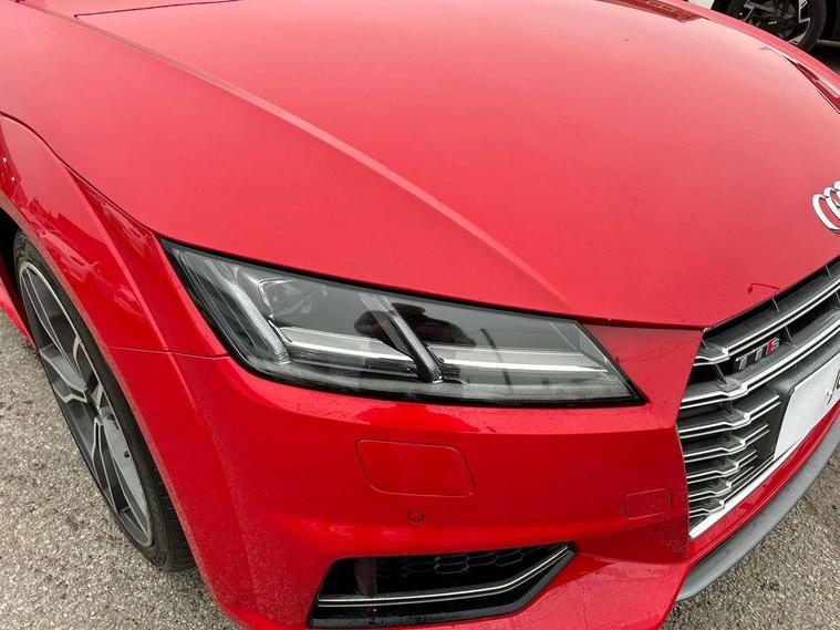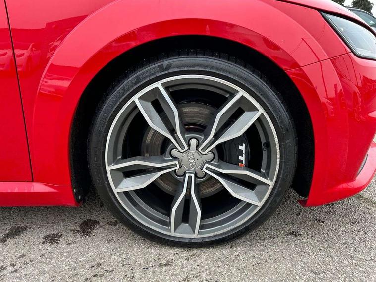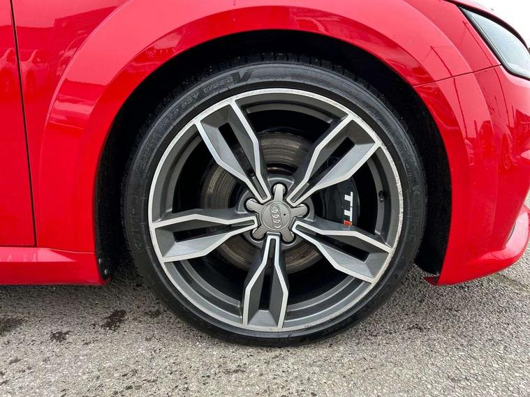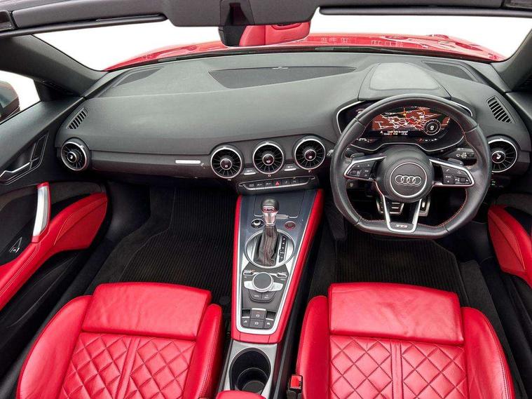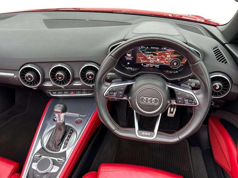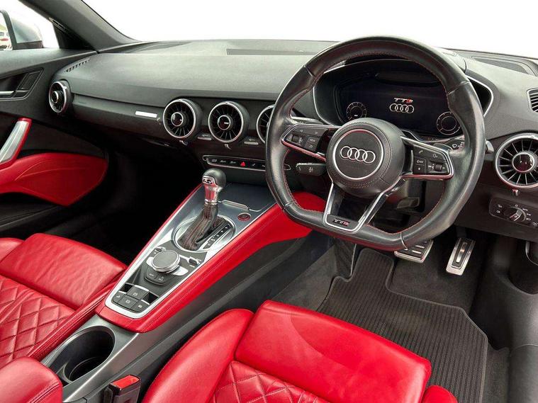 Audi active lane assist, Audi drive select, Audi virtual cockpit - 12.3" high-resolution LCD display with fully customisable instrument cluster, Cruise control + speed limiter, MMI touch panel, Mobile phone preparation with bluetooth interface, Progressive power assisted steering, Seat belt microphone, Service interval indicator, Audi magnetic ride, TTS suspension, Audi music interface, Audi sound system, Auxiliary input socket, Bluetooth audio streaming, DAB Digital radio, MMI Radio with CD player and SD/XC card slot, Aluminium door mirror housings, Audi Beam uses LEDs to project the Audi Sport logo, Auto headlight range control, Body colour bumpers, Electric front windows, Fabric hood - Black, Fully automatic acoustic hood, Green tinted heat insulating glass, LED daytime running lights, Platinum grey front grille, Rear diffuser, Retractable rear spoiler, S body styling, Sunband for windscreen, 3 spoke flat bottomed high multi-function leather sport steering wheel with gearshift paddles, Aluminium door sill trims, Black headlining, Electric lumbar support, Extended aluminium look with stainless steel pedals, Front centre armrest, Front head restraints, Front passenger seat isofix location point, Height/reach adjust steering wheel, ISOFIX on outer rear seats, Top tether anchor plate for isofix child seat, Auto dimming rear view mirror with light and rain sensors pack - TT, LED interior light pack - TT/TT RS, Non smoking pack - TT/TT RS, 3 point front seat belts, ABS, ASR traction control, Curtain airbags, Driver/Front Passenger airbags, EDL traction control, Electromechanical parking brake, ESP, First aid kit, Front passenger airbag deactivation, Front side airbags, Head airbags, Roll over bars, Seatbelt warning, Tyre pressure warning, Warning triangle, Anti theft alarm, Immobiliser, Keyless Start, Locking wheel bolts, Remote central locking, Matt brushed aluminium inlays, Tyre repair kit,