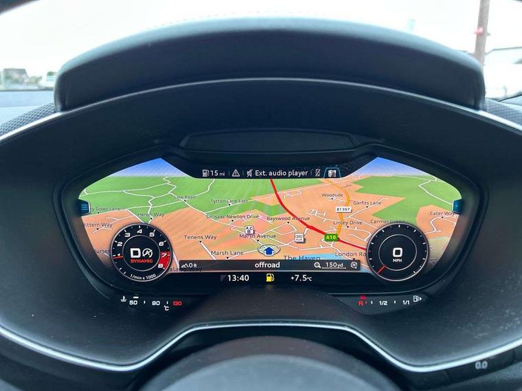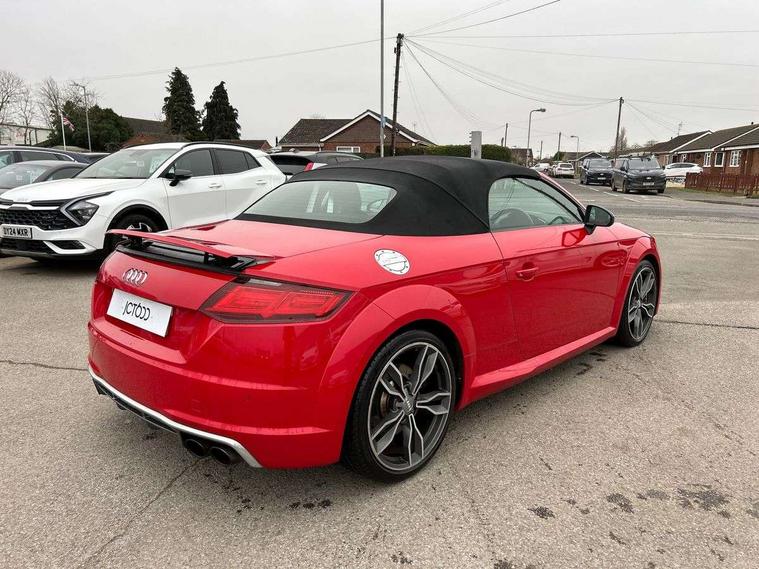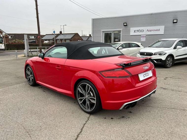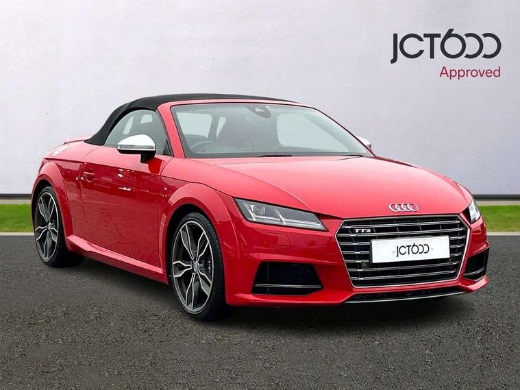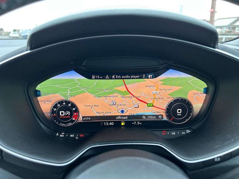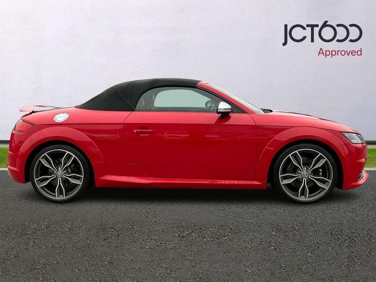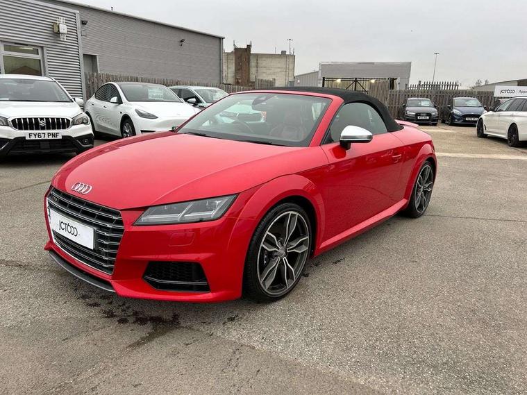 Audi active lane assist, Audi drive select, Audi virtual cockpit - 12.3" high-resolution LCD display with fully customisable instrument cluster, Cruise control + speed limiter, MMI touch panel, Mobile phone preparation with bluetooth interface, Progressive power assisted steering, Seat belt microphone, Service interval indicator, Audi magnetic ride, TTS suspension, Audi music interface, Audi sound system, Auxiliary input socket, Bluetooth audio streaming, DAB Digital radio, MMI Radio with CD player and SD/XC card slot, Aluminium door mirror housings, Audi Beam uses LEDs to project the Audi Sport logo, Auto headlight range control, Body colour bumpers, Electric front windows, Fabric hood - Black, Fully automatic acoustic hood, Green tinted heat insulating glass, LED daytime running lights, Platinum grey front grille, Rear diffuser, Retractable rear spoiler, S body styling, Sunband for windscreen, 3 spoke flat bottomed high multi-function leather sport steering wheel with gearshift paddles, Aluminium door sill trims, Black headlining, Electric lumbar support, Extended aluminium look with stainless steel pedals, Front centre armrest, Front head restraints, Front passenger seat isofix location point, Height/reach adjust steering wheel, ISOFIX on outer rear seats, Top tether anchor plate for isofix child seat, Auto dimming rear view mirror with light and rain sensors pack - TT, LED interior light pack - TT/TT RS, Non smoking pack - TT/TT RS, 3 point front seat belts, ABS, ASR traction control, Curtain airbags, Driver/Front Passenger airbags, EDL traction control, Electromechanical parking brake, ESP, First aid kit, Front passenger airbag deactivation, Front side airbags, Head airbags, Roll over bars, Seatbelt warning, Tyre pressure warning, Warning triangle, Anti theft alarm, Immobiliser, Keyless Start, Locking wheel bolts, Remote central locking, Matt brushed aluminium inlays, Tyre repair kit,
