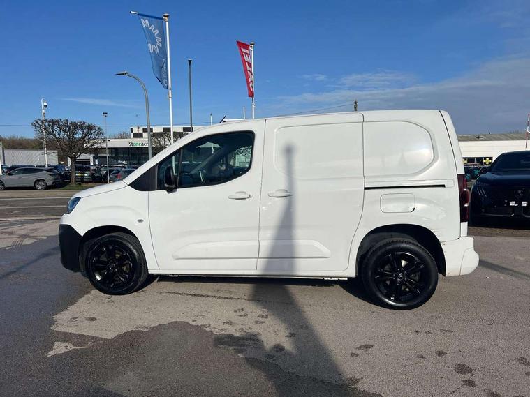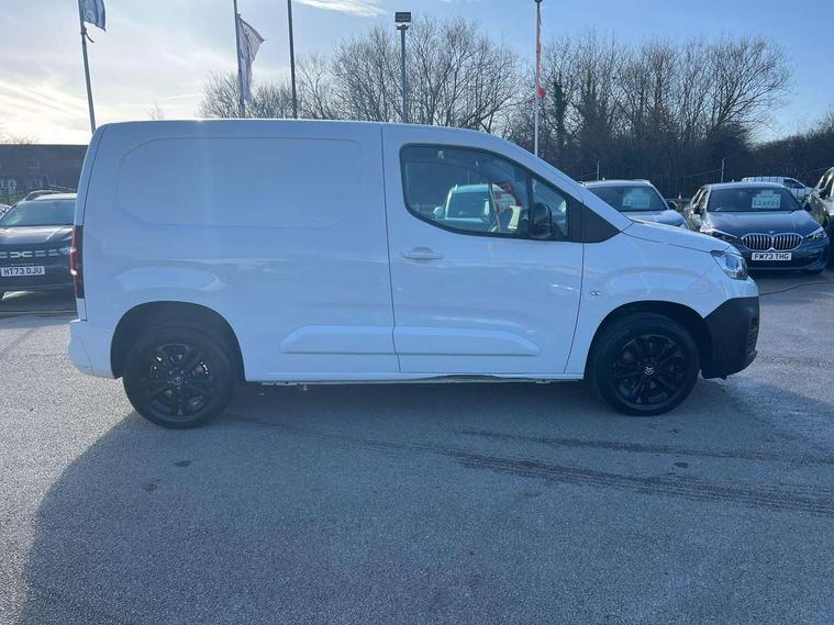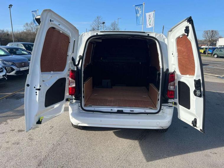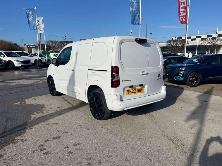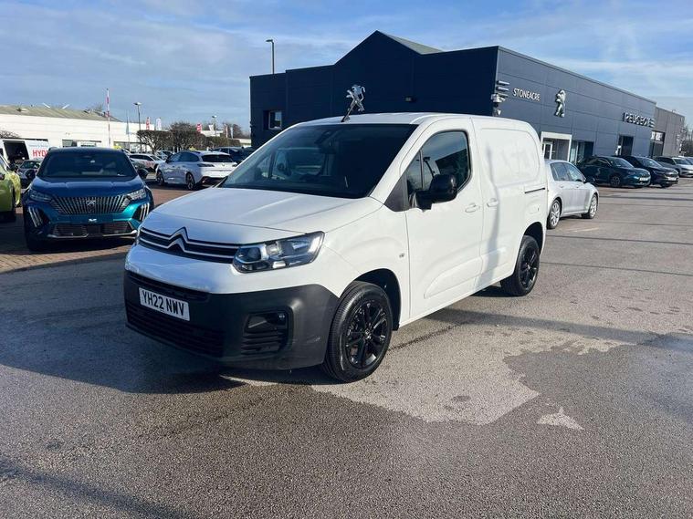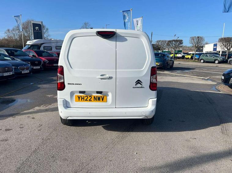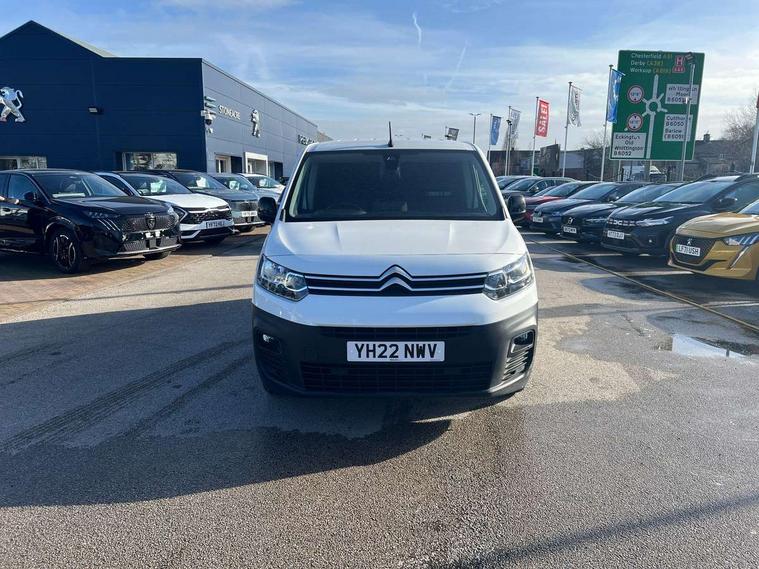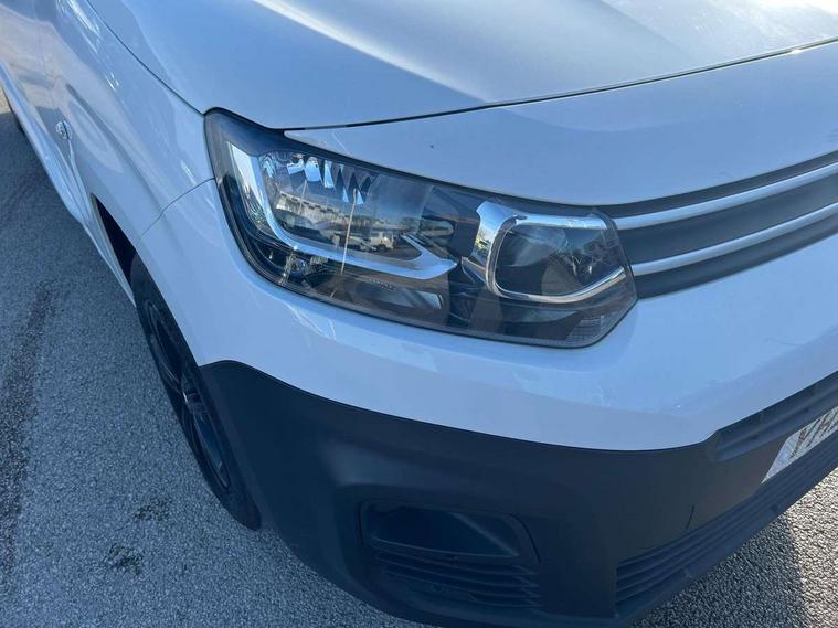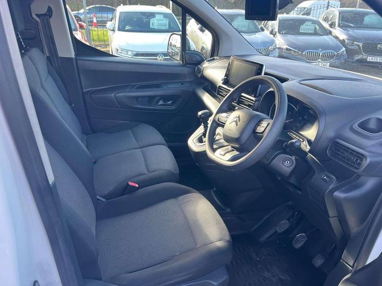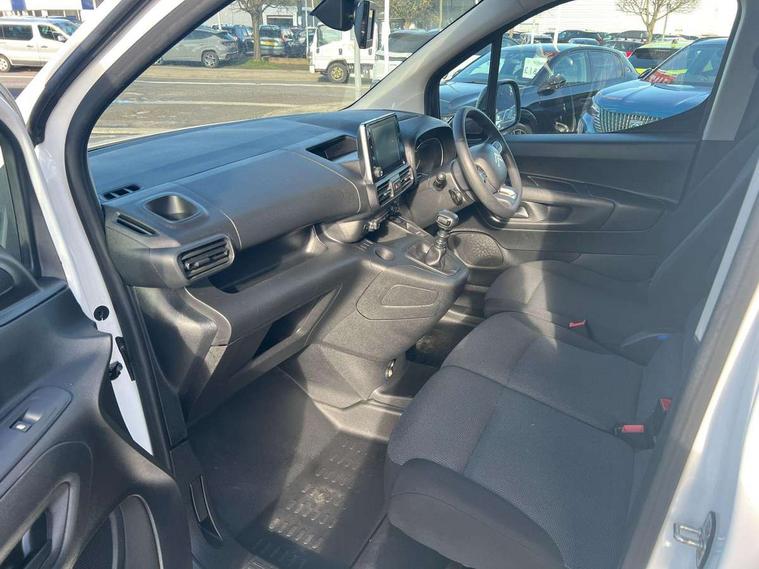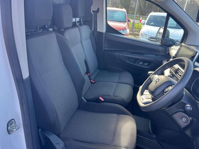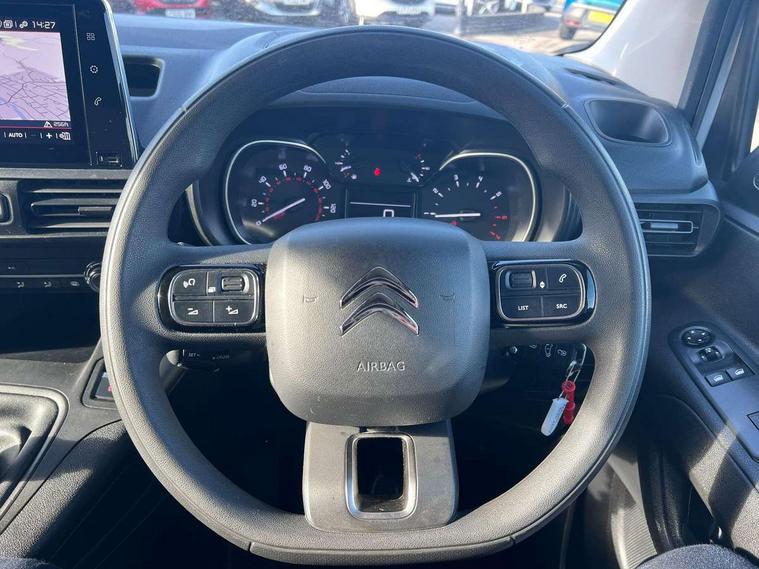 10" Fully digital drivers instrument display, Citroen connect navigation with 8" colour touchscreen, DAB radio, bluetooth with handsfree, USB socket and Aux-in jack, Cruise control with programmable speed limiter, Electric power assisted steering with height and reach adjustable steering wheel, Lockable fuel cap, Multi-function trip computer, Rev counter with maintenance and gear efficiency indicators (GEI), Surround Rear Vision - Front and rear parking sensors with passenger side and rear camera providing tri-function visibility via 5" screen, Tyre pressure monitor, Apple Carplay/Android Auto, 180 degree opening unglazed asymmetric rear doors, Acoustic laminated windscreen with sound insulating front windows, Additional acoustic insulation providing benchmark cabin refinement, Electric front windows with one touch operation, Electrically adjustable door mirrors, Electrically folding door mirrors with temperature sensor, Front fog lights, High level third brake light, Nearside side sliding door, Visible VIN at windscreen base, 12 volt socket in dashboard, 6 floor mounted load securing rings, 6 way adjustable driver seat with lumbar support and under seat storage, Comfort driver's seat, Cup holders for driver and passenger on either side of the dashboard, Curitiba cloth upholstery, Extenso modular fold front passenger 2 seat bench - pivot writing table, storage under central seat, load through hatch bulkhead, load protect cover, Front door pockets with 1.5L bottle holder, Hard plastic floor protection in cabin, Multi function steering wheel, Overhead storage shelf in cabin, Topbox storage compartment, Look pack with body coloured rubbing strips - Berlingo, Visibility pack with Magic wash - Berlingo, Automatic activation of hazard warning lights on major deceleration, Door opening warning and audible lights on warning, Driver's airbag, Driver/passenger seatbelt unfastened warning, Dashboard mounted central locking push button and auto locking above 7mph, Perimetric and volumetric thatcham category 1 approved alarm with tilt sensor, Remote central locking with deadlocking, selective cab and load area locking via 3 button plip remote control key, Thatcham approved rolling code transponder immobiliser, Automatic electronic parking brake, Electronic Stability Control and ABS with hill start assist, EBA and EBFD, 16" Starlit alloy wheels, Full size steel spare wheel,