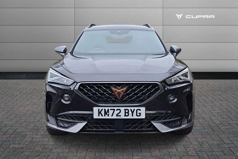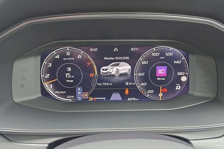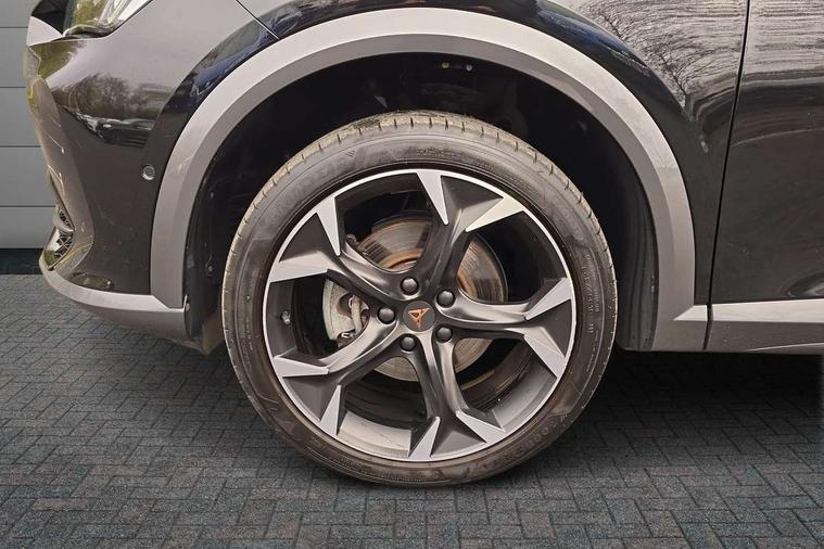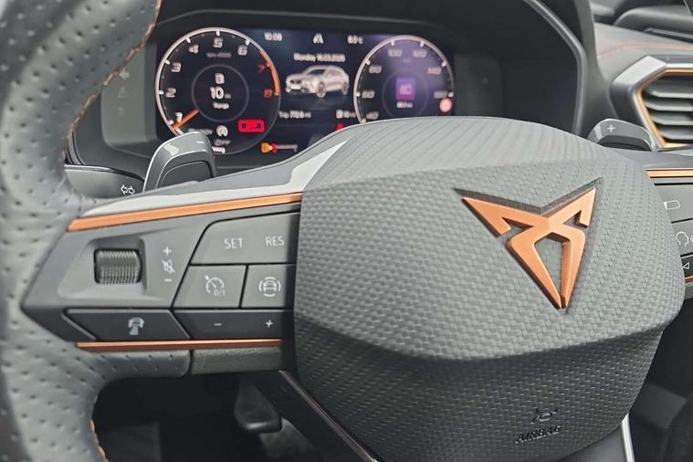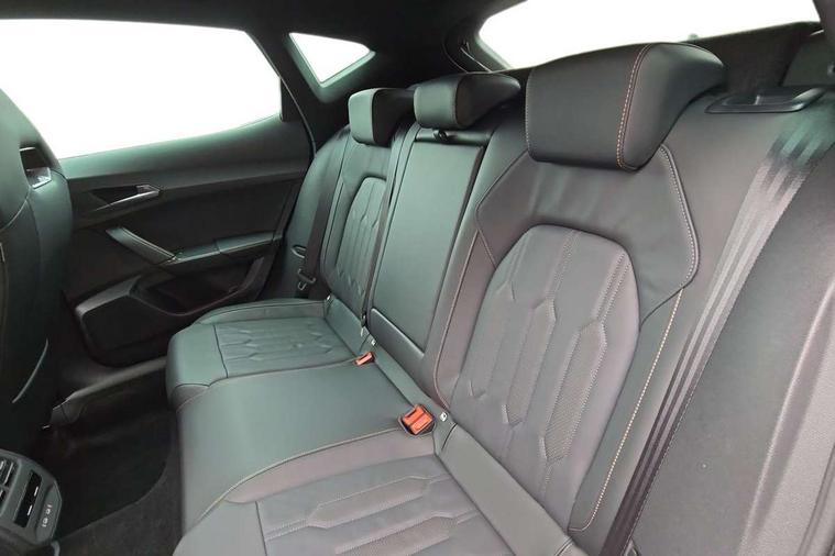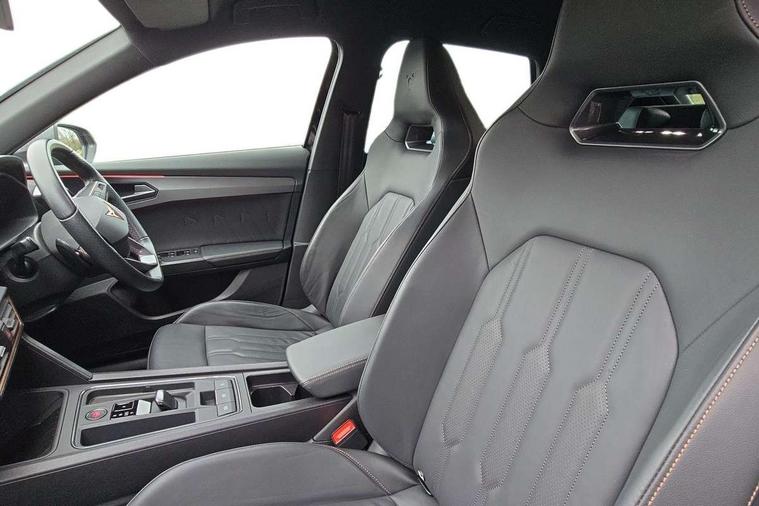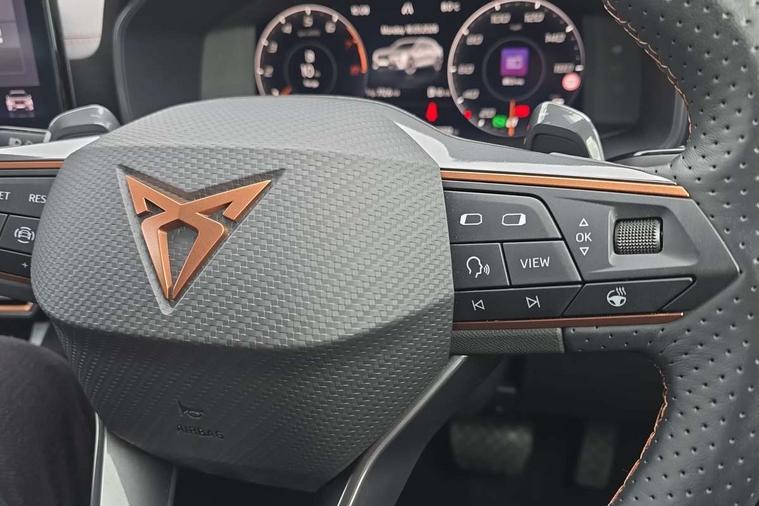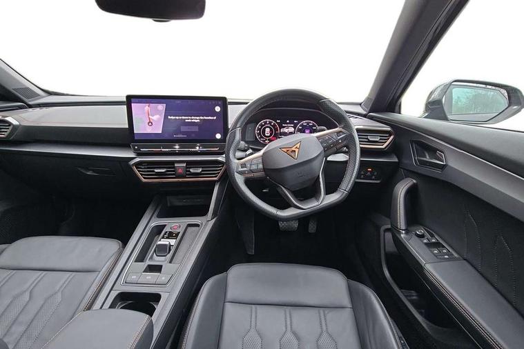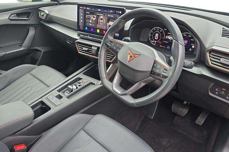 Digital cockpit and configurable dashboard, Driver alert system, Driving profile selection, Forward collision warning with automatic braking, Lane assist, Navigation system with 12'' Touchscreen Display, Park assist (inc front/rear parking sensors), PAS, Predictive adaptive cruise control with speed limiter, Rear view camera, RPM, trip computer, outside temp gauge, instrument light brightness, low fuel warning light, lights on reminder, gearshift indicator, Service interval indicator, Start/stop system with regenerative braking, Voice control system, Wireless apple carplay, Wireless phone charger, Electronic locking differential and dynamic traction support, Standard suspension, 2 front and 2 rear USB type C sockets, Auxiliary input socket, DAB radio, Auto dimming rear view mirror, Body colour door handles, Body coloured bumpers, Dark grey wing mirror, Daytime running light with automatic headlight control and coming home feature, Dynamic headlight range control, Electric front/rear windows, Electrically adjustable heated and folding door mirrors with memory function, Front fog lamps with cornering function, Gloss black roof rails and window surrounds, LED Headlights, LED Taillights with dynamic indicator, Rain sensing wipers, Rear diffuser with black simulated exhaust pipes, Rear side wing doors, Rear wash/wipe, Third brake light, Tinted rear windows, Welcome lights, 12v power supply in centre console, 12V socket, 12v socket in loadspace, 2 front and 2 rear reading lights, 230V socket, 3 seat bench in 2nd row, 60/40 split rear bench seat with armrest and mechanical seat release, Black headlining, Dust/pollen filter, Front and rear head restraints, Front centre armrest, Height/reach adjust steering wheel, Illuminated interior front door sills, Illuminated sunvisor with mirror, Isofix, Leather multi function heated steering wheel with gear shift paddles, Luggage tie-down hooks, Single front passenger seat, Three zone climate control with control panel in rear, Variable luggage/load compartment floor, Wraparound lighting, Genuine Nappa leather Pack - Cupra, 3 point seatbelts on all rear seats, ABS, Brake control system - ESC and brake booster, Child proof door locks, Driver and front passenger airbags with front passenger airbag de-activation, Electronic parking brake, Front and rear disc brakes, Front side curtain airbags, Hill hold control, Public e-call, Seat belt reminder for front and rear seats, Tyre pressure monitoring system, Anti theft alarm system, Keyless entry and start system (KESSY), Locking wheel bolts, Copper and aluminium interior detailing, 19" 'Exclusive' machined sport matte black and silver alloy wheels,