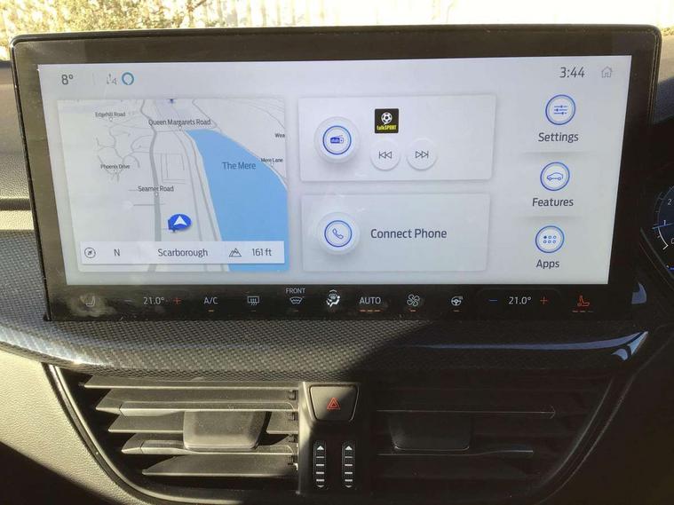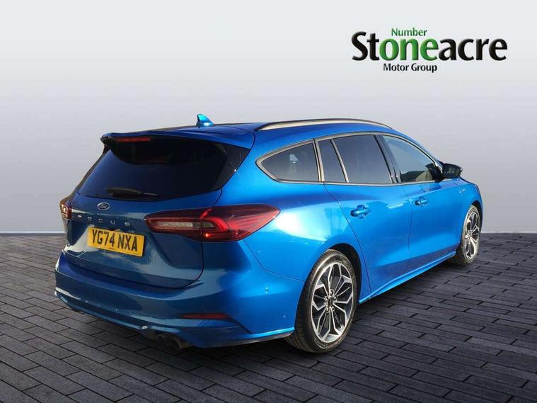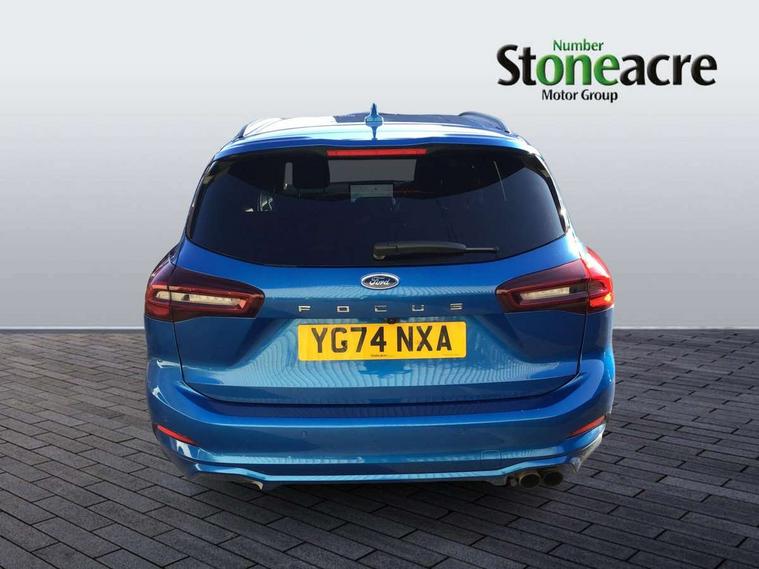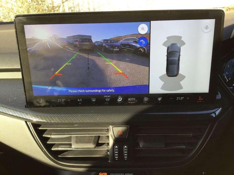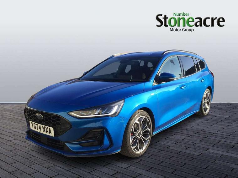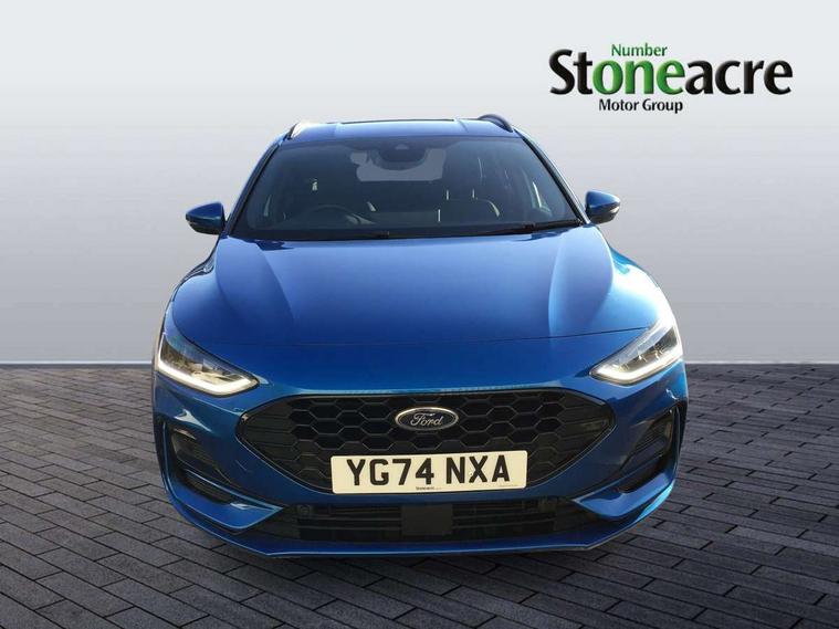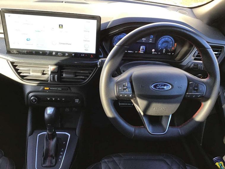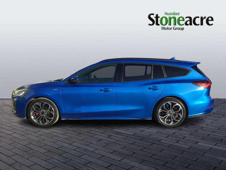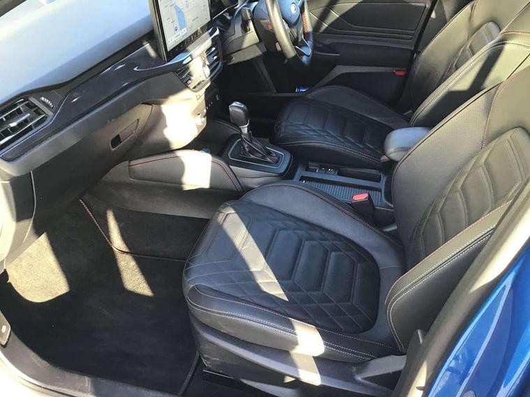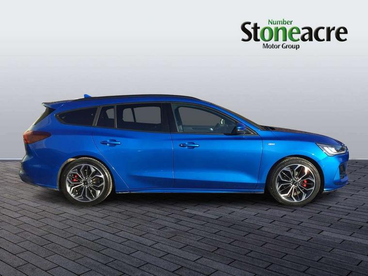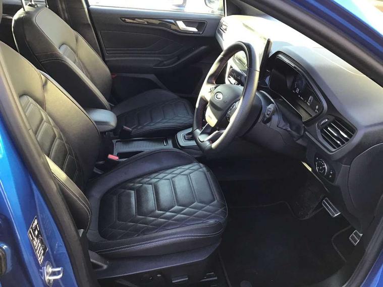 12.3" Digital instrument cluster, Bluetooth system, Digital clock, Easy fuel capless refuelling system, Eco mode, Ford SYNC4 Nav with 13.2'' touchscreen, DAB, Emergency Assistance, Apple Carplay & Android Auto, B&O Premium Audio with 10 speakers, FordPass Connect, Lane keeping system - lane keeping alert and lane keeping aid, PAS, Rev counter, Selectable drive mode, Service interval indicator, Trip computer, Wireless charging pad, Sports tuned suspension, 2 USB ports, Auto headlamps (on/off), Body coloured door handles, Electrically operated front and rear windows with one touch opening and closing, Electrically operated heated power fold door mirrors with puddle lamp with side indicators, Front variable intermittent wipers with electric wash, Heated rear window, LED daytime running lamp, LED rear lamps, LED third brake light, Polished twin tailpipe, Privacy glass, Quickclear heated windscreen, Rain sensor, Rear side wing doors, Tailgate wash/wipe, Unique ST-Line grille, full bodystyling kit, and large body coloured rear roof spoiler, 3 rear headrests, 3 seat bench in 2nd row, Dual zone electronic air temperature control, Full sensico premium upholstery, Height adjustable front headrests, Isofix child seat preparation, Load through ski hatch, Manual 2-way passenger seat adjust, Power 4-way driver seat adjust, with power lumbar adjust, Reach + rake adjustable steering column, Single front passenger seat, ST-Line Design pack - Focus, Winter pack - Focus, 3x3 point rear seatbelts, ABS+Electronic Brake force Distribution, Auto hold function, Driver airbag, EDL traction control, Electronic parking brake, Electronic stability control, Front and rear seatbelt reminder, Front inertia reel height adjustable seatbelts with pre-tensioners, Front passenger airbag, Front side airbags, Passenger airbag deactivate switch, Post collision braking, Pre collision assist with autonomous emergency braking and pedestrian/cyclist detection, Remote/power child rear door locks, Side curtain airbags, Three rear inertia reel lap/diagonal seatbelts, Tyre pressure monitoring system, Keyless entry and keyless start, MyKey system, Remote central locking & engine immobiliser, Thatcham alarm with power door dead locks, 18" 5x3 spoke pearl grey high gloss machined finish alloy wheels with mini spare wheel,