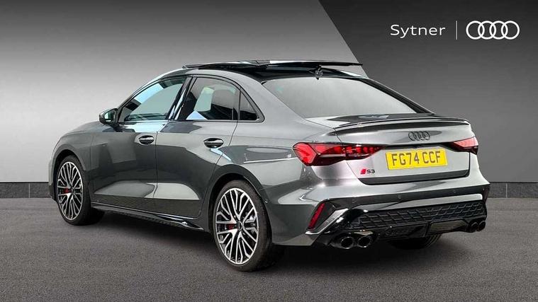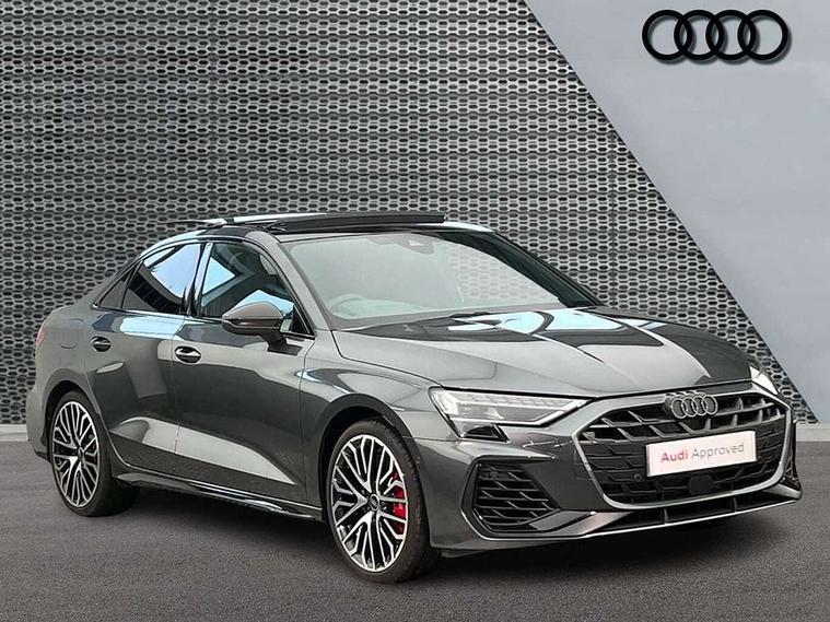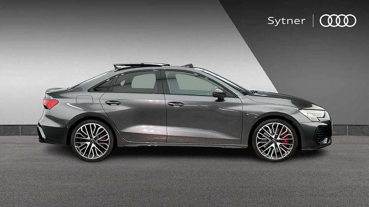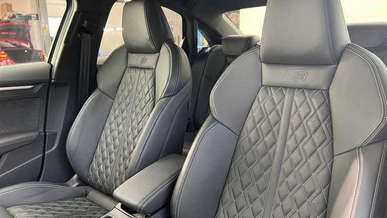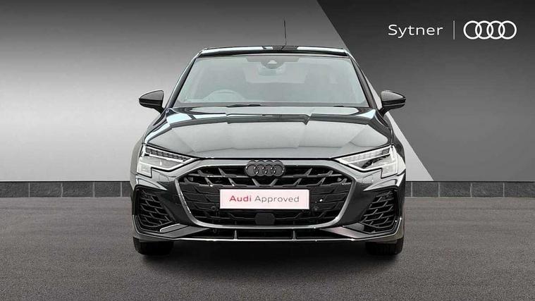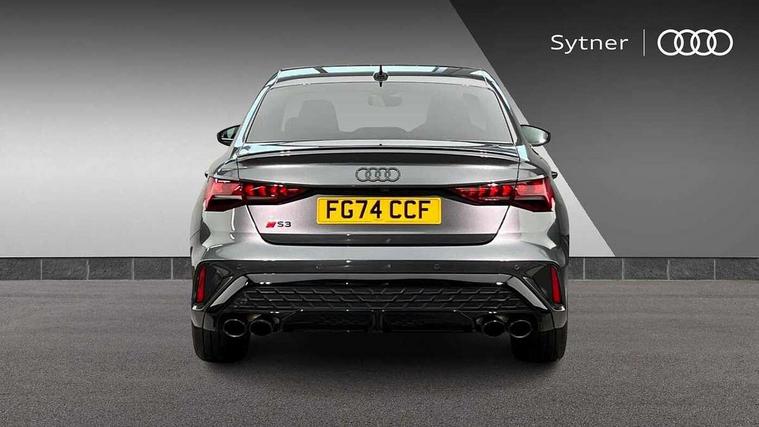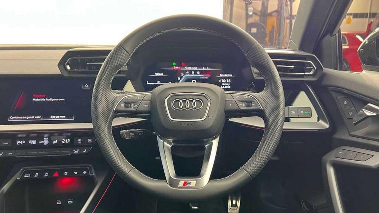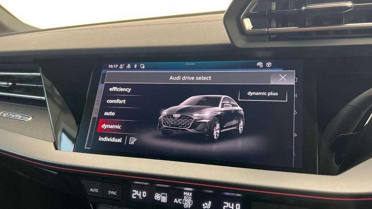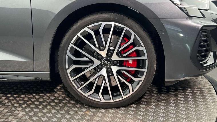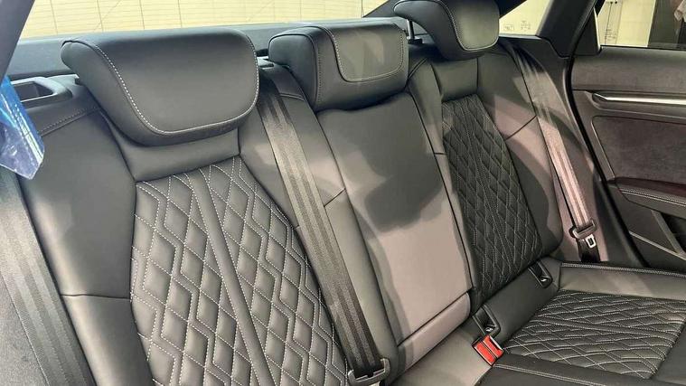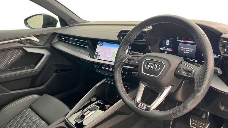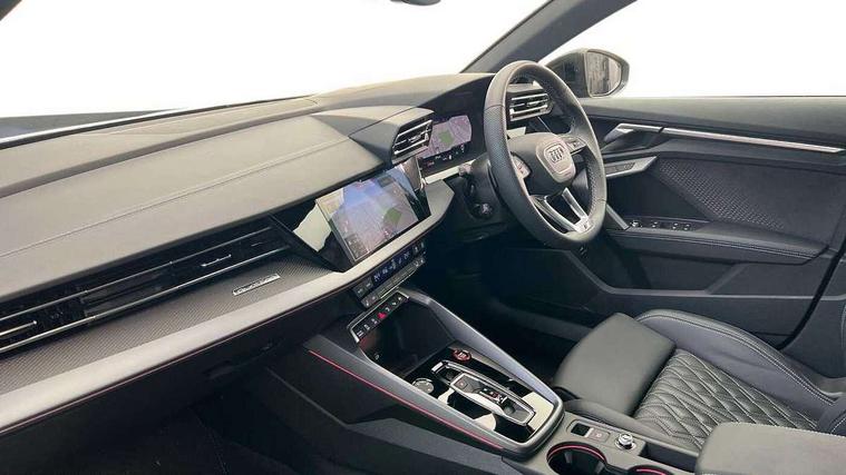 Adjustable speed limiter, Audi drive select, Audi smartphone interface with app store includes wireless Apple carplay, Android auto and Amazon alexa integration, Audi virtual cockpit plus - 12.3" full HD resolution dynamic digital instrument cluster, Automatic start/stop system with recuperation, Bluetooth interface, Camera based traffic sign recognition, Collision avoidance assistant, Distraction and Fatigue warning, e-Call (emergency call), Electromechanical power speed sensitive steering, Lane departure warning system, MMI Navigation Plus with high resolution 10.1" colour touch screen display, Park Assist with parking system Plus, Progressive steering, Service indicator, Trip computer, Voice control system with natural language interaction, S suspension with damper control, Audi Phonebox light with wireless charging, DAB Digital radio, USB ports with charging function in the rear, 3rd brake light, Anthracite grey Audi rings (front and rear), Audi Beam uses LEDs to project Vorsprung onto the ground as you exit your S3, Auto dimming frameless rear view mirror, Black accents front and rear bumpers including air inlets, Black accents in front grille and frame, Black accents window trims strips, Carbon door mirror housings, Electrically adjustable/heated/folding/auto dimming door mirrors with integrated LED indications + kerb view function for passenger side, Exterior model badging, Front electric windows, Headlight washers, Heat insulating glass windscreen, Illuminated door sills with aluminium inserts at the front with S logo, LED daytime running lights, Light and rain sensors, Privacy glass - dark tinted rear window, rear door and side windows, Rear boot, Rear electric windows, Rear side wing doors, S grille, S3 front bumper with S specific air intake grilles, 12V socket and storage compartment in front centre console, 3 seat bench in 2nd row, 3 spoke leather multifunction steering wheel with gear shift paddles, 3-zone deluxe automatic air conditioning, 4 way electrically adjustable lumbar support for driver and front passenger, 40/20/40 split folding rear seat bench, Black cloth headlining, Fine Nappa leather upholstery with front sports seats S embossed logo, Front and rear centre armrest in artificial leather, Front and rear headrests, Front/rear floor mats, Heated front seats, Height and reach adjustable steering wheel, Manual boot compartment lid, Rear cup holders, S badging on the steering wheel, Seat side bolsters, Single front passenger seat, Stainless steel pedals and front footrest in black, Aluminium interior elements pack - A3, Extended ambient lighting package Pro - S3, Storage package - A3 Saloon, Technology package pro - A3 S Tronic, 3x3 point rear seat belts, Driver and front passenger airbag with passenger airbag deactivation, Electronic Stabilisation Control (ESC) including ABS, ASR and EDL, First aid kit with warning triangle and 2 safety vests, Front side airbags with head airbags and interaction airbag, Hill hold assist, Pre-sense front with pedestrian and cyclist detection, Seatbelt monitoring, Tyre pressure loss indicator, Anti theft alarm, Anti-theft wheel bolts, Electronically operated child locks, Immobiliser, Remote central locking with safelock, Dash & door inlays in carbon atlas structure, 19" Multi spoke S design gloss turned alloy wheels in anthracite black, Tyre repair kit,