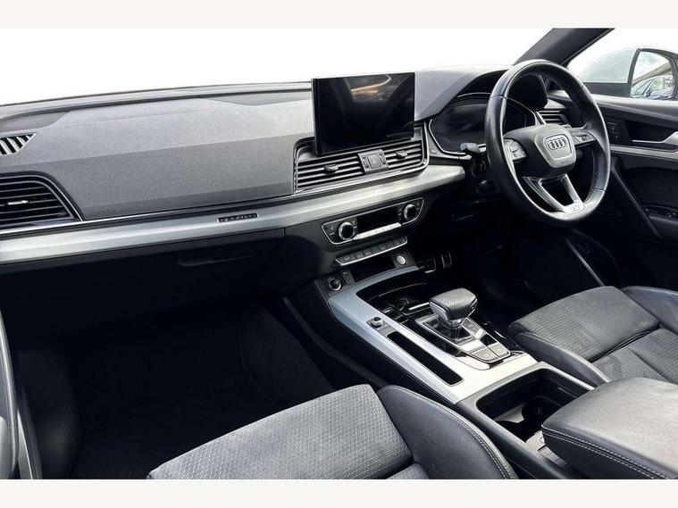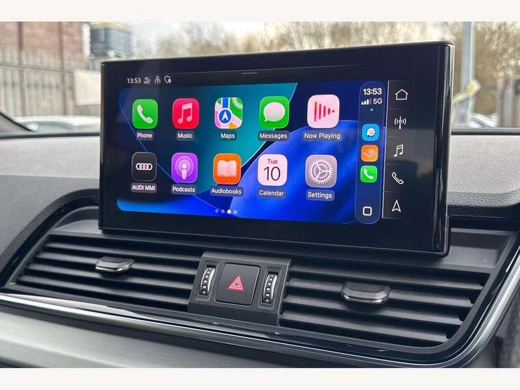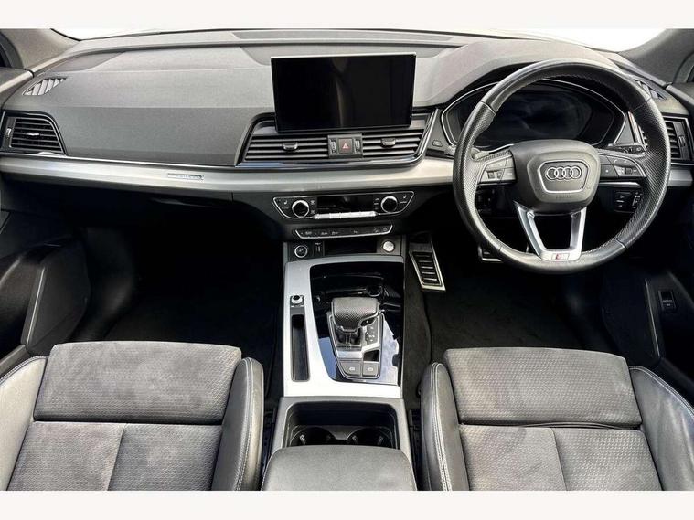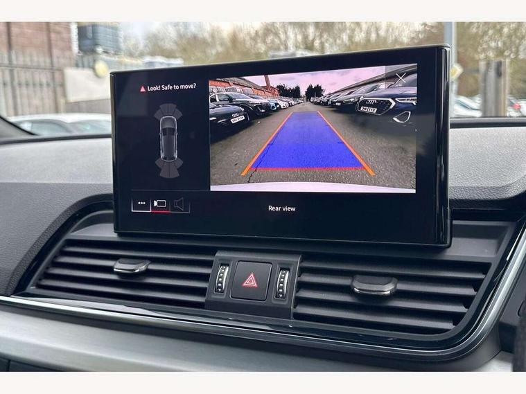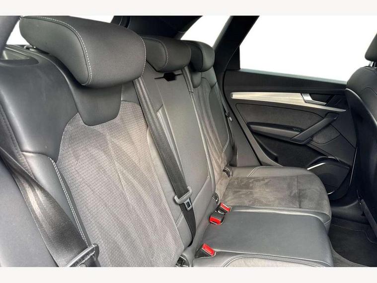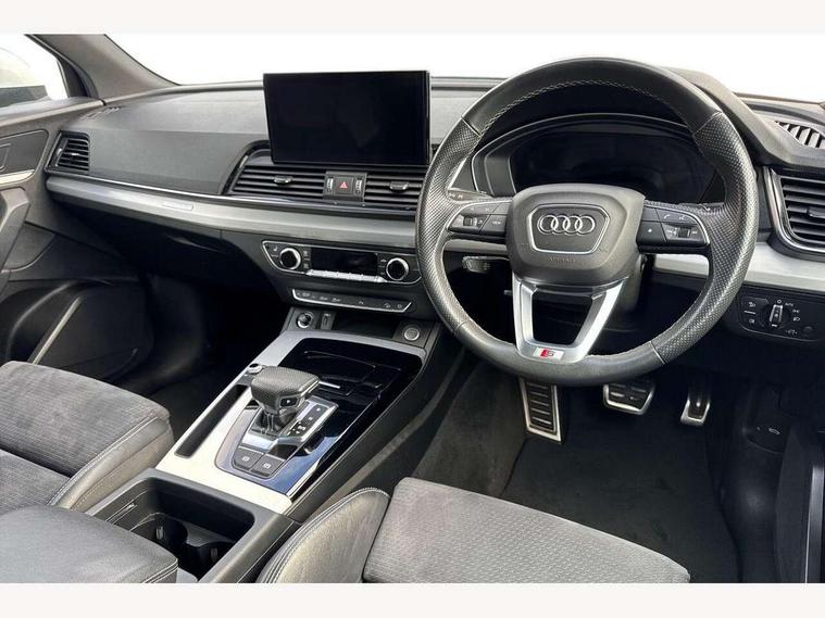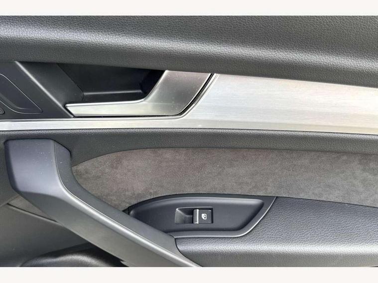 Audi connect safety and service (e-call), Audi connect with Amazon Alexa Integration, Audi drive select, Audi virtual cockpit plus with 12.3" screen and three different layout designs, Audi wireless smartphone interface, Automatic start-stop system with coasting functionality and efficiency programme, Bluetooth interface, Electro - mechanical power assisted steering, MMI navigation plus with 10.1" touch screen, Power tailgate, Reversing camera, Service interval indicator, Voice control system with Audi hotword activation "Hey Audi", Quattro on demand, S line sports suspension, DAB Digital radio, Acoustic windscreen, Aluminium roof rails, Audi matrix LED headlights with dynamic front and rear indicators, Auto dimming rear view mirror, Automatic headlights and windscreen wipers, Body colour bumpers, Body colour door mirrors, Body colour rear diffuser with matt aluminium silver surrounds, Body colour underbody protection, Chrome plated exhaust trims, Door sills in Selenite silver, Electric adjustable/heated/folding door mirrors, Front air inlet surrounds in aluminium, Front and rear electric windows, Front radiator grille in honeycomb design, Headlight washers, Lower bumpers painted in contrast Manhattan grey, Rear chrome trim strip below lights, Rear privacy glass and rear side windows, Rear spoiler, Rear wiper, Roof bars, S Line badges on the front wings, S Line front and rear bumpers, S Line side skirts, 2 x USB charging port with aux input socket, 3 rear headrests, 40:20:40 split folding rear seat with rear centre armrest, Black cloth headlining, Comfort front centre armrest, Contrast stitching on seats, steering wheel and gear lever gaiter, Deluxe 3 zone electronic climate control, Front/rear floor mats, Gear lever in black leather, Heated front seats, Height adjustable front head restraints, Height/reach adjustable steering column, Illuminated door sill trims with S logo, ISOFIX child seat mounting and top tether, Luggage compartment cover, Manual seat adjustment with 4-way electric lumbar support, Removable luggage compartment floor, Stainless steel pedals, Sunvisors with vanity mirrors, High gloss pack - Q5, LED interior light pack - Q5, 3 point seatbelts on all seats, 6 airbags - Driver, front passenger, curtain and side airbags, Electrically operated child locks on rear doors, Electromechanical parking brake, Electronic stabilisation control including ABS, ASR and EDL, Front passenger airbag deactivation, Hill descent control, Hill hold assist, Multi collision brake assist, Pop-up bonnet for pedestrian protection, Pre sense city, Seat belt force limiter, Seatbelt monitoring, Tyre pressure warning, Warning triangle and first aid kit, Anti theft alarm, Anti-theft wheel bolts, Keyless Go access/ignition system, Matt brushed aluminium inlays,