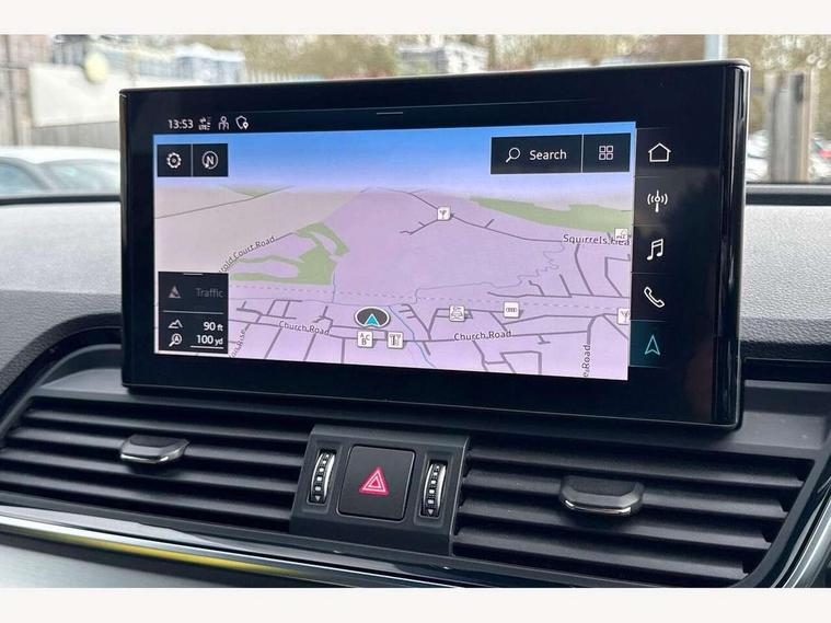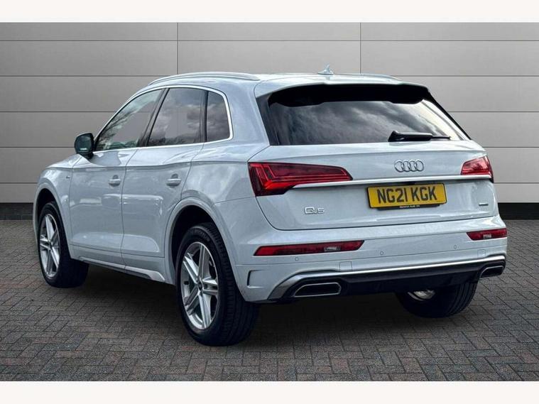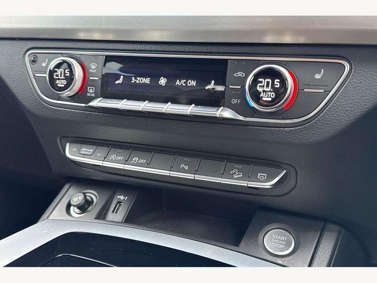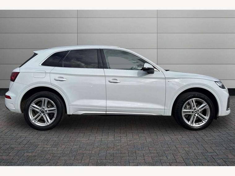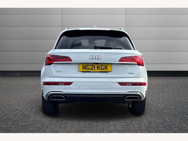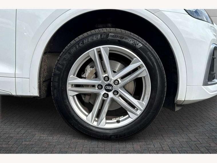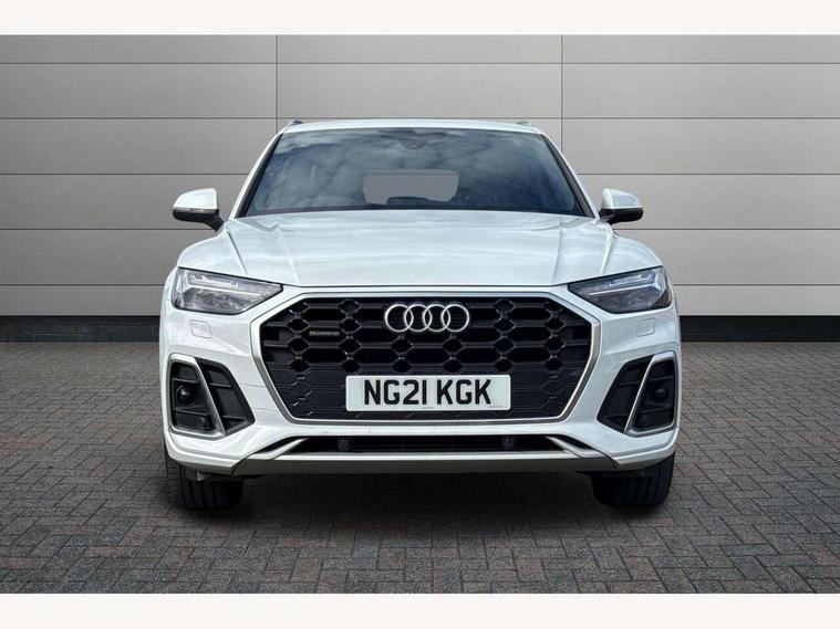 Audi connect safety and service (e-call), Audi connect with Amazon Alexa Integration, Audi drive select, Audi virtual cockpit plus with 12.3" screen and three different layout designs, Audi wireless smartphone interface, Automatic start-stop system with coasting functionality and efficiency programme, Bluetooth interface, Electro - mechanical power assisted steering, MMI navigation plus with 10.1" touch screen, Power tailgate, Reversing camera, Service interval indicator, Voice control system with Audi hotword activation "Hey Audi", Quattro on demand, S line sports suspension, DAB Digital radio, Acoustic windscreen, Aluminium roof rails, Audi matrix LED headlights with dynamic front and rear indicators, Auto dimming rear view mirror, Automatic headlights and windscreen wipers, Body colour bumpers, Body colour door mirrors, Body colour rear diffuser with matt aluminium silver surrounds, Body colour underbody protection, Chrome plated exhaust trims, Door sills in Selenite silver, Electric adjustable/heated/folding door mirrors, Front air inlet surrounds in aluminium, Front and rear electric windows, Front radiator grille in honeycomb design, Headlight washers, Lower bumpers painted in contrast Manhattan grey, Rear chrome trim strip below lights, Rear privacy glass and rear side windows, Rear spoiler, Rear wiper, Roof bars, S Line badges on the front wings, S Line front and rear bumpers, S Line side skirts, 2 x USB charging port with aux input socket, 3 rear headrests, 40:20:40 split folding rear seat with rear centre armrest, Black cloth headlining, Comfort front centre armrest, Contrast stitching on seats, steering wheel and gear lever gaiter, Deluxe 3 zone electronic climate control, Front/rear floor mats, Gear lever in black leather, Heated front seats, Height adjustable front head restraints, Height/reach adjustable steering column, Illuminated door sill trims with S logo, ISOFIX child seat mounting and top tether, Luggage compartment cover, Manual seat adjustment with 4-way electric lumbar support, Removable luggage compartment floor, Stainless steel pedals, Sunvisors with vanity mirrors, High gloss pack - Q5, LED interior light pack - Q5, 3 point seatbelts on all seats, 6 airbags - Driver, front passenger, curtain and side airbags, Electrically operated child locks on rear doors, Electromechanical parking brake, Electronic stabilisation control including ABS, ASR and EDL, Front passenger airbag deactivation, Hill descent control, Hill hold assist, Multi collision brake assist, Pop-up bonnet for pedestrian protection, Pre sense city, Seat belt force limiter, Seatbelt monitoring, Tyre pressure warning, Warning triangle and first aid kit, Anti theft alarm, Anti-theft wheel bolts, Keyless Go access/ignition system, Matt brushed aluminium inlays,