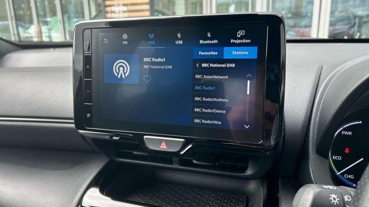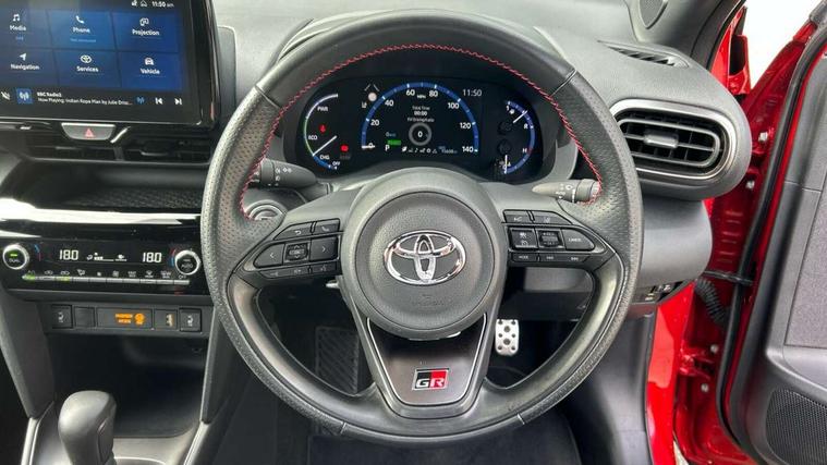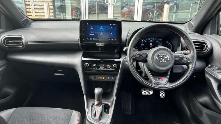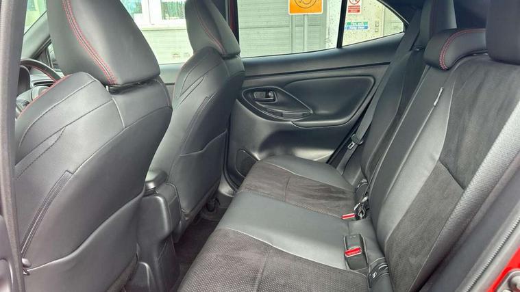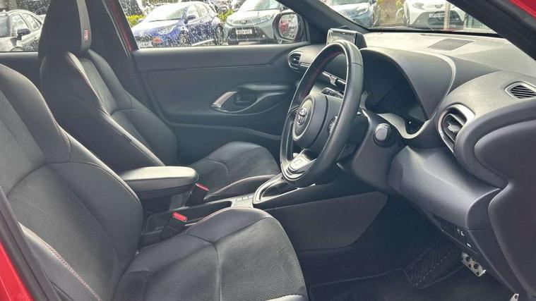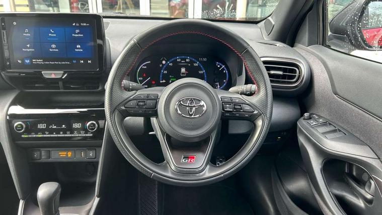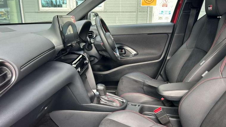 7" Multi information display screen, Adjustable speed limiter, Bluetooth connectivity, Driver attention alert system, eCall emergency system, Electric power steering, Full range intelligent adaptive cruise control, Hybrid system indicator, Key reminder warning, Lane trace assist, Multimedia, audio, telephone and voice recognition switches on steering wheel, My T Connected services, Pre-collision system enhanced with emergency steering assist, Reversing camera, Road sign assist - RSA, GR suspension tuning, Steering assisted vehicle stability control, 6 speakers, DAB Digital radio, USB connection, 3rd brake light, Acoustic windscreen glass, Aluminium roof rails, Anti-jam protection on power windows, Auto high beam [AHB] with on/off switch, Automatic headlights, Automatically retractable door mirrors, Black lower front grille, Black rear bumper, Black rear under run, Black Shark-fin antenna, Black wheel arch mouldings, Body colour door handles, Body colour front bumper, Dark chrome plated insert on upper front grille, Electric adjustable heated door mirrors, Electrochromatic auto dimming rear view mirror, Follow me home headlights, Front and rear electric windows with auto up/down function, Front intermittent wipers, Gloss black upper front grille, Headlight cut off reminder, Indicators integrated on door mirrors, Intermittent rear wiper, LED daytime running lights guide, LED front fog lights, LED front light guide, LED Indicators, LED projector headlights, LED rear light guide, Manual headlight levelling, Noise reduction layer on windscreen, Privacy glass, Rain sensor, Rear LED lights with sequential indicators, Rear side wing doors, Rear spoiler, Rear window defogger, 12v power outlet - front, 12V power point in boot, 2x Rear coat hooks, 3 seat bench in 2nd row, 3 spoke leather sports steering wheel, 40:20:40 split folding rear bench seat, Adjustable speed limiter switch on steering wheel, Black roof lining, Boot light, Central armrest, Centre console in light blue ambent lighting, Driver and front passenger personal lights, Driver and passenger seatback pockets, Dual zone automatic air conditioning, Fabric door trim, Footwell in light blue ambient lighting, Front console box, Front cup holders, Front head restraints, Front sport seats, Glovebox, GR scuff plates, Heated driver and passenger seats, Height adjustable driver's seat, Height adjustable front passenger seat, Hooks for luggage holding belts, ISOFIX child restraint system, Lane departure alert switch on steering control, Leather gearshift, Light blue ambient lighting on front doors, Light on driver and front passenger sun visor, Manual telescopic and tilting steering wheel, Mirror on driver and passenger sun visor, Nanoe-X air purifier, Perforated alcantara/leather upholstery, Pollen air filter, Power adjustable lumbar support on driver seat, Rear cup holders, Rear head restraints, Single front passenger seat, Soft tonneau cover, Storage box under boot floor, Tech pack - Yaris Cross, 3x3 point rear seat belts, ABS+EBD+Brake assist, Driver and passenger central airbags, Driver and passenger front airbags, Driver and passenger side airbags, Electronic parking brake, Emergency brake light system (EBS), Front seat belt reminder, Hill start assist control (HAC), Passenger airbag on/off switch, Pre-collision system with pedestrian and cyclist detection, Rear door child safety locks, Rear passenger side airbags, Rear seat belt reminder, Traction control, Tyre pressure warning system, Immobiliser, Intrusion alarm, Keyless smart entry with push button start, Power door locks, Power passenger window lock, Remote door lock, Tyre repair kit,