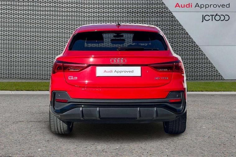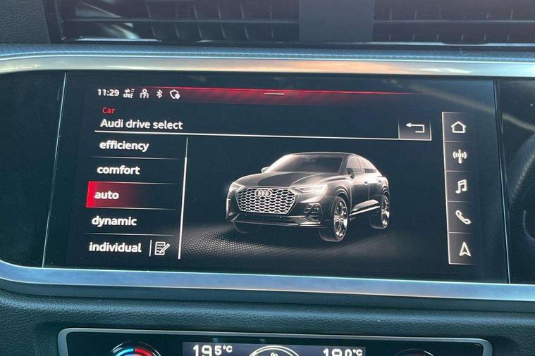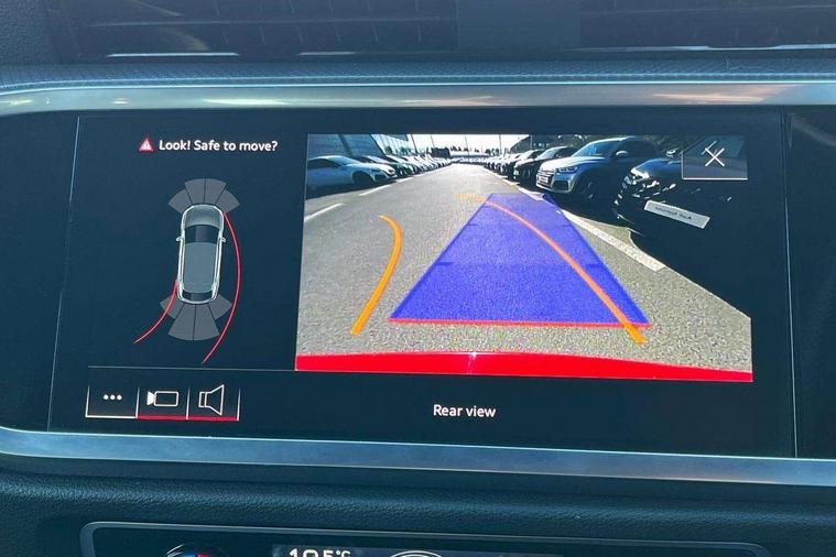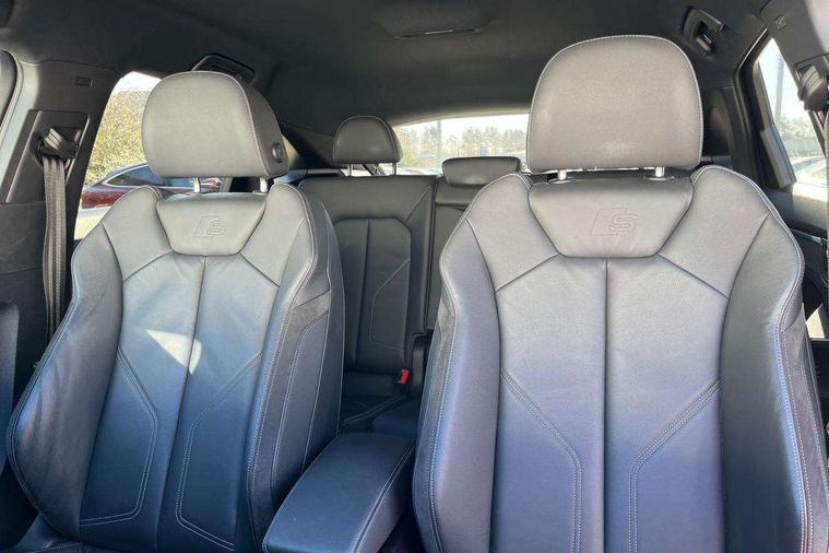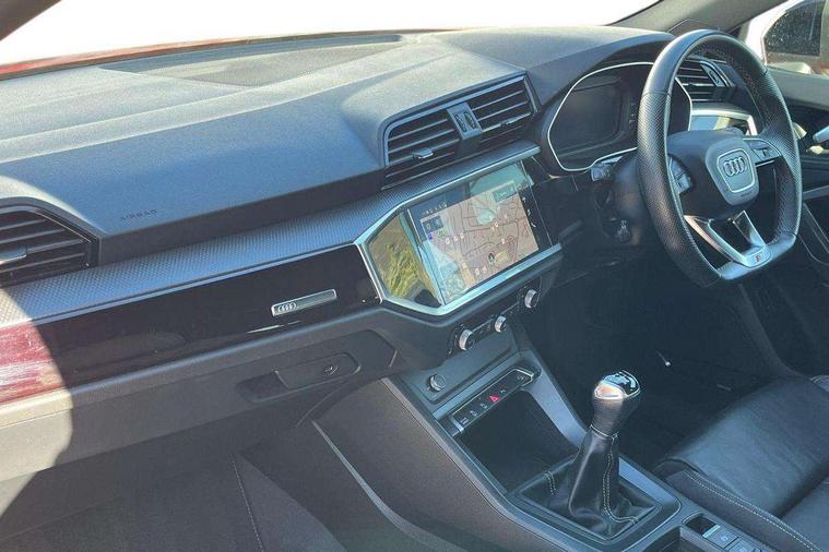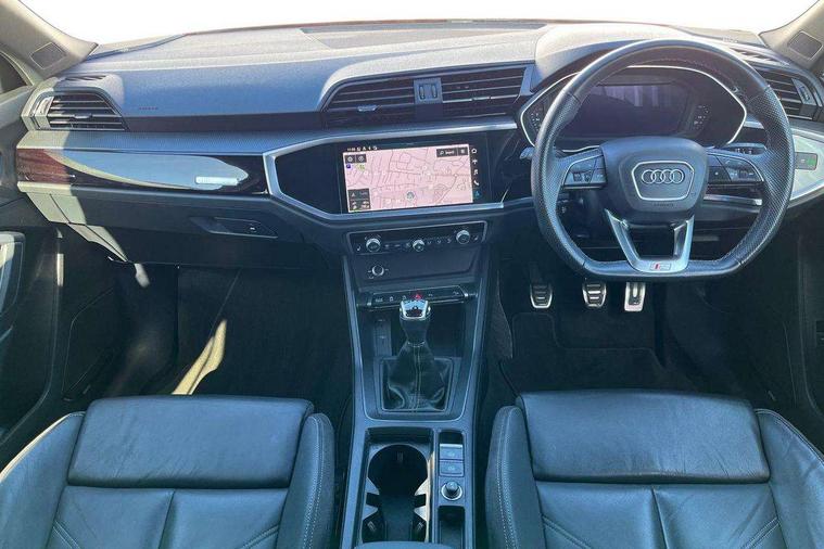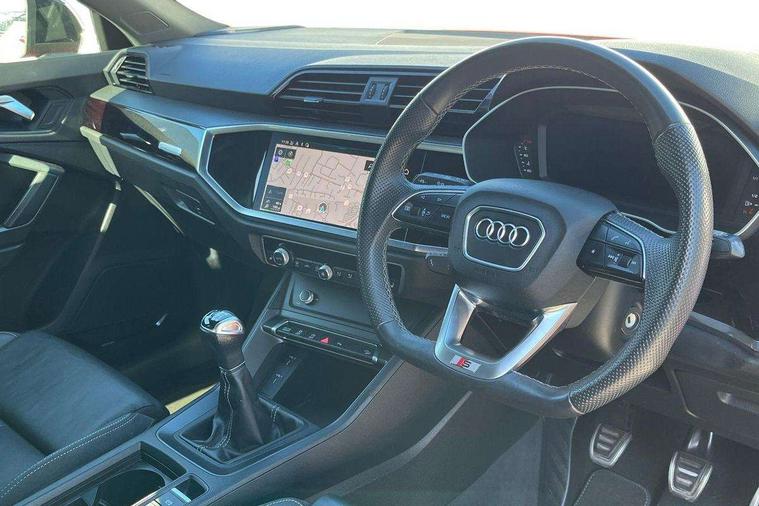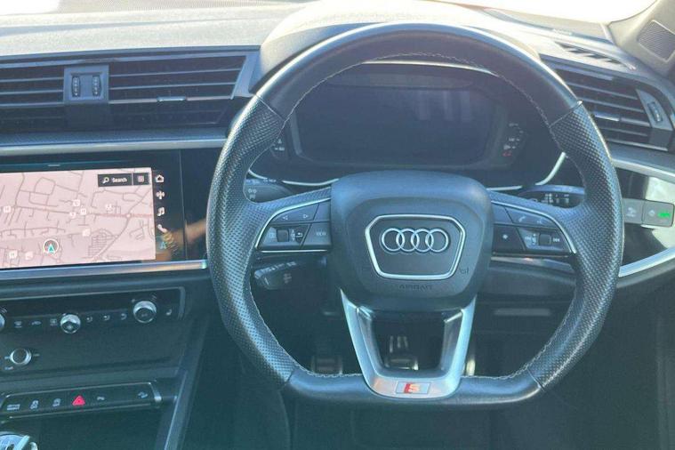 Amazon alexa Integration, Audi drive select, Audi lane departure warning, Audi Virtual Cockpit - 10.25" display, Bluetooth interface, Camera based traffic sign recognition, Cruise control + speed limiter, Legal emergency call, MMI Navigation Plus with high resolution 10.1 inch touchscreen colour display, Power operated tailgate, Progressive steering, Rear parking sensors, Service interval indicator, Smartphone interface includes wireless Apple carplay/Android Auto, Start stop system with recuperation, Voice control system with natural language interaction, Sports suspension, 2 USB-C ports with charge and data functions, 6 passive loudspeakers, DAB digital radio module, Acoustic windscreen, Auto dimming frameless rear view mirror, Black roof rails, Electrically folding, adjustable and heated door mirrors with integrated LED side indicators and kerb view function for passenger side, Front and rear electric windows, Front fog lights, Grille vertical bars in aluminium silver/Matt, High gloss black finish B and C pillars, LED Dynamic rear indicators, LED headlights with LED daytime running lights, LED rear lights, LED third brake light, Privacy glass dark tinted rear and rear-side windows (from B-pillar backwards), Rain and light sensors, Rear diffuser grille in grained matt black, Rear diffuser strip in matt titanium black, Rear side wing doors, Rear wiper, S line bumpers in contrasting Manhattan grey, Variable front intermittent wipers, 12V socket in rear centre console, 3 seat bench in 2nd row, 3 spoke flat bottomed multi-function leather sport steering wheel, 40:20:40 folding with manual adjustment for 60:40 forwards/backwards position and backrest angle, Adjustable rear seat bench/backrest with centre armrest and cupholder, Black cloth headlining, Dual zone electronic climate control, Front and rear black floor mats with contrast stitching in rock grey, Front and rear headrests, Front and rear roof module including reading lights, Front centre armrest, Glove compartment lighting, Height and reach adjustable steering wheel, Illuminated door sill trims with S logo, ISOFIX child seat mounting for front passenger with airbag deactivation and outer rear seat including top tether attachment point for outer rear seats, Luggage compartment light, Manual front seats with height adjustment, Perforated leather gearknob, Single front passenger seat, Stainless steel luggage compartment sill finisher, Stainless steel pedals, Ambient lighting pack - Q3, Black styling pack - Q3, Non smoking pack - Q3, 3x3 point rear seatbelts, 6 airbags - Driver, front passenger, curtain and side windows, Audi pre-sense front with pedestrain and cyclist recognition, Electrically operated child locks on rear doors, Electromechanical parking brake, Electronic stabilisation control including ABS, ASR and EDL, Front seatbelt reminder, Hill descent control, Hill hold assist, Pre sense basic, Seatbelt monitoring, Tyre pressure warning, Warning triangle and first aid kit, Anti theft alarm, Anti theft wheel bolts, Immobiliser, Remote central locking, Detail dashboard around MMI touch colour display in glass look, black with surround in aluminium look, Leatherette door armrest, Piano black inlay,