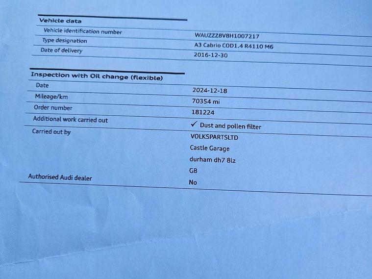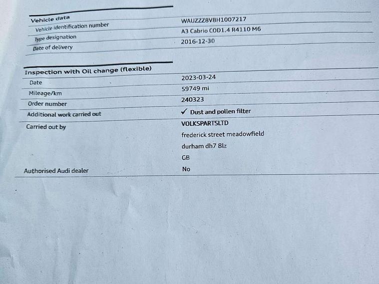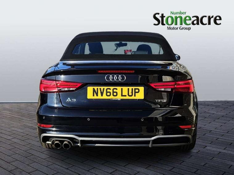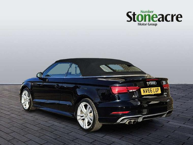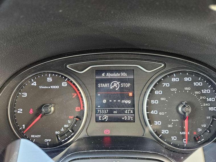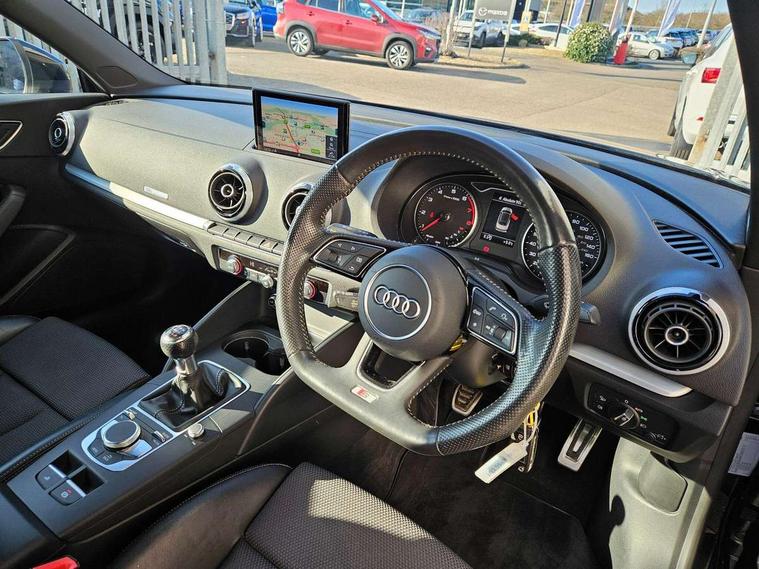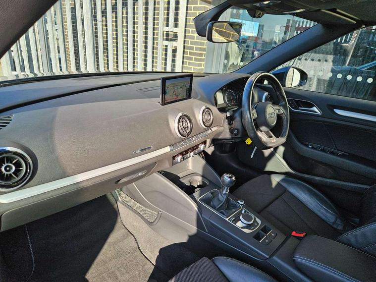 Audi connect, Audi drive select, Audi smartphone interface, Bluetooth interface, Colour driver's information system display, Service interval indicator, 2 USB ports, Audi music interface, DAB Digital radio, Aluminium side window trim, Automatic lights and wipers, Body colour bumpers, Body colour door mirrors with integral indicators, Chrome exhaust tailpipes, Electric operated/heated door mirrors, Front and rear electric windows, Fully automatic acoustic hood, Heated rear window, Heated windscreen washer jets, LED daytime running lights, S Line body styling, 2 height adjustable rear headrests, 3 spoke flat bottomed multi-function leather steering wheel, 4 lashing points to secure luggage, 50/50 split folding rear seat, Adjustable front armrest, Driver/passenger sunvisors, Dual zone electronic climate control, Front/rear floor mats, Height adjustable front seats, Height/reach adjustable steering column, Illuminated door sills, Illuminated glovebox, ISOFIX child seat preparation+airbag deactivation, Jack and tool kit, Perforated leather gearknob, Stainless steel pedals, Storage compartment in centre console, Storage compartments in doors, LED interior light pack - A3/RS3, Light and rain sensor pack - A3 Cabriolet, Storage pack - A3 Cabriolet/Saloon, 3 point seatbelts on all seats, ABS/EBD, Active bonnet, Active front headrests, ASR, Automatic roll over protection, Driver and passenger side airbags, Driver/Front Passenger airbags, Drivers knee airbag, EDL, Electromechanical parking brake, ESC - Electronic Stability Control + traction control, Front passenger airbag deactivation, Seatbelt warning, Tyre pressure monitor, Warning triangle and first aid kit, Anti theft alarm, Anti-theft wheel bolts, Immobiliser, Remote control central locking, Aluminium air vent surrounds, Aluminium trim elements, Space saver spare wheel,
