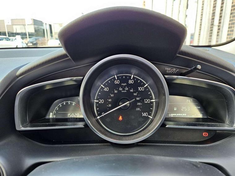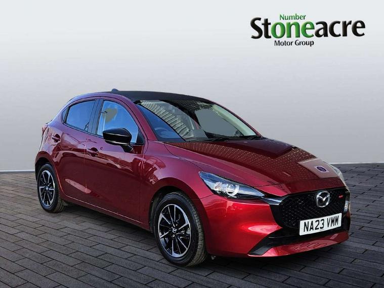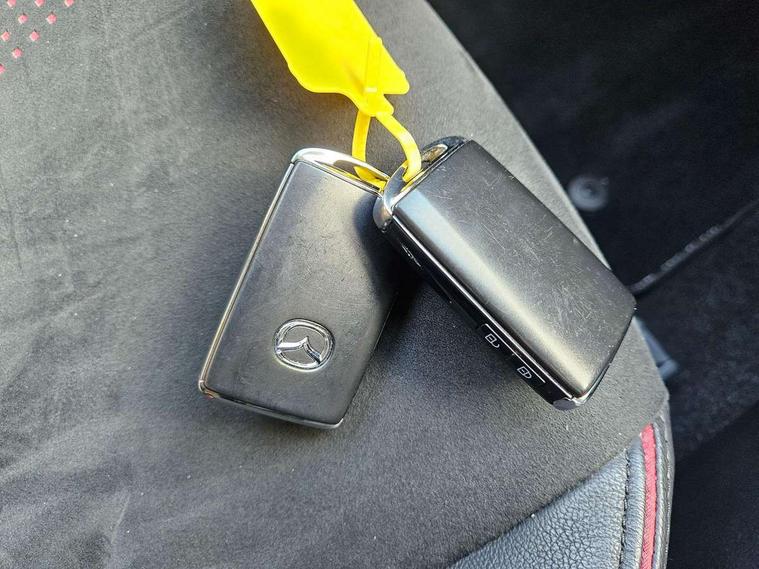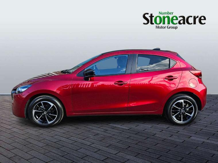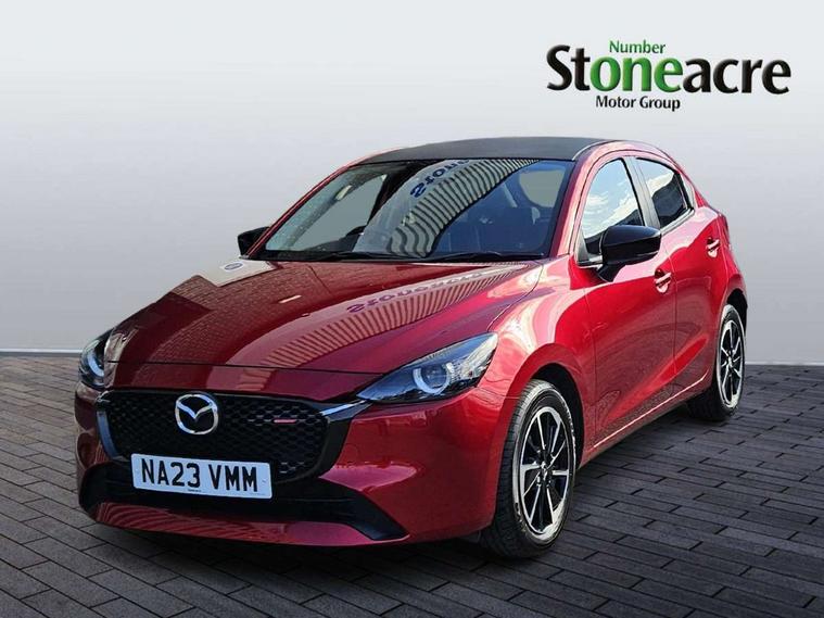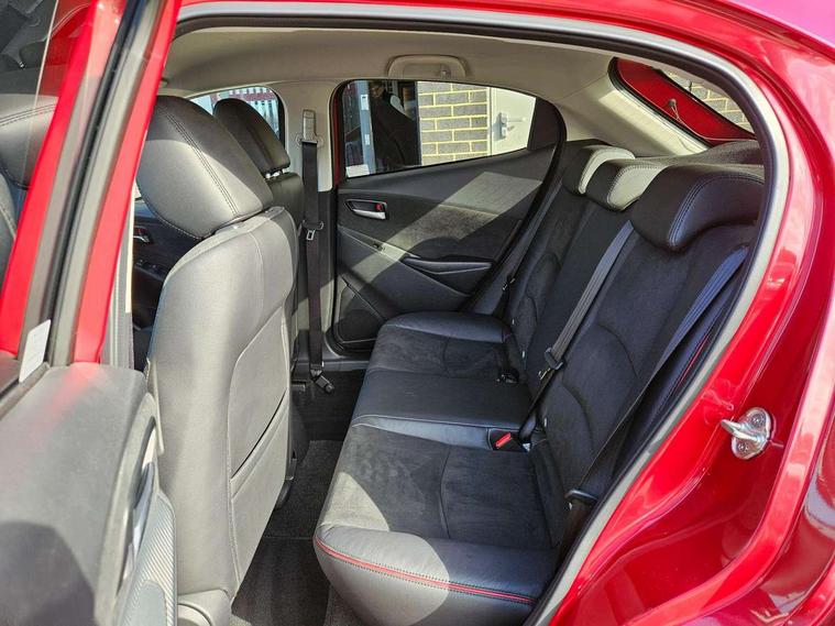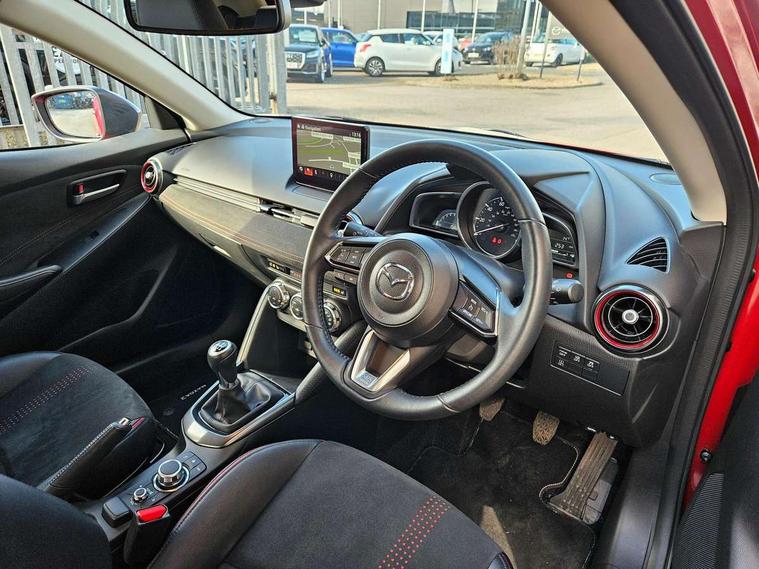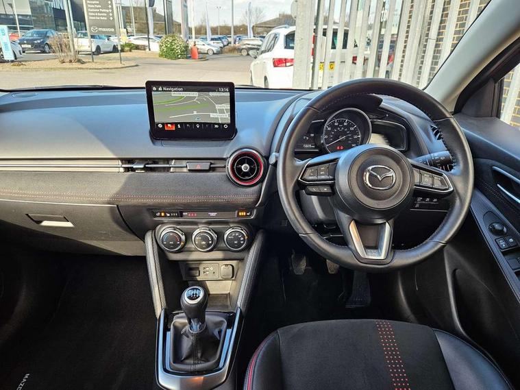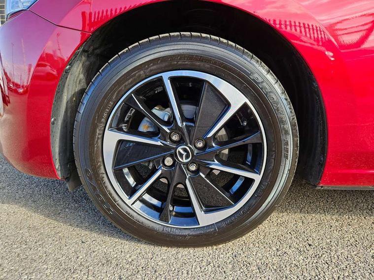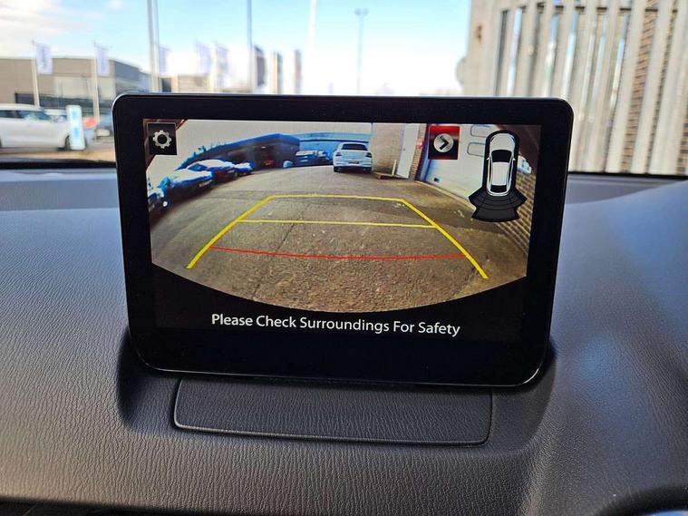 Adjustable speed limiter, Analogue rev counter, Cruise control, Digital instrument cluster, Digital speed display meter, E-call, Emergency stop signalling system, Engine start/stop button, Integrated bluetooth, Lane departure warning system, Lane keep assist, Mazda connect with 8" colour touch screen, Navigation system, PAS, Rear parking sensor with audible and visual warning, Reversing camera, Service indicator, Tailgate, Trip computer, Wireless Apple CarPlay and wired Android Auto, i-stop, Mazda M hybrid, AM/FM/DAB radio with 6 speakers with USB and AUX inputs, Multimedia Commander including separate volume dial, Steering wheel mounted audio/bluetooth controls, Auto dimming rear view mirror, Auto headlight levelling, Black carbon effect roof, Black door mirrors, Black Shark-fin antenna, Body coloured front bumper with black lower bezel, Body coloured rear bumper with black lower mouldings and red accent, Chrome exhaust tailpipes, Coming/leaving home lighting function, Dusk sensing headlights, Electric adjustable/heated/folding door mirrors, Electric front/rear windows with one touch auto up/down for driver's window, Front honeycomb grill with red accent, Gloss black finish signature wing, Heated rear window, LED Headlights, LED indicator lights, LED third brake light, Privacy glass, Rain sensing front wipers with adjustable sensitivity and speed, Rear side wing doors, Rear wiper, Signature LED daytime running lights, 3 seat bench in 2nd row, 60/40 split rear seats, Black/red air vent accents, Climate control air conditioning, Driver, Front passenger and two rear grab handles with coathooks, Drivers seat manual slide recline and height adjustment, Drivers/front passengers covered vanity mirrors and drivers ticket holder, Front centre storage with two cupholders, Front head restraints, Front passenger and driver door pockets, Front passenger seat manual slide, recline and height adjust, Front passenger seatback pockets, Gear shift indicator, Glovebox, Heated front seats with 3 stage setting, Heated leather steering wheel, Interior courtesy light with integrated spotlight, ISOFIX child seat anchorage points attached on outer rear seats, Leather gear knob, Leather handbrake, Leather/Cloth upholstery, Luggage compartment light, Single front passenger seat, Three height adjustable rear head restraints, Tilt/telescopic adjustable steering wheel, 2x3 point front seatbelts with pre-tensioners, 3 point seatbelts on all rear seats, Anti-lock braking system (ABS), Collision mitigation braking system, Dynamic stability control + Traction control, ESP, Front and rear curtain airbags, Front driver, passenger and rear seat seatbelt warning, Front dual stage driver and single stage front passenger airbags, Front side airbags, Front smart city brake support, G-Vectoring control plus, Hill launch assist, Manual child lock in rear doors, Passenger airbag cut-off switch, Tyre pressure monitoring system, Deadlocking system, Power door locks, Remote central locking, Smart keyless entry, Thatcham accredited alarm and immobiliser, Black soft touch dashboard panel with red stitching colour coordination, 16" Black metallic machined alloy wheels, Emergency tyre repair kit,