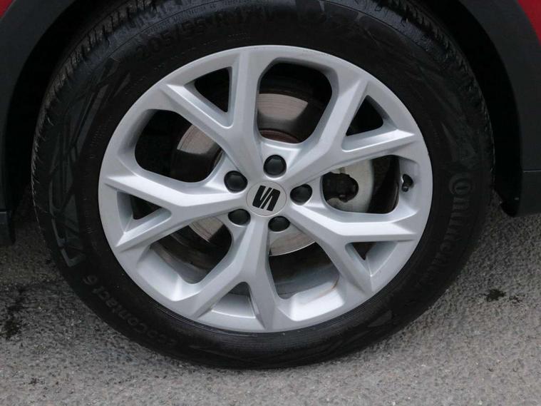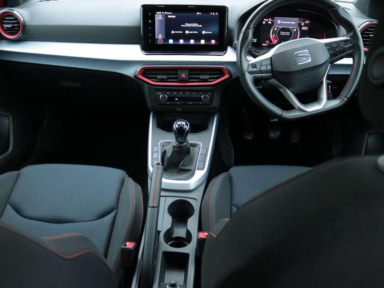 'Lights On' Reminder warning buzzer, 8" Digital cockpit, Digital clock, E-call, Electric speed sensitive power steering, Full Link Smartphone Integration with Mirror Link, Apple Car Play, Google Android Auto with USB Type C cable for Apple and Android compatibility, Lane keeping system, Low fuel warning light, Outside temperature display, Rear parking sensor, RPM counter, Seat connect with safety, service, remote and online, SEAT Drive profile - Four different models normal-sport-eco-individual, steering response, throttle response, Trip computer, Wireless phone charger, 9.2" colour touchscreen with navigation system, voice control and USB port (type c), Bluetooth interface for hands free and audio streaming, DAB digital radio and AM/FM radio, Steering wheel mounted audio controls, Anti theft roof antenna, Auto dimming interior rear view mirror, Automatic activation of hazard warning lights, Body coloured bumpers, Body coloured door handle inserts, Chrome roof rails and window surrounds, Dark tinted rear windows, Electric front/rear windows, Electrically adjustable, heated and folding door mirrors, Front fog lights with cornering function and rear fog light, FULL LED automatic headlights with dynamic headlight range control, coming and leaving home, LED daytime running lights, LED rear tail lights and licence plate lights, Protective side mouldings, Rain sensing wipers, Rear side wing doors, Rear spoiler, Rear window wash/wipe, Roof colour door mirrors, Third brake light, Twin exhaust pipe styling hidden exhaust pipe, Visible VIN plate, Windshield wiper with intermittent control and potentiometer, 2 cupholders, 3 seat bench in 2nd row, 60/40 split folding rear seat, Aircare filter, Black interior roof, Cloth upholstery, Double boot floor, Driver sunvisor with covered mirror + card holder, Dual zone climate control, Front courtesy light with 2x front and 2x rear reading lights, Front sport seats, Gear shift indicator, Height adjustable front seats, Height/reach adjustable steering column, Illuminated boot, Instrument lighting with brightness control, Interior ambient lighting, Interior light in footwell, central console and door panel, ISOFIX points in outer rear seats with top tether anchorage points, Passenger sunvisor with vanity mirror, Perforated flat bottomed leather steering wheel/gear knob/handbrake with red stitching and FR logo, Single front passenger seat, Two front and three rear height adjustable headrests, Interior chrome pack - Arona, 3 point seatbelts on all rear seats, ABS, Active front headrests, Child locks on rear doors, Driver and front passenger airbags with front passenger airbag de activation, front side and curtain airbags, Electronic stability control, Emergency Brake Assist (EBA) and front assist, Front and rear seatbelt reminder, Hill hold control, Multi-Collision braking, Tiredness recognition system, Traction control, Tyre pressure monitoring system, Alarm with back-up horn, Electronic engine immobiliser, Locking wheel bolts, Remote central locking + deadlocks, Tow away protection, Titan black dashboard, 17" Dynamic alloy wheels,