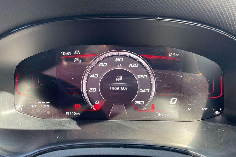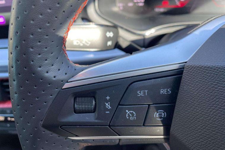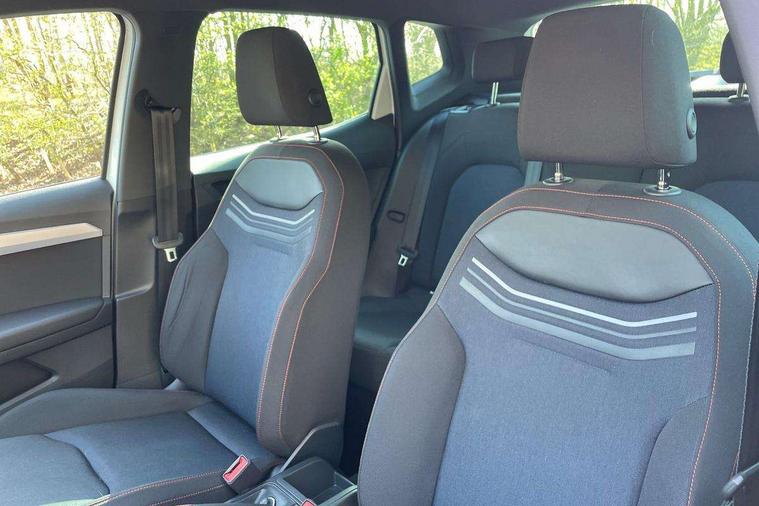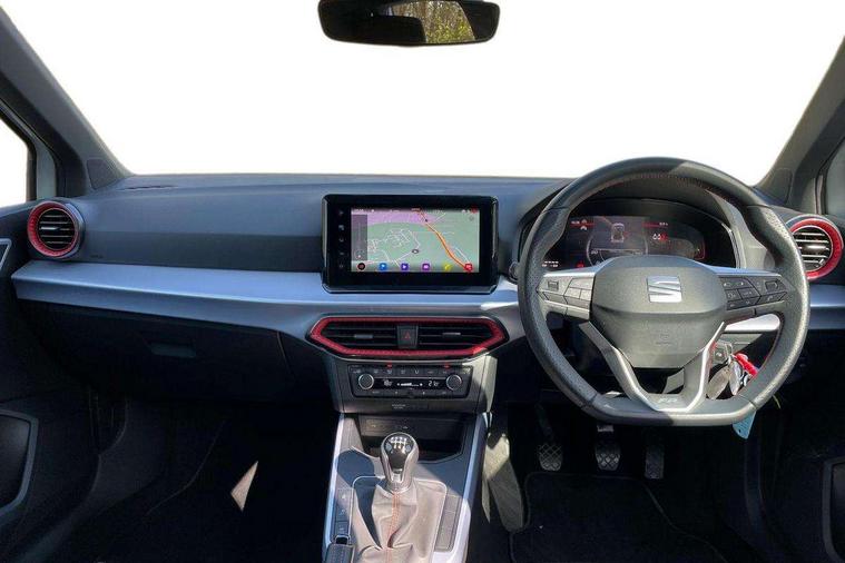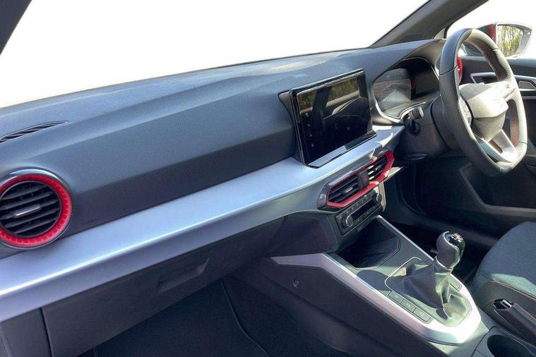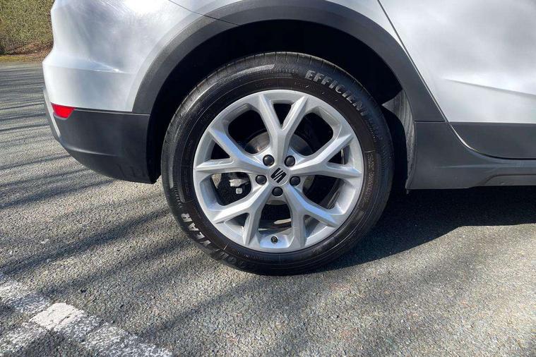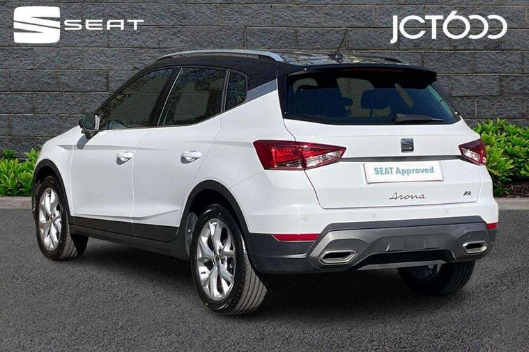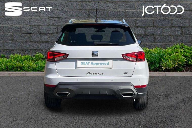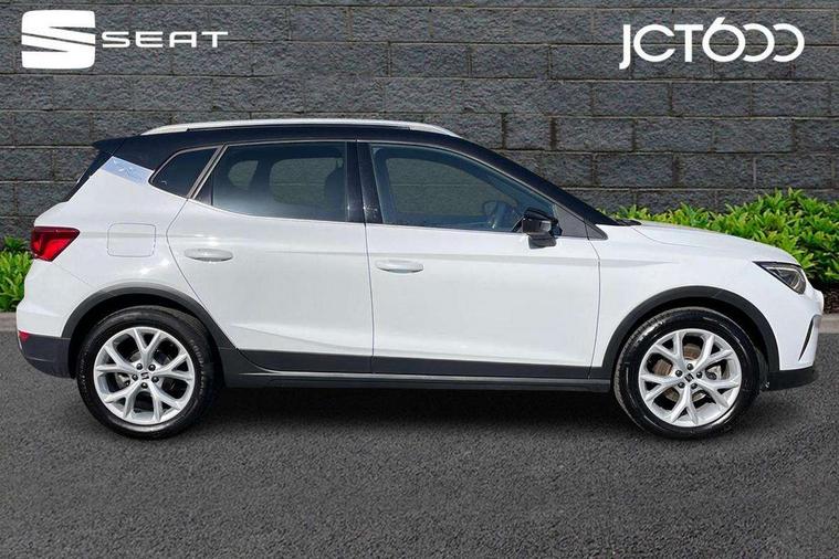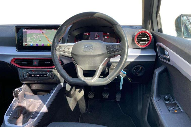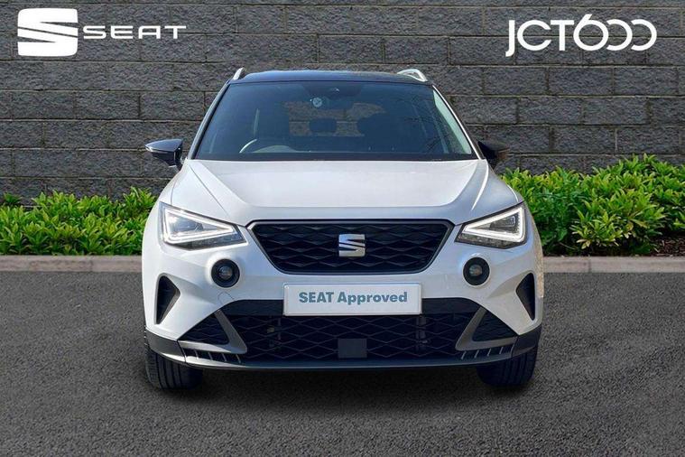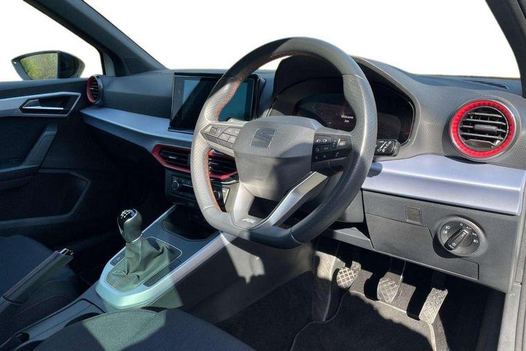 'Lights On' Reminder warning buzzer, 8" Digital cockpit, Digital clock, E-call, Electric speed sensitive power steering, Full Link Smartphone Integration with Mirror Link, Apple Car Play, Google Android Auto with USB Type C cable for Apple and Android compatibility, Lane keeping system, Low fuel warning light, Outside temperature display, Rear parking sensor, RPM counter, Seat connect with safety, service, remote and online, SEAT Drive profile - Four different models normal-sport-eco-individual, steering response, throttle response, Trip computer, Wireless phone charger, 9.2" colour touchscreen with navigation system, voice control and USB port (type c), Bluetooth interface for hands free and audio streaming, DAB digital radio and AM/FM radio, Steering wheel mounted audio controls, Anti theft roof antenna, Auto dimming interior rear view mirror, Automatic activation of hazard warning lights, Body coloured bumpers, Body coloured door handle inserts, Chrome roof rails and window surrounds, Dark tinted rear windows, Electric front/rear windows, Electrically adjustable, heated and folding door mirrors, Front fog lights with cornering function and rear fog light, FULL LED automatic headlights with dynamic headlight range control, coming and leaving home, LED daytime running lights, LED rear tail lights and licence plate lights, Protective side mouldings, Rain sensing wipers, Rear side wing doors, Rear spoiler, Rear window wash/wipe, Roof colour door mirrors, Third brake light, Twin exhaust pipe styling hidden exhaust pipe, Visible VIN plate, Windshield wiper with intermittent control and potentiometer, 2 cupholders, 3 seat bench in 2nd row, 60/40 split folding rear seat, Aircare filter, Black interior roof, Cloth upholstery, Double boot floor, Driver sunvisor with covered mirror + card holder, Dual zone climate control, Front courtesy light with front reading lights, Front sport seats, Gear shift indicator, Height adjustable front seats, Height/reach adjustable steering column, Illuminated boot, Instrument lighting with brightness control, Interior ambient lighting, Interior light in footwell, central console and door panel, ISOFIX points in outer rear seats with top tether anchorage points, Passenger sunvisor with vanity mirror, Perforated flat bottomed leather steering wheel/gear knob/handbrake with red stitching and FR logo, Single front passenger seat, Two front and three rear height adjustable headrests, Interior chrome pack - Arona, 3 point seatbelts on all rear seats, ABS, Active front headrests, Child locks on rear doors, Driver and front passenger airbags with front passenger airbag de activation, front side and curtain airbags, Electronic stability control, Emergency Brake Assist (EBA) and front assist, Front and rear seatbelt reminder, Hill hold control, Multi-Collision braking, Tiredness recognition system, Traction control, Tyre pressure monitoring system, Alarm with back-up horn, Electronic engine immobiliser, Locking wheel bolts, Remote central locking + deadlocks, Tow away protection, Titan black dashboard, 17" Dynamic alloy wheels,