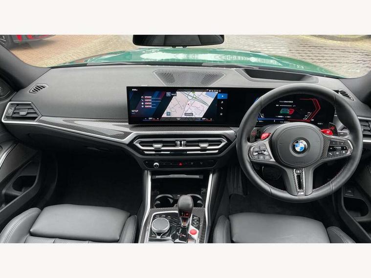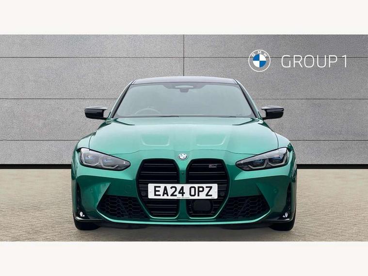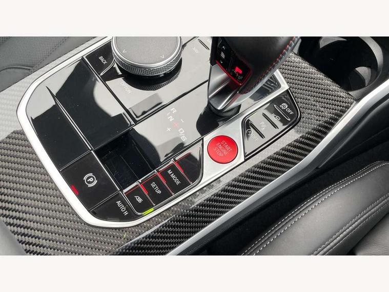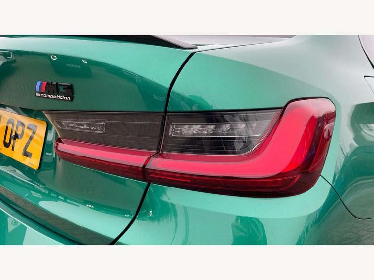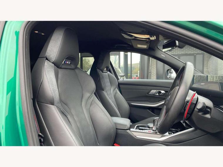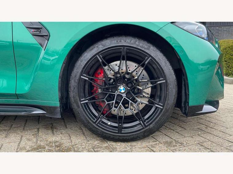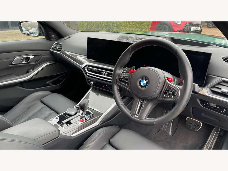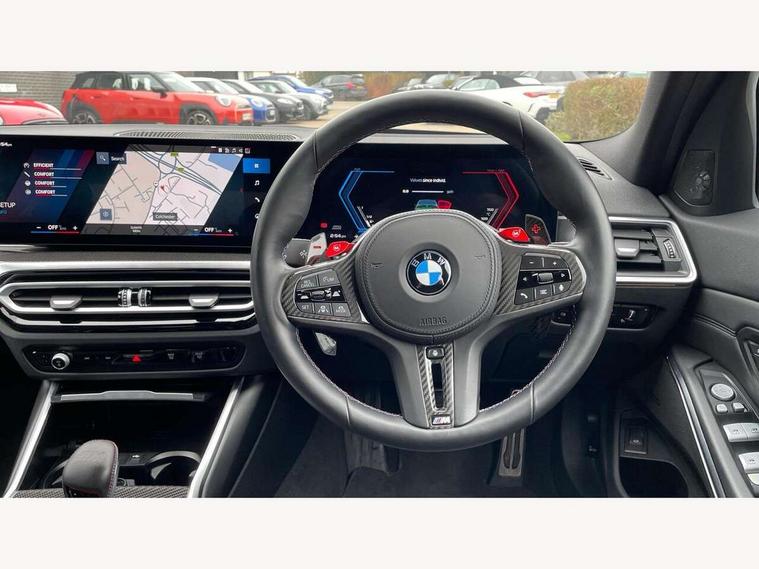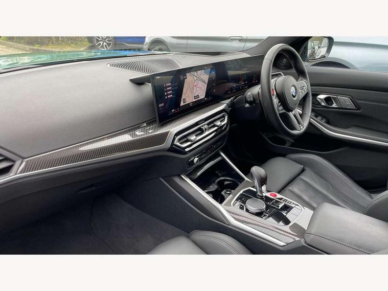 Active guard plus, Automatic start/stop system, Bluetooth functionality with Apple CarPlay/Android Auto, BMW ConnectedDrive online services, BMW iDrive controller on centre console, BMW legal emergency call, BMW Live Cockpit Professional sat nav system with 12.3" instrument display and high resolution control display, BMW Online services, BMW Teleservices, Brake pad wear indicator warning light, Condition based service, Door/boot open warning light, Driving experience switch, Head up Display, Illuminated control elements, Instrument cluster with extended contents, Lights on warning, M drive buttons, Oil sensor for level and grade, warning by check control system, Oil temperature gauge, On board computer, On board diagnostics, Optimum shift indicator, Outside temperature display, Pull away assistant, Run flat indicator, Service interval indicator, Shifting point display, Speed limiter, Variable sport steering, Widescreen display, Adaptive M Sport suspension, Double joint spring strut front axle, Electronic differential lock control (EDLC), M Drive Professional including track mode, laptimer, traction control & Drift analyser, M Sport differential, M steptronic sport transmission with drivelogic, Safety battery terminal clamp, 8 programmable favourite buttons, Auxiliary point for auxiliary devices, BMW professional radio/CD/MP3, DAB Digital radio, Harman/Kardon loudspeaker system, 3rd brake light, Acoustic glazing, Auto dimming driver's door mirror, Auto dimming rear view mirror, Automatic headlights + automatic windscreen wipers, Automatic parking function on front passenger's exterior mirror, Black chrome exhaust tailpipes, Black model designation badges, BMW emblem on engine compartment lid and tailgate, BMW high gloss shadow line with extended contents, BMW Individual shadowline lights, Body colour bumpers, Carbon fibre reinforced plastic (CFRP) roof with high gloss black roof aerial bulge and roof mouldings, Day time running light, Door mirror integrated indicators, Door sill finishers with aluminium inserts, Dynamic brake lights, Electric adjustable heated door mirrors, Electric folding door mirrors, Electric front and rear windows with one touch/convenient open/close function, Follow me home headlights, Front and rear apron plastic in body colour, Front and rear bumper system, Headlight beam throw control, Heat protection, sun protection glazing, Heated rear window with automatic switch off, Heated washer jets, High beam assistant, High gloss black frameless kidney grille with M badge, High gloss black lower bumper edges, side sills and diffuser edge binding, Illuminated bow type door handles in body colour drivers side with door lock, LED number plate light, LED tail lights with 3D L-shaped LED light design, M designation, M Sport entry door sill strips, Mirror glass aspheric on driver's side, convex on passenger side, Rear boot, Rear fog lights, Rear reflectors, Rear right M3 competition inscription, Rear side wing doors, Reversing light, Shark fin roof aerial, Strakes in front side panel, black matt/black high-gloss, with model badge, Visible VIN plate, Welcome lighting, 2 front cupholder in centre console with clamping elements and matt black inlay, 2 x 12 V Power sockets (luggage compartment and front centre console), 2 x USB Type C ports for charging and data transmission in front centre console, 3 folding rear headrests, 3 seat bench in 2nd row, Ambient inside door handle light, Ambient lighting for instrument panel, Ambient lighting for storage compartment, Ambient lighting front and rear, Ambient lighting in door panels, Anthracite headlining, Battery in luggage compartment, Carbon fibre centre console incl. cover for cupholders and storage compartment, Carbon fibre decorative steering wheel finishers, Carbon fibre shift paddles, Carbon fibre strip in instrument panel on front passenger side, Centre console armrest with storage compartment, Compartment in front of cupholder, Driver/passenger sunvisors with illuminated vanity mirrors + covers, Dynamic ambient interior lighting, Electric front seats + driver memory, English handbook, Floor mats in velour, Folding rear centre armrest with 2 cupholders, Footwell lighting, Front and rear door exit lights, Front door storage bins with bottle holder, Front interior light, Front isofix attachment + airbag deactivation, Front seat backrest width adjustment, Front seats lumbar support, Front/rear door armrests, Gearshift lever with embossed M badge, Heated front seats, Height adjustable front headrests, Interior mirror lighting, Isofix on 2nd row outer seats, Lockable/illuminated glovebox, Luggage compartment lighting, Manual 40:20:40 split folding rear seat with two tilt positions for backrest, Multifunction steering wheel, Rake/reach adjustable steering wheel, Single front passenger seat, Storage compartment in rear doors, Three zone automatic air conditioning, Through loading system, Toolkit located in luggage compartment, Wireless charging tray, Additional storage compartment pack - M3, Connected package professional - M3, High gloss shadowline exterior trim pack - M3, 3 point seatbelts on all seats, ABS/EBD, Automatic Stability Control (ASC), Brake energy regeneration, Brake fade compensation, Compound structure brake discs, Cornering brake control (CBC), Crash sensor, Driver/Front Passenger airbags, Dry braking, Dynamic brake control, Dynamic Stability Control with M Dynamic mode, Dynamic Traction Control - DTC, Electromechanical parking brake, Front and rear head airbags, Front seat side impact airbags, Front seatbelt pretensioners + load limiters, Hill start assist, M Sport seat belts, Rear child proof door locks, Seat occupancy detection for driver and passenger side, Seatbelt warning, Side impact protection, Two tone horn, Tyre pressure sensor, Warning triangle and first aid kit, Centre lock switch, Closing system with central locking, Digital key, Electronic immobiliser, Thatcham cat 1 remote alarm, Vehicle Key with 4 butt