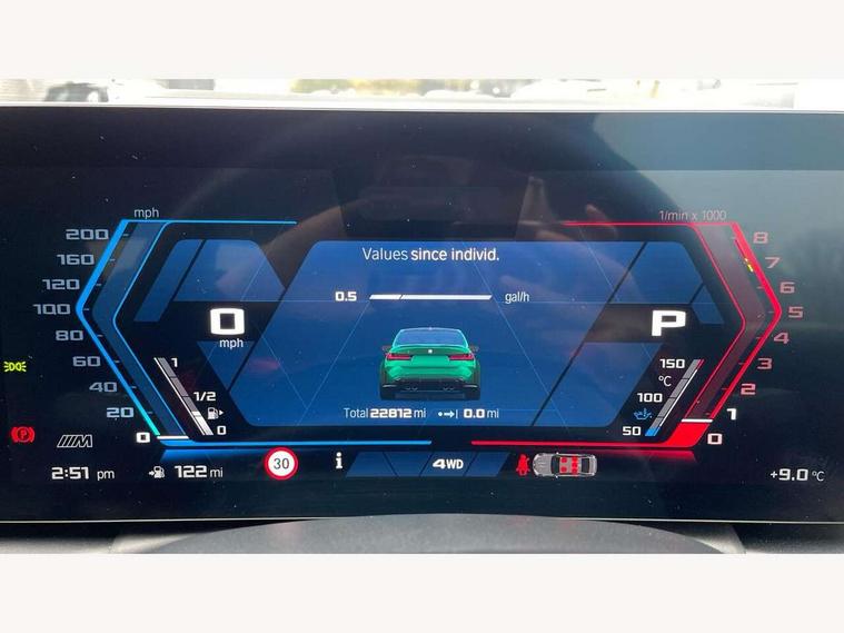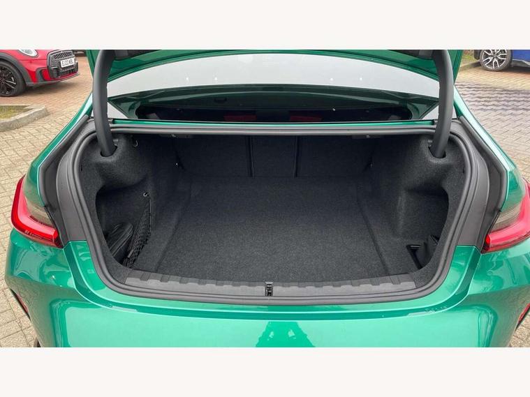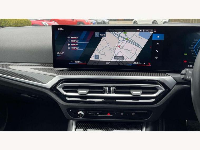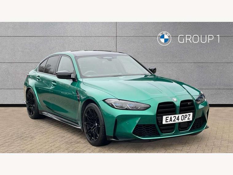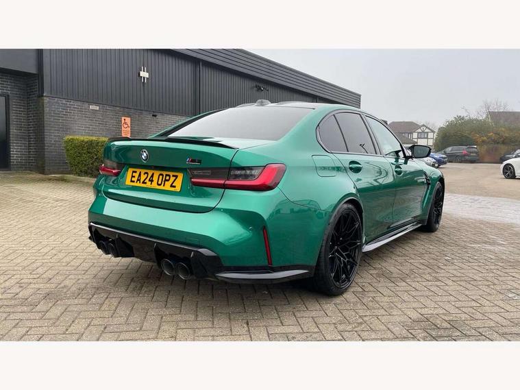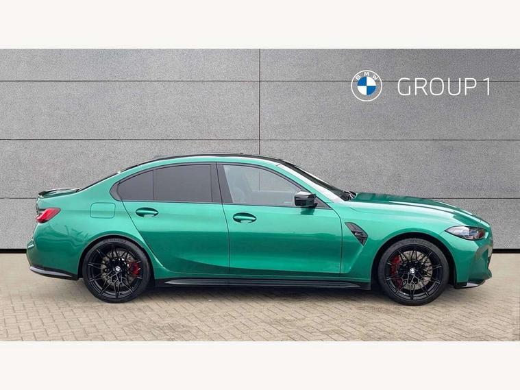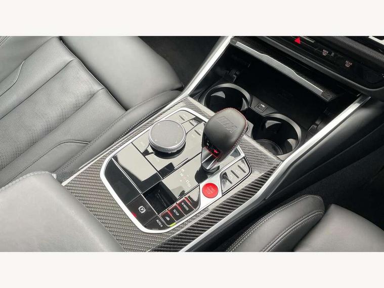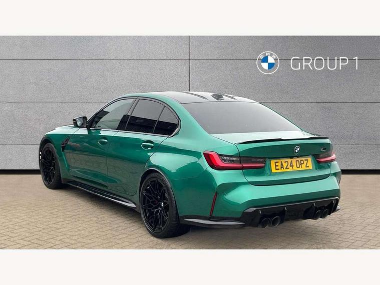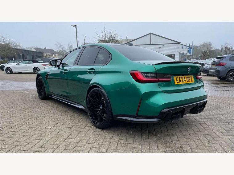 Active guard plus, Automatic start/stop system, Bluetooth functionality with Apple CarPlay/Android Auto, BMW ConnectedDrive online services, BMW iDrive controller on centre console, BMW legal emergency call, BMW Live Cockpit Professional sat nav system with 12.3" instrument display and high resolution control display, BMW Online services, BMW Teleservices, Brake pad wear indicator warning light, Condition based service, Door/boot open warning light, Driving experience switch, Head up Display, Illuminated control elements, Instrument cluster with extended contents, Lights on warning, M drive buttons, Oil sensor for level and grade, warning by check control system, Oil temperature gauge, On board computer, On board diagnostics, Optimum shift indicator, Outside temperature display, Pull away assistant, Run flat indicator, Service interval indicator, Shifting point display, Speed limiter, Variable sport steering, Widescreen display, Adaptive M Sport suspension, Double joint spring strut front axle, Electronic differential lock control (EDLC), M Drive Professional including track mode, laptimer, traction control & Drift analyser, M Sport differential, M steptronic sport transmission with drivelogic, Safety battery terminal clamp, 8 programmable favourite buttons, Auxiliary point for auxiliary devices, BMW professional radio/CD/MP3, DAB Digital radio, Harman/Kardon loudspeaker system, 3rd brake light, Acoustic glazing, Auto dimming driver's door mirror, Auto dimming rear view mirror, Automatic headlights + automatic windscreen wipers, Automatic parking function on front passenger's exterior mirror, Black chrome exhaust tailpipes, Black model designation badges, BMW emblem on engine compartment lid and tailgate, BMW high gloss shadow line with extended contents, BMW Individual shadowline lights, Body colour bumpers, Carbon fibre reinforced plastic (CFRP) roof with high gloss black roof aerial bulge and roof mouldings, Day time running light, Door mirror integrated indicators, Door sill finishers with aluminium inserts, Dynamic brake lights, Electric adjustable heated door mirrors, Electric folding door mirrors, Electric front and rear windows with one touch/convenient open/close function, Follow me home headlights, Front and rear apron plastic in body colour, Front and rear bumper system, Headlight beam throw control, Heat protection, sun protection glazing, Heated rear window with automatic switch off, Heated washer jets, High beam assistant, High gloss black frameless kidney grille with M badge, High gloss black lower bumper edges, side sills and diffuser edge binding, Illuminated bow type door handles in body colour drivers side with door lock, LED number plate light, LED tail lights with 3D L-shaped LED light design, M designation, M Sport entry door sill strips, Mirror glass aspheric on driver's side, convex on passenger side, Rear boot, Rear fog lights, Rear reflectors, Rear right M3 competition inscription, Rear side wing doors, Reversing light, Shark fin roof aerial, Strakes in front side panel, black matt/black high-gloss, with model badge, Visible VIN plate, Welcome lighting, 2 front cupholder in centre console with clamping elements and matt black inlay, 2 x 12 V Power sockets (luggage compartment and front centre console), 2 x USB Type C ports for charging and data transmission in front centre console, 3 folding rear headrests, 3 seat bench in 2nd row, Ambient inside door handle light, Ambient lighting for instrument panel, Ambient lighting for storage compartment, Ambient lighting front and rear, Ambient lighting in door panels, Anthracite headlining, Battery in luggage compartment, Carbon fibre centre console incl. cover for cupholders and storage compartment, Carbon fibre decorative steering wheel finishers, Carbon fibre shift paddles, Carbon fibre strip in instrument panel on front passenger side, Centre console armrest with storage compartment, Compartment in front of cupholder, Driver/passenger sunvisors with illuminated vanity mirrors + covers, Dynamic ambient interior lighting, Electric front seats + driver memory, English handbook, Floor mats in velour, Folding rear centre armrest with 2 cupholders, Footwell lighting, Front and rear door exit lights, Front door storage bins with bottle holder, Front interior light, Front isofix attachment + airbag deactivation, Front seat backrest width adjustment, Front seats lumbar support, Front/rear door armrests, Gearshift lever with embossed M badge, Heated front seats, Height adjustable front headrests, Interior mirror lighting, Isofix on 2nd row outer seats, Lockable/illuminated glovebox, Luggage compartment lighting, Manual 40:20:40 split folding rear seat with two tilt positions for backrest, Multifunction steering wheel, Rake/reach adjustable steering wheel, Single front passenger seat, Storage compartment in rear doors, Three zone automatic air conditioning, Through loading system, Toolkit located in luggage compartment, Wireless charging tray, Additional storage compartment pack - M3, Connected package professional - M3, High gloss shadowline exterior trim pack - M3, 3 point seatbelts on all seats, ABS/EBD, Automatic Stability Control (ASC), Brake energy regeneration, Brake fade compensation, Compound structure brake discs, Cornering brake control (CBC), Crash sensor, Driver/Front Passenger airbags, Dry braking, Dynamic brake control, Dynamic Stability Control with M Dynamic mode, Dynamic Traction Control - DTC, Electromechanical parking brake, Front and rear head airbags, Front seat side impact airbags, Front seatbelt pretensioners + load limiters, Hill start assist, M Sport seat belts, Rear child proof door locks, Seat occupancy detection for driver and passenger side, Seatbelt warning, Side impact protection, Two tone horn, Tyre pressure sensor, Warning triangle and first aid kit, Centre lock switch, Closing system with central locking, Digital key, Electronic immobiliser, Thatcham cat 1 remote alarm, Vehicle Key with 4 butt