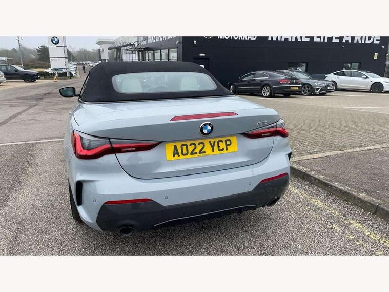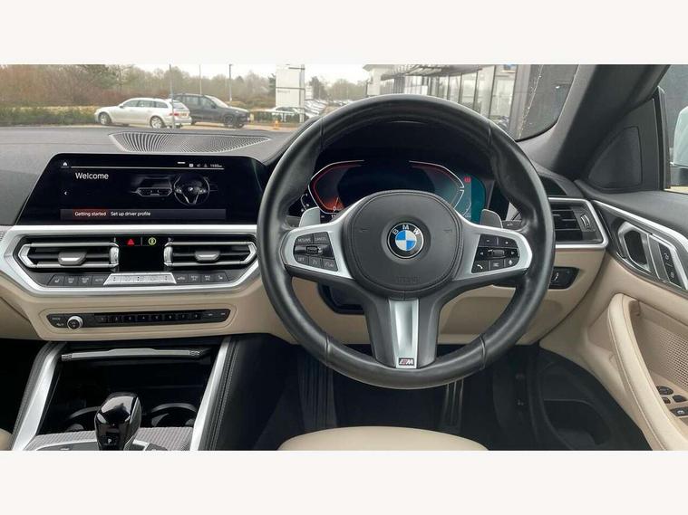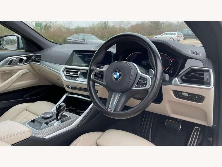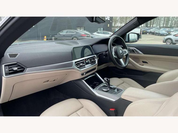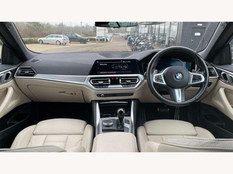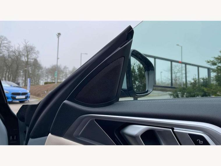 Active guard plus, Attentiveness assist, Auto start-stop, BMW ConnectedDrive online services, BMW iDrive controller on centre console, BMW Live Cockpit Professional Nav with 12.3" instrument display + 10.25" display, Intelligent Voice Assist, BMW OS 7, HDD, 2USB, 4G LTE connect, BMW service history, BMW Teleservices, Brake pad wear indicator in front and rear, Check Control warning system for monitoring of lights and door/luggage compartment open warning, Condition based service, Cruise control with brake assist, Electric power steering with Servotronic steering optimised at all speed ranges, Gearshift time display in manual mode, Instrument cluster with speedometer with mph readout, tachometer, fuel gauge and oil temperature gauge, Integrated owners handbook, Oil sensor for level and grade, warning by check control system, On board computer - average speed, fuel consumption, outside temp display with acoustic warning, clock/date, service interval, odometer/trip meter, Optimum shift indicator, Variable sport steering, 8 speed automatic steptronic transmission with gearshift paddles, Balanced 50/50 weight distribution, Double VANOS, Drive performance control - ECO PRO, comfort and sport modes, Electronic differential lock control (EDLC), High precision injection, Low centre of gravity, M sport suspension, Petrol Particulate Filter, Stroke dependent dampers, VALVETRONIC engine management, DAB tuner, Electronic service booklet, Acoustic glazing, Automatic headlight beam throw control with load dependent regulating reaction, dynamic compensation of braking dive and acceleration squat, Automatic windscreen wipers and automatic headlight, Automatically dimming electrochromatic rear view mirror, BMW emblem on engine compartment lid and tailgate, BMW kidney grille with mesh grille front side of the nuggets in matt aluminium and frame in chrome high gloss, Body colour fuel filler flap, Body colour roof fin, Brushed aluminium inserts in the front door sill finishers with BMW designation, Dynamic brake lights, Electric windows - front and rear, with open/close fingertip control, anti trap facility and comfort closing function all round, Exhaust tailpipe - split left and right, Exterior mirrors - electrically folding with anti-dazzle, Fading support, Follow me home headlights, Front and rear bumper system, Front apron plastic in body colour, Green tinted heat protection glazing, High gloss shadow line exterior trim, Illuminated bow type door handles in body colour drivers side with door lock, Interior rear view electrochromatic mirror with automatic anti dazzle function, LED daytime running lights, LED front fog lights, Licence plate panel integrated into front bumper and tailgate, Lightweight engineering, M designation on front side panels, left and right, Model designation on right side of tailgate, One piece front bumper cover including towing eye cover in body colour, Preparation for high beam assistant, Rear boot, Reversing light, Side frame decorative moulding black matt, Third brake light, Two part LED tailights in L-shape with components in smoked glass, brake light, LED turn indicator and rear fog light, Visible VIN plate, Welcome lights in interior and door handle area, Widened track and increased camber values for max transverse dynamics, agility and steering precision, Window recess cover black high gloss, Windscreen wipers with integrated heated washing jets, 12V power socket in front centre console, 2 2nd row folding seats, 2 front cupholder in centre console with clamping elements and matt black inlay, 2 Rear seat headrests, 2nd row centre armrest with built-in cupholders, 3 spoke M sport leather multifunction steering wheel, 3 zone automatic air conditioning, 4 pieces lashing eyelets in luggage compartment, Ambient lighting with welcome carpet light, Armrest integrated in front and rear door trim + front centre console armrest, Electric seat adjustment with memory, Four grab handles integrated in roof lining, Front and rear door pockets, Front and rear footwell lights, Front and rear reading lights, Front headrests, Front sport seats, Heated driver and front passenger seats, Height adjustable mechanically and infinitely variable steering column, Illuminated armrest storage compartment, Illuminated glove compartment with separate small compartment, Luggage compartment light, Make-up mirror lights, Single front passenger seat, Storage compartment in rear centre console, Sunvisors with vanity mirrors and ticket pocket, Toolkit located in luggage compartment, USB type - C cable charging function in the rear centre console, Velour front floor mats, Vernasca leather upholstery, Connected professional package - 4 Series, M sport exterior styling pack - 4 Series, Park assist pack - 4 Series, 2 x 3-point rear seatbelts, Battery safety cut-off, BMW emergency call, Brake energy regeneration, Braking pre-tensioning, Child proof rear door locking, Coasting in idle in ECO PRO mode, Cornering brake control (CBC), Crash sensor activating of airbags, Unlocking doors, hazard warning lights, interior light, safety battery terminal, Driver and front passenger side airbags, integrated in the door side seat backrest bolsters for all seat variants, Driver/Front Passenger airbags, Dry braking, Dynamic brake control, Dynamic stability control + (DSC+) - Anti-lock Braking System (ABS) with brake assist and cornering brake control + Automatic Stability Control (ASC), Dynamic Traction Control - DTC, Electric parking brake including automatic hold function and automatic release of the parking brake when driving off, Front and rear ventilated brake disc, Front passenger manual airbag deactivation, Head airbags for all 4 outer seats, Hill start assistant, Seat belt security check for driver and front passenger, Seat belt with belt stopper, pyrotechnic belt tensioners and belt force limiters, Side impact protection, Tyre pressure monitoring with three level warning strategy, Warning triangle and first aid kit, Alar