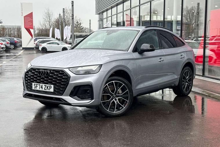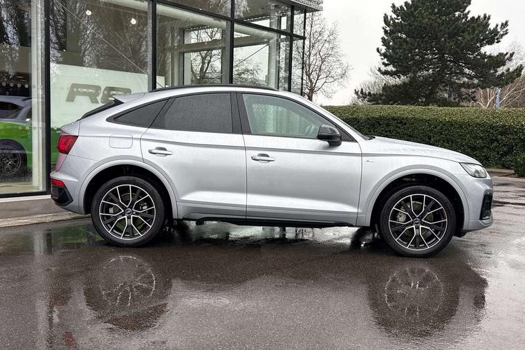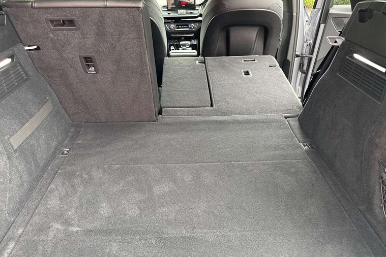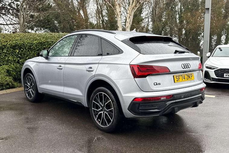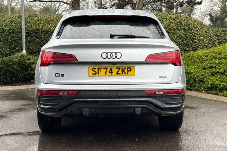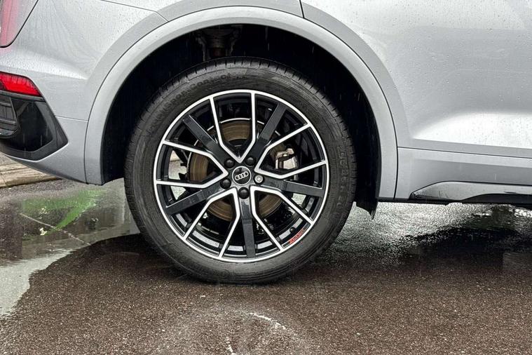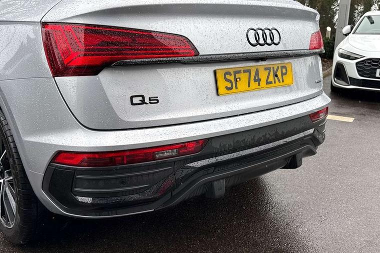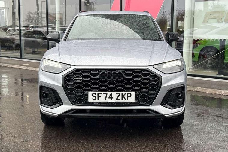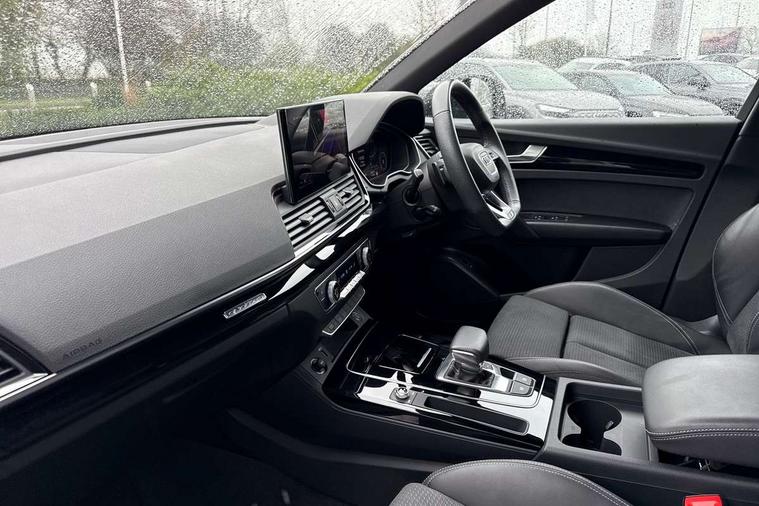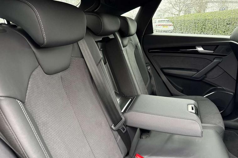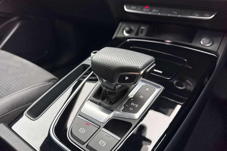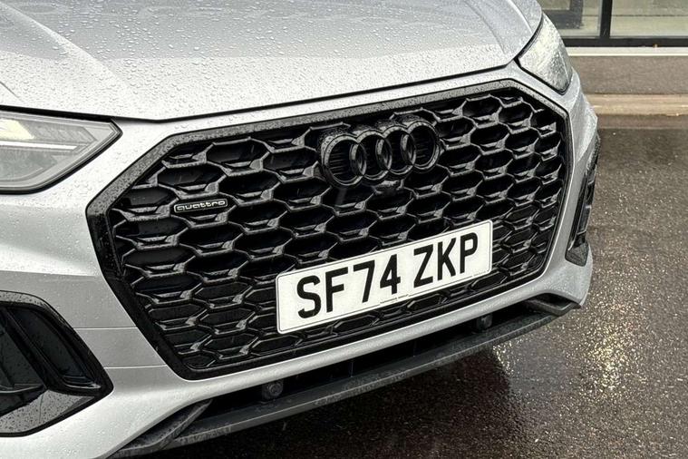 Acoustic front and rear parking sensor, Audi connect safety and service (e-call), Audi drive select, Audi virtual cockpit plus with 12.3" screen and three different layout designs, Audi wireless smartphone interface, Automatic start-stop system with coasting functionality and efficiency programme, Bluetooth interface, Camera based traffic sign recognition, Electro - mechanical power assisted steering, Lane departure warning, MMI navigation plus with 10.1" touch screen, Power tailgate, Reversing camera, Service interval indicator, Voice control system with Audi hotword activation "Hey Audi", Diesel particulate filter, Quattro on demand, S line sports suspension, 2 x USB charging port with aux input socket, 8 loudspeakers, DAB Digital radio, Acoustic windscreen, Auto dimming door mirrors, Auto dimming frameless rear view mirror, Automatic headlight adjustment, Automatic headlights and windscreen wipers, Black roof rails, Black styling with black rings, Body colour bumpers, Body colour rear diffuser with matt aluminium silver surrounds, Body colour underbody protection, Chrome plated exhaust trims, Daytime running lights, Door sills in Selenite silver, Electric adjustable/heated/folding door mirrors, Front air inlet surrounds in aluminium, Front and rear electric windows, Front radiator grille in honeycomb design, LED 3rd brake light, LED headlights and LED tail lights, Loading edge protection in stainless steel, Lower bumpers painted in contrast Manhattan grey, Rear chrome trim strip below lights, Rear privacy glass and rear side windows, Rear side wing doors, Rear wiper, Roof bars, S Line badges on the front wing panels, S Line front and rear bumpers, S Line rear spoiler, S Line side skirts, 3 rear headrests, Black cloth headlining, Comfort front centre armrest, Contrast stitching on seats, steering wheel and gear lever gaiter, Deluxe 3 zone electronic climate control, Front head restraints, Front sport seats with S embossed logo, Front/rear floor mats, Gear lever in black leather, Heated front seats, Height/reach adjustable steering column, Illuminated door sill trims with S logo, Luggage compartment cover, Manual seat adjustment with 4-way electric lumbar support, Single front passenger seat, Stainless steel pedals, Sunvisors with vanity mirrors, Top surface of the rear centre armrest in artificial leather, High gloss pack - Q5, LED interior light pack - Q5, 3 point seatbelts on all seats, 6 airbags - Driver, front passenger, curtain and side airbags, Attention and drowsiness assist, Electrically operated child locks on rear doors, Electromechanical parking brake, Electronic stabilisation control including ABS, ASR and EDL, First aid kit with warning triangle and vests, Front passenger airbag deactivation, Hill descent control, Hill hold assist, ISOFIX child seat mounting for front passenger seat and ISOFIX child seat mounting with Top Tether for outer rear seats, Multi collision brake assist, Pop-up bonnet for pedestrian protection, Pre sense city, Seatbelt monitoring, Tyre pressure warning, Anti theft alarm, Anti-theft wheel bolts, Remote central locking, Remote control key with SAFELOCK and keyless go, Air vents inserts and centre console in gloss black, Tool kit, Tyre repair kit,