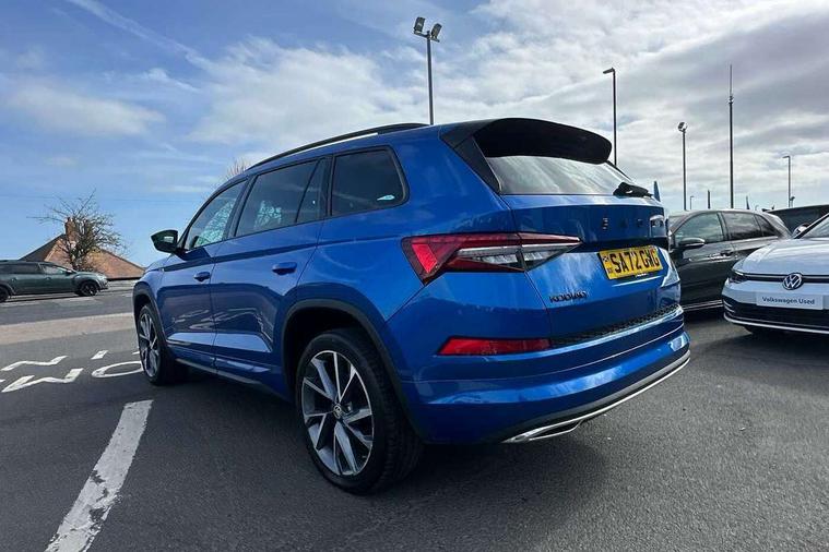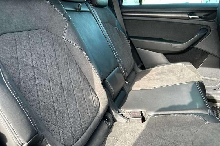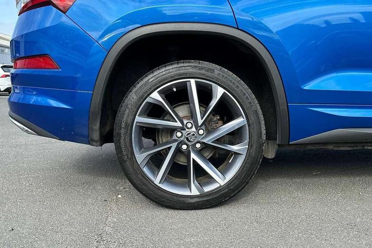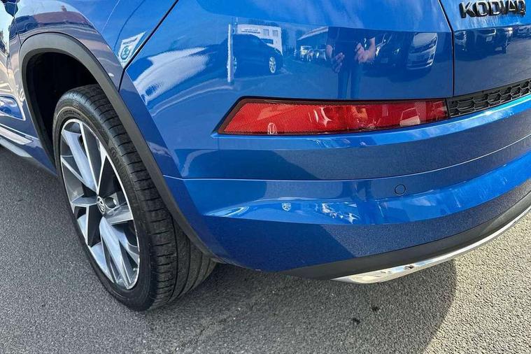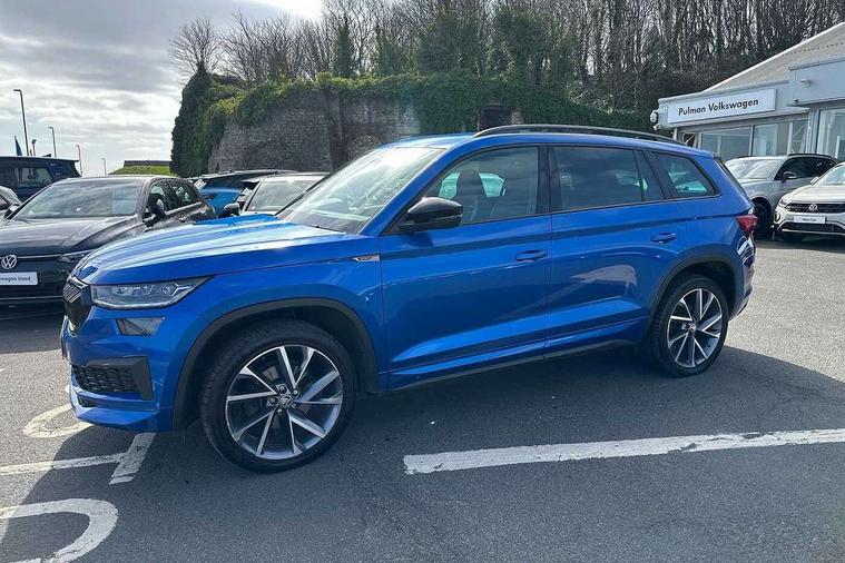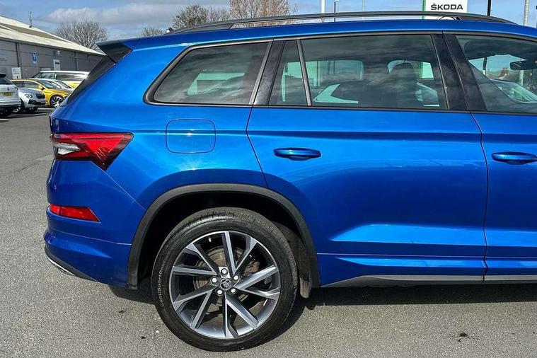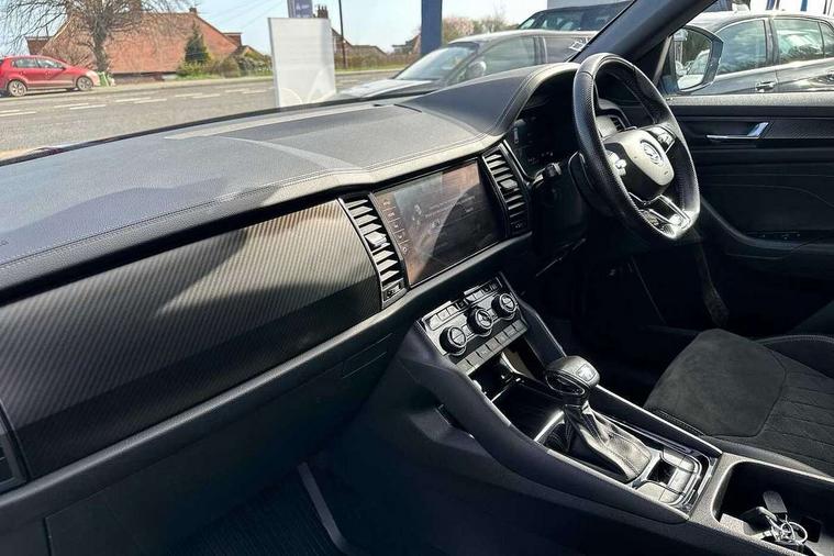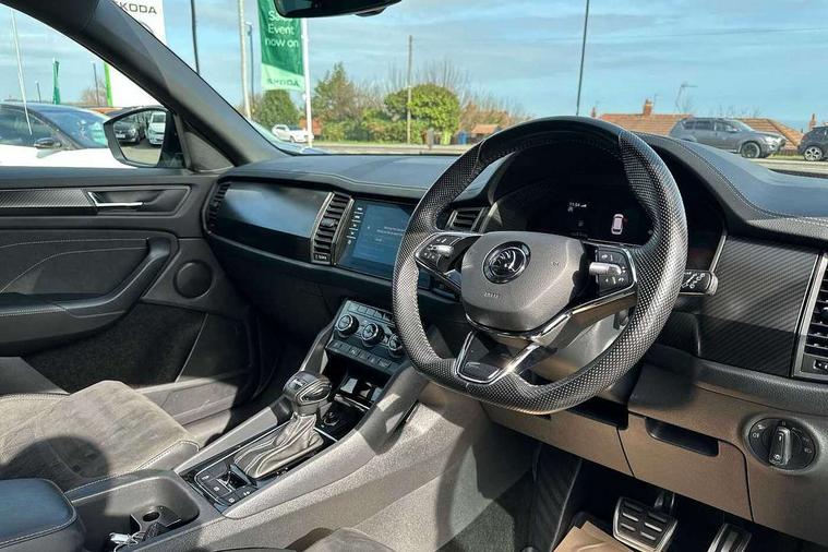 Bluetooth system, Columbus satellite navigation with 9.2" touchscreen, integrated Wi-Fi, web radio, Digital voice enhancement, e call+, ECO Stop/start function, Exterior temperature indicator, Progressive steering, Rear view camera, Smartlink wireless for apple carplay and wired for android auto, Speed limiter, Tailgate unlocking from outside, USB C Port x 2 in front centre console, Wireless charging, 8 Speakers, DAB Digital radio, Aero front windscreen wipers with intermittent function, Aero rear window wiper, Auto dimming rear view mirror, Black roof rails, Black sports styling including front grille and window surrounds, Black wheel arch surrounds, Body colour bumpers, Body colour door handles, Electric adjustable/heated/folding door mirrors, driver side auto dimming with boarding sports and memory function, Electric front and rear windows, Extended rear spoiler with finlets in gloss black, Front fog lights, Full LED matrix headlights with AFS (adaptive front light system), cornering function and AWL (all weather lighting system), Gloss black door mirrors, Headlight washers, Heated rear window, Invisible tailpipe, LED daytime running lights, LED rear fog light, LED third brake light in rear spoiler, Light assistant (coming/leaving home/tunnel light), Off-road style lower front bumper element, Privacy glass, Rain and light sensors, Rear diffuser, Rear LED lights (high functionality) with welcome effect and dynamic indicators, Rear side wing doors, Safety reflectors on front and rear doors, Sportline badge on front fender, Sports front and rear bumpers including lower rear chrome strip, Tailgate lettering in Black, Window control switches with black trim, 12V socket in boot, 2 rails with 2 hooks, 2 seat bench in 3rd row, 3 seat bench in 2nd row, 4 foldable roof handles with rear coat hooks, 60:40 foldable rear seat with sliding adjustment and backrest angle adjustment, Aluminium pedals, Black roof headlining, Bottle holders in door panel in the 1.5 litre front and 1 litre rear, Cargo storage compartments, Chrome headlight control button, Chrome interior door handles, Coat hooks on B pillar, Covered storage compartment on driver side, Decorative door sill covers, Front centre armrest with storage compartment, cup holder and 12V socket, Front courtesy lights, Gear shift lever with chrome frame and black gloss insert, Grey stitching in front and rear armrests and door armrests + door inserts, Height adjustable front headrests, Illuminated and cooled glovebox, Illuminated luggage compartment, Isofix child seat fittings in outer rear seats with top tether, Manually adjustable steering column, Microsuede door panels, Net programme in boot (1x horizontal Net, 2x vertical Nets), Overhead glasses storage compartment, Pollen filter, Rear centre armrest with cupholders, Single front passenger seat, Sliding trunk cover, Small Bags on the inner sides of the front backrests, Sports seats, Sunvisors with illuminated vanity mirrors, Three rear height adjustable headrests, Ticket holder on A Pillar, Umbrella in door panel, Variable boot floor, LED Interior light pack - Kodiaq, Auto door release and activation of warning lights in the event of an accident, Child locks on rear doors, Driver and front passenger airbag with knee airbag and front passenger airbag deactivation, Electronic parking brake with hill start assist, Emergency rear braking signal, ESC (incl. ABS+MSR+ASR+EDS+HBA+DSR+RBS+MKB), Front assist with autonomous emergency braking, Front side airbags with curtain airbags, Fuel cut off safety device, Height adjustable front 3 point seatbelts + pretensioners, Hill hold control, Rear disc brakes, Safety vest holder in door, Seat belt reminder for all seats, Three point rear seat belts, Two tone horn, Tyre pressure monitor, Alarm with interior monitoring and tilt sensor with safe function, Anti-theft wheel bolts, Immobiliser, Keyless entry and start system (KESSY), Remote central locking with 2 keys, Black air vent surround, Carbon finish dashboard and door inserts, Grey stitching in dashboard, 20" Vega Anthracite alloy wheels, Temporary spare wheel (space saver),
