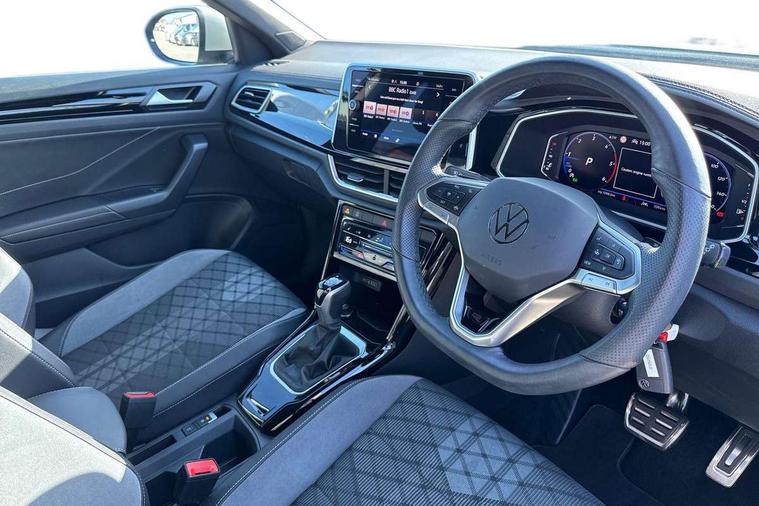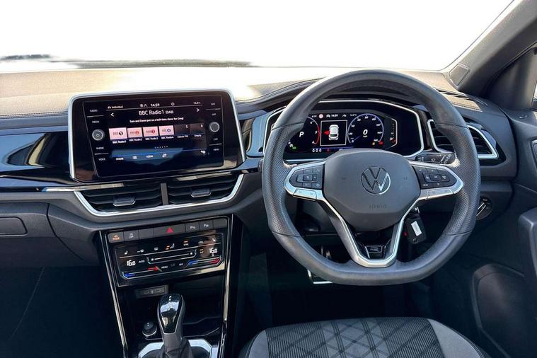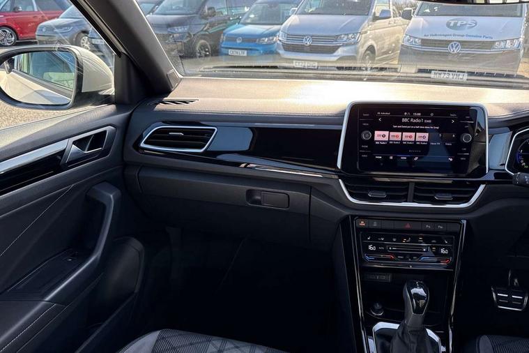 10.25" Digital cockpit pro, Advanced driver attention and drowsiness monitor, Dynamic road sign display, Emergency call service, Lane keeping system Lane Assist, Mobile phone interface, Modified key software - reduce switch off time for key status change to Long no motion, Online services, Park assist including front and rear parking sensors, Service interval indicator, Tailgate/trunk lid release from outside, Think blue trainer driver tips and journey analysis, Warning sound and light for front seatbelts unfastened, Wireless app connect, Battery regeneration during braking, Start/stop function with battery regeneration, DAB Digital radio, Diversity antenna for FM reception, Front and rear 6 speakers, Music playback - MP3, WMA and AAC files, Premium USB cable in choice of either Apple or Android smartphone compatibility, SD card slot, Simultaneous pairing of 2 compatible mobile devices, Title and cover art display, We Connect and We Connect Plus functionality, Auto dimming interior rear view mirror, Automatic hazard lights activation under emergency braking, Automatic headlight control with LED separate daytime running lights with coming/leaving home function, Body coloured exterior mirror housings and door handles, Electrically adjustable and heated door mirrors, Extended roof spoiler, Exterior mirrors aspherical on driver side, convex on front passenger side, External USB type C socket and charging sockets, Front windscreen wiper with intermittent wipe and 4 position delay, Heated rear window, LED 3rd brake light, LED rear combination lamps, LED rear number plate lights, Power windows with comfort operation and circuit breaker, Privacy glass for rear side windows and rear window, R-Line design body coloured bumpers, Rain sensor, Rear exhaust tailpipe, Rear fog light on one side and reversing lights on both sides, Rear side wing doors, Rear wash/wipe with intermittent wipe setting, Remote electrically foldable door mirrors, puddle lights and reverse activated passenger's door mirror, 12V power socket in centre console, 3 rear head restraints, 3 seat bench in 2nd row, 4 load lashing points in luggage compartment, Air care climatronic air conditoning system with active combination filter and 2-zone temperature control, Black roof lining, Chrome plated decorative trims, Chrome plated radiator grille inserts, air vent surrounds and light switch surrounds, Door and side trim panel with leatherette insert, Front + rear carpet mats, Front centre armrest, Front cupholders x 2, Front footwell illumination, Front reading light, Front scuff plates with R Line logo, Front seat back storage pockets, Glove compartment door with light, Instrument lighting, white adjustable panel illumination, Interior ambient lighting and surround lighting, Interior light delay, Isofix child seat preparation, Leather gearshift handle, Load-through provision with cup holder when folded down ('Unsplit rear seat bench, split folding backrest, with centre armrest), Luggage compartment lighting, Single front passenger seat, Stainless steel pedals, Storage compartment in left and right luggage area, Storage compartment in rear doors, Storage compartments in driver and front passenger doors, Sunvisors with illuminated vanity mirrors, Variable boot floor, height adjustable and removable, Driver assistance pack without proactive passenger protection - T-Roc, 3 point height adj front seatbelts + pretensioners, 3 point seatbelts in outer rear with ECE label, ABS, Child locks on rear doors, City emergency braking and pedestrian monitoring, Driver and front passenger airbag with front passenger airbag deactivation, Driver and front passenger safety-optimised head restraints, Drivers seatbelt reminder, Electronic parking brake, Electronic Stability Control (ESC) inc EDL (Electronic Differential Lock) and ASR (Traction Control), Front and rear passengers curtain airbag system including front side airbags, Hill start assist, Predictive pedestrian protection, Rear disc brakes, Two tone horn, Tyre pressure loss indicator, Volkswagen roadside assistance, Piano black decorative inserts in dashboard and front door trim panels, Trims for alloy wheels,