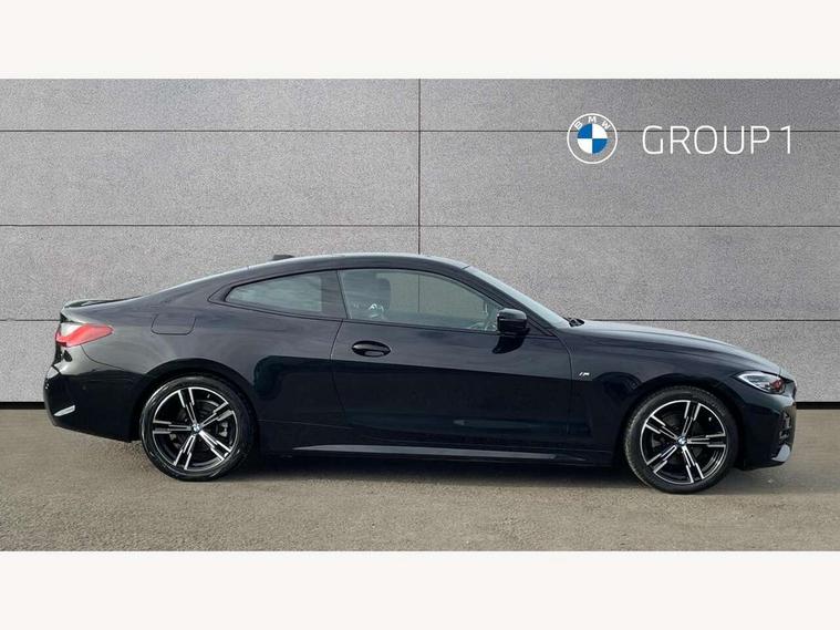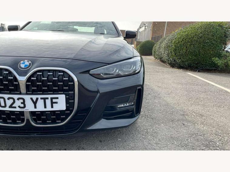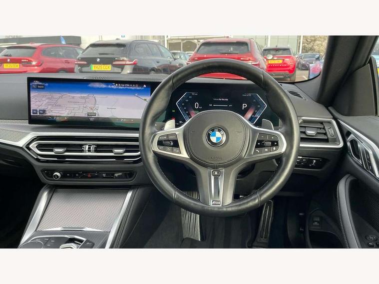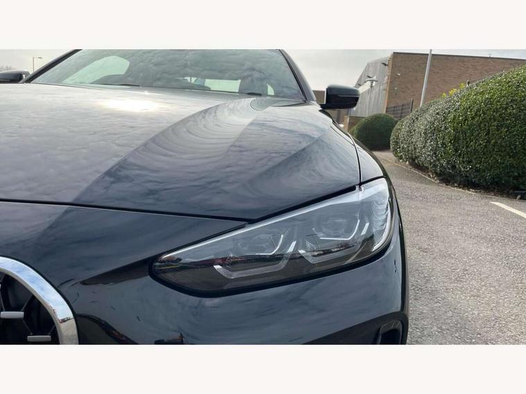 Active guard plus, Attentiveness assist, Auto start-stop, Bluetooth hands free facility with USB audio interface with audio streaming, BMW ConnectedDrive online services, BMW iDrive controller on centre console, BMW Live Cockpit Plus Nav-12.3" instrument&14.9" control Widescreen curved display/Intelligent Voice Assist/iDrive touch/Access 3rd party app/4G LTE, BMW service history, BMW Teleservices, Brake pad wear indicator in front and rear, Check Control warning system for monitoring of lights and door/luggage compartment open warning, Condition based service, Cruise control with speed limit function, Electric power steering with Servotronic steering optimised at all speed ranges, Gearshift time display in manual mode, Instrument cluster with speedometer with mph readout, tachometer, fuel gauge and oil temperature gauge, Integrated owners handbook, Oil sensor for level and grade, warning by check control system, On board computer - average speed, fuel consumption, outside temp display with acoustic warning, clock/date, service interval, odometer/trip meter, Optimum shift indicator, Run flat indicator, Shifting point display, Variable sport steering, 8 speed automatic steptronic transmission with gearshift paddles, Balanced 50/50 weight distribution, Double joint spring strut front axle, Double VANOS, Drive performance control - ECO PRO, comfort and sport modes, Electronic differential lock control (EDLC), High precision injection, Low centre of gravity, M sport suspension, Petrol Particulate Filter, Stroke dependent dampers, VALVETRONIC engine management, 2x USB Type C ports in front centre console for charging and data transfer, 2x USB Type C ports in rear centre console for charging, DAB tuner, Electronic service booklet, Acoustic glazing, Automatic headlight beam throw control with load dependent regulating reaction, dynamic compensation of braking dive and acceleration squat, Automatic windscreen wipers and automatic headlight, Automatically dimming electrochromatic rear view mirror, BMW emblem on engine compartment lid and tailgate, BMW kidney grille with mesh grille front side of the nuggets in matt aluminium and frame in chrome high gloss, Body colour fuel filler flap, Body colour roof fin, Brushed aluminium inserts in the front door sill finishers with BMW designation, Door sill strips, Dynamic brake lights, Electric windows - front and rear, with open/close fingertip control, anti trap facility and comfort closing function all round, Exterior mirrors - electrically folding with anti-dazzle, Fading support, Follow me home headlights, Front and rear bumper system, Front apron plastic in body colour, Green tinted heat protection glazing, High gloss shadow line exterior trim, Illuminated bow type door handles in body colour drivers side with door lock, Interior rear view electrochromatic mirror with automatic anti dazzle function, LED daytime running lights, LED front fog lights, LED front indicators, Licence plate panel integrated into front bumper and tailgate, Lightweight engineering, M designation on front side panels, left and right, M rear boot spoiler, Model designation on right side of tailgate, One piece front bumper cover including towing eye cover in body colour, Preparation for high beam assistant, Rear boot, Reversing light, Side frame decorative moulding black matt, Two part LED tailights in L-shape with components in smoked glass, brake light, LED turn indicator and rear fog light, Visible exhaust tailpipe finisher, Visible VIN plate, Welcome lights in interior and door handle area, Widened track and increased camber values for max transverse dynamics, agility and steering precision, Window recess cover black high gloss, Windscreen wipers with integrated heated washing jets, 12V power socket in front centre console, 2 front cupholder in centre console with clamping elements and matt black inlay, 2 Rear seat headrests, 2 seat bench in second row, 3 spoke M sport leather multifunction steering wheel, 3 zone automatic air conditioning, 4 pieces lashing eyelets in luggage compartment, 40:20:40 split folding rear seat and rear centre armrest with two cupholders, Anthracite headlining, Armrest integrated in front and rear door trim + front centre console armrest, BMW ID, Driver seat backrest width adjustment, Extended storage - Luggage compartment partition net on left side trim panel, Bag hook on both sides of the luggage compartment, Four grab handles integrated in roof lining, Front and rear door pockets, Front and rear reading lights, Front sport seats, Heated driver and front passenger seats, Height adjustable front headrests, Height adjustable mechanically and infinitely variable steering column, Illuminated armrest storage compartment, Illuminated glove compartment with separate small compartment, Make-up mirror lights, Single front passenger seat, Storage compartment in rear centre console, Sunvisors with illuminated vanity mirrors and ticket pocket, Toolkit located in luggage compartment, Velour front floor mats, Vernasca leather upholstery, Ambient lighting pack - 4 Series, Connected professional package - 4 Series, M sport exterior styling pack - 4 Series, 2 x 3-point rear seatbelts, Battery safety cut-off, BMW emergency call, Brake energy regeneration, Braking pre-tensioning, Child seat ISOFIX attachment for the two outer rear seats, Coasting in idle in ECO PRO mode, Cornering brake control (CBC), Crash sensor activating of airbags, Unlocking doors, hazard warning lights, interior light, safety battery terminal, Driver and front passenger side airbags, integrated in the door side seat backrest bolsters for all seat variants, Driver/Front Passenger airbags, Dry braking, Dynamic brake control, Dynamic stability control + (DSC+) - Anti-lock Braking System (ABS) with brake assist and cornering brake control + Automatic Stability Control (ASC), Dynamic Traction Control - DTC, Electric parking brake including automatic hold function and automatic release of the parkin