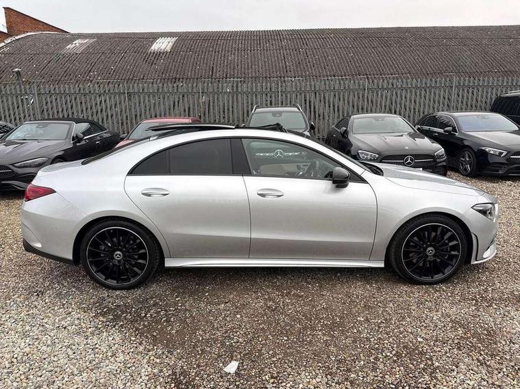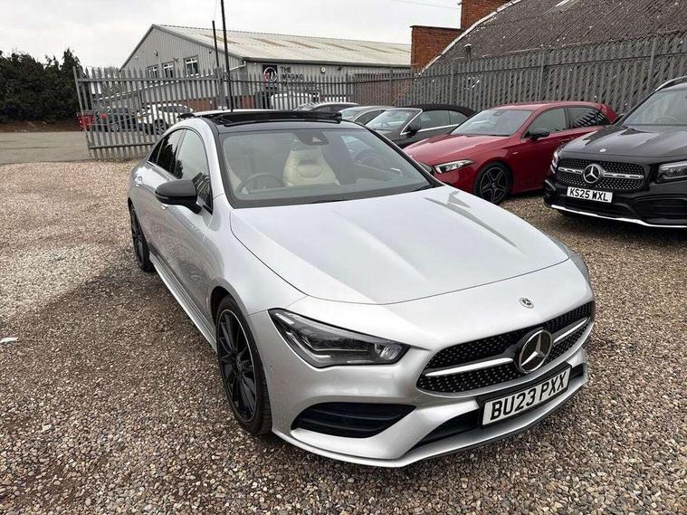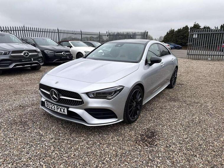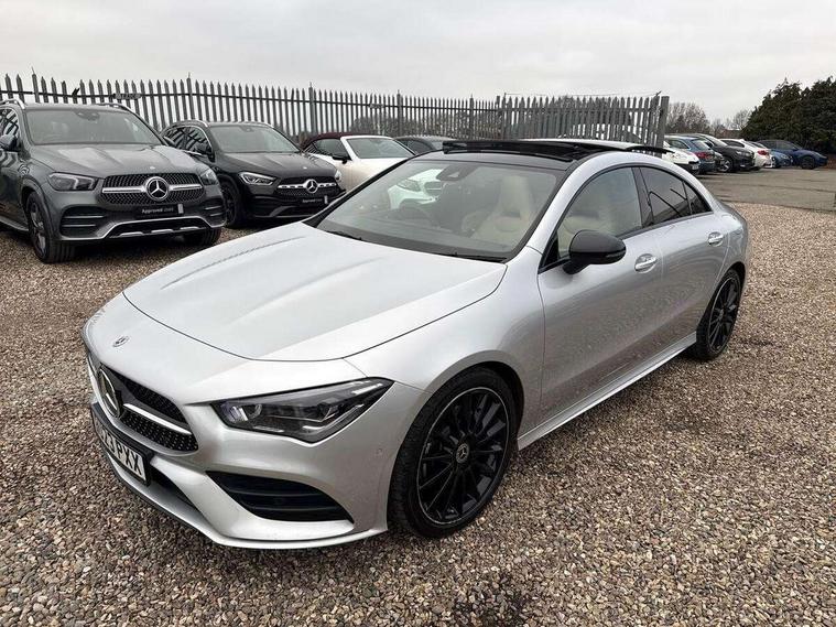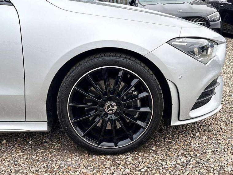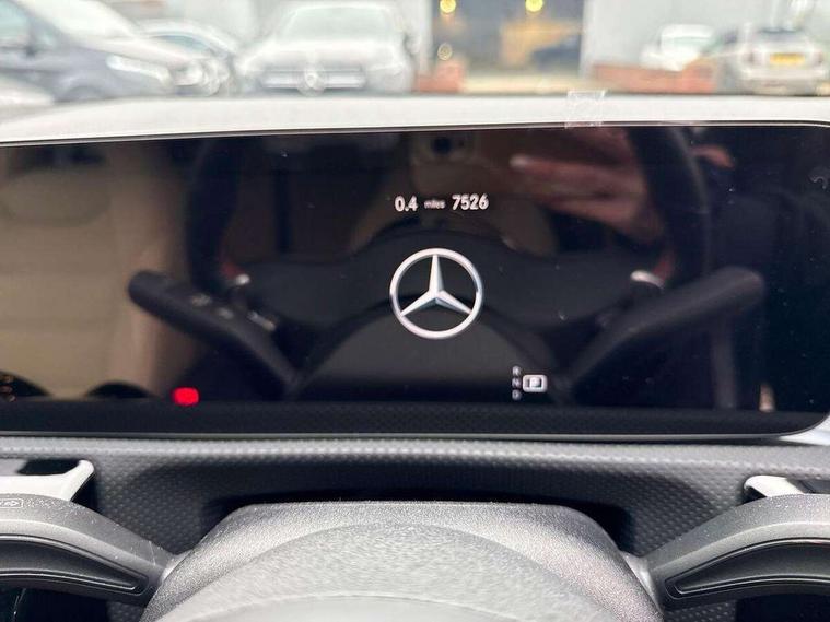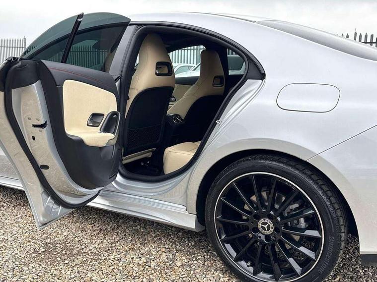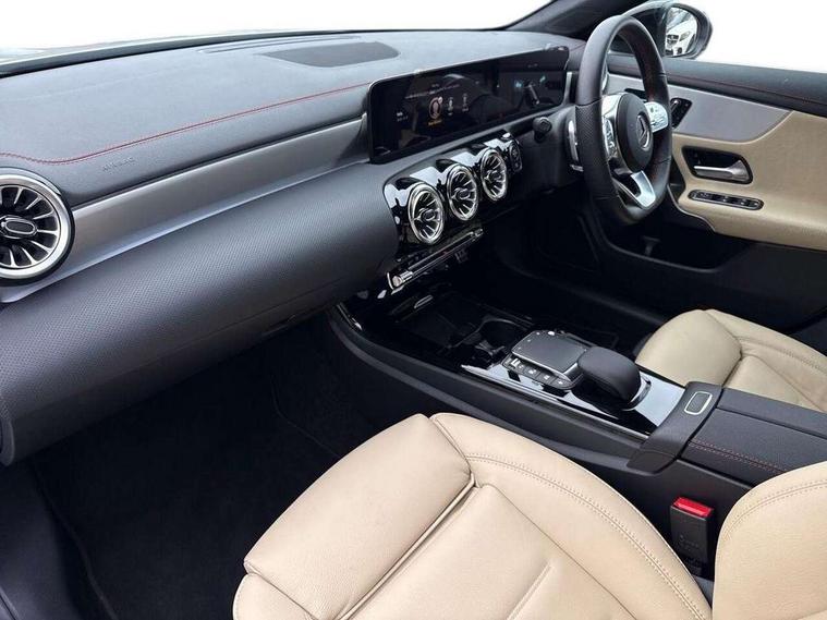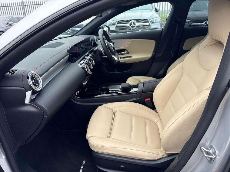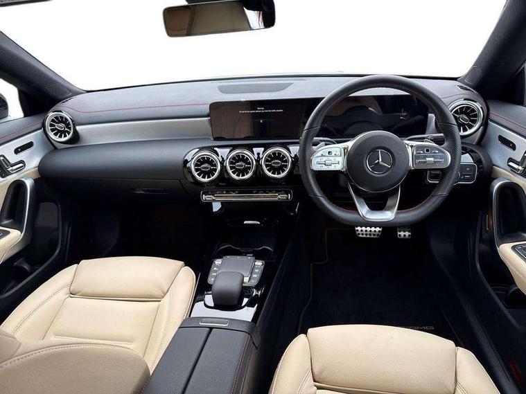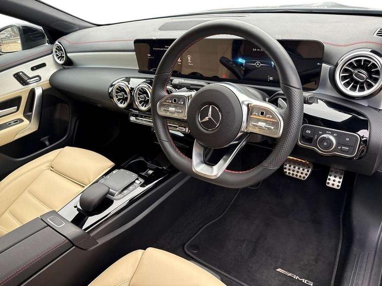 10.25 inch Instrument display with digital cockpit, 10.25 inch touchscreen central media display, Active lane keeping assist, Attention assist - Monitors steering behaviour and long journey fatigue, Blind spot assist, Bluetooth connection, Car wash mode, Cruise control with limiter, Direct steer system with speed sensitive power steering, DYNAMIC SELECT with a choice of driving modes (ECO, Comfort, Sport and Individual), ECO start/stop function, Fluid level warning indicator for fuel, oil, coolant and washer fluid, Hard-disk navigation, Hey Mercedes Voice activation, Lamp failure indicator, Mercedes me connect including emergency call system, accident recovery, breakdown and maintenance management, Mercedes me remote services, Outside temperature gauge, Owners manual and service booklet in English, Pre-installation of private car share, Preinstallation for Mercedes Benz link, Radio aerial integrated into front and rear windshields, Service indicator (ASSYST), Smartphone integration with Apple CarPlay and Android auto, Speed limit assist, Traffic sign assist, Trip computer in multifunction display with current consumption indicator, Lowered comfort suspension, Rear axle multi-link, DAB digital radio tuner, MBUX multimedia system, Mid-range sound system, USB (type C) ports (2) in stowage compartment and 1 in front of centre console, Adaptive brake lights, AMG body styling with AMG front apron and rear apron and visible exhaust tailpipe in chrome trim elements, AMG bodystyling side skirts, Body colour bumpers, Body colour door handles, Chrome beltline strips, Diamond radiator grille pins in chrome, Electric panoramic sunroof with automatic tilt and convenience closing fuinctions, rain sensor auto closing and electronic roller sunblind, Electric windows, Electrically adjustable and heated door mirrors with integrated LED indicators, Exhaust system with 2 Visible tailpipe trim elements and rear apron with trim in chrome, Headlamp assist automatic headlamp activation, Heated glass rear windscreen + timer control, High level LED third brake light, Integrated LED daytime running lights, Interior mirror with black reading lamps and frameless, LED tail lamp, Multibeam LED headlamps with adaptive highbeam assist plus, Privacy glass with dark tinting on rear side windows and rear window, Rain sensing windscreen wipers with two sensitivity settings, Rear boot, Rear fog lamp, Rear side wing doors, Variable front intermittent wipers, Window line trim strip in chrome, 3 seat bench in 2nd row, 3 spoke flattened bottom nappa leather multifunction steering wheel with perforated leather in grip area, 40:20:40 split folding rear seat backrests, Air conditioning - Two zone thermotronic luxury automatic climate control with display, Air vents with surround in silver chrome, Artico man-made leather upholstery, Automatic child seat recognition sensor, Black roof lining, Brushed stainless steel sports pedals with rubber studs, Electrically adjustable front memory seats including lumbar support, Floor mats with stitched AMG lettering, Front centre armrest with stowage, Galvanished gear shift paddles on steering wheel, Heated front seats, Illuminated front door sills with changeable cover, Illuminated glove compartment stowage, Interior lighting - 64 colour Ambient lighting, Luggage net on driver/front passenger seat backrest, Manually adjustable front seats, Manually height and reach adjustable steering column, Rear armrest with two integral cup holders for drinks, Rear head restraints, Single front passenger seat, Sport seats with fixed head restraints, Stowage compartment in centre console with retractable cover, Sunvisors with illuminated vanity mirrors, Touchpad on center console, Twin front cupholders, Two outer rear seat isofix and top tether child seat fixing points, Keyless go comfort pack - CLA, Light and sight pack - CLA, Mirror pack - CLA, Night package - CLA, Parking package - CLA, Active bonnet pedestrain safety measure which detects an impact and raises bonnet by 65mm, Active brake assist includes forward collision warning system with autonomous braking, Adaptive brake assist with hold function and hill start assist, Anti lock braking system (ABS) with brake assist, Black seat belts, Bonnet with power domes, Brake pad wear warning indicator, Childproof locks manually operated for rear doors and electrically operated for rear power windows, Crash responsive emergency lighting, Driver and front passenger head and sidebags, Driver and front passenger windowbags, Drivers knee airbag, Dual stage driver and front passenger airbags, Electric parking brake, Electronic stability programme with acceleration skid control, ESP curve dynamic assist, Exit warning, Front and rear seatbelt reminder, Front passenger seat occupancy sensor, Three point rear seat belts, Tyre pressure monitoring system, Warning triangle and first aid kit, Guard 360 degree guard vehicle protection system with immobiliser and interior protection, Remote central locking and crash sensor with emergency opening function, Light aluminium with longitudinal grain interior trim, 19" AMG multi-spoke black painted light alloy wheels with high sheen rim finish, Summer tyres, Tirefit tyre sealant kit,