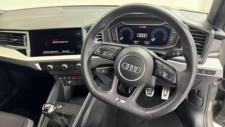 10.25" Digital instrument cluster display classis style instrument dials + speed, odometer, time, outside temperature, telephone menu + fuel level warning, Audi drive select - power steering assistance + engine, Audi smartphone interface with connect compatible smartphone via USB directly MMI display + Nav, music, third party apps controlled via MMI controller, Automatic start/stop system, Bluetooth interface, Cruise control, Driver's information system, Electromechanical power steering, Emergency e-call, Emergency services call system, Lane departure warning system, Service interval indicator, Speed limiter, Voice control system, Washer fluid level indicator, Sports suspension, 1 x SDXC card reader, 2 x USB type C connection points, DAB Digital radio, MMI radio plus with 8.8" colour MMI display screen and MMI touch, Auto dimming rear view mirror, Black door mirrors, Black side skirts, Body coloured bumpers, Door sill trims with aluminium inlays and logo, Electric front and rear windows, Electrically adjustable, heated, folding door mirrors with integrated LED side indicator, Front side air inlets in grained matt black and C frame in anthracite black, Front wing badges, Heat insulating glass windscreen and side windows, Heated rear windscreen, High level LED brake light, LED headlights with LED rear lights + dynamic rear indicators + headlight adjustment and high beam, turning light + LED daytime running lights, Radiator protective grille frame in matt aluminium silver, Rain and light sensors, Rear diffuser strip in matt titanium black, Rear fog lights, Rear side wing doors, Rear wing door, Rear wiper, Side front spoiler lips in grained matt black, 12V socket in centre console with two cup holders, 3 rear seats with headrests, 3 seat bench in 2nd row, 3 spoke flat bottomed multi-function plus leather steering wheel with S badging, grips in preforated leather and contrast stitching, 40:60 Split folding rear seat or folded fully, Black cloth headlining, Driver and passenger seat with manual height adjust with forward and backwards adjustment, Front and rear black floor mats with contrast stitching in fine silver, Front head restraints, Front passenger seat, Height and reach adjustable steering wheel, ISOFIX child seat mounting for front passenger and outer rear seats including top tether attachment point of outer rear seats, Leather gear knob with aluminium trim, Luggage compartment light with front and rear reading lights, Manually adjustable lumbar support in front seats, Stainless steel pedals, Black styling pack - A1 Sportback Black Edition, LED interior lighting pack - A1, Luggage compartment pack - A1, 3x3 point rear seatbelts, Audi pre-sense front with pedestrain and cyclist recognition, Brake assist function, Driver and front passenger airbag with front side and head airbags, Electronic Stability Control including ABS, EBD, ASR and EDL, Front passenger airbag deactivation switch, Hill hold assist, Manual rear child locks, Seatbelt height adjustment for front seats, Seatbelt monitoring, Tyre pressure warning light, Warning triangle and first aid kit, Anti theft alarm, Anti theft wheel bolts and loose wheel warning, Immobiliser, Remote central locking with 2 foldaway keys, Aluminium trim for control switches, air vents and digital instrument cluster, Silver grey inlays polygon structure in diamond paint finish, Structured grey accent areas including air vents, door handle recesses and centre console in quartz paint finish, 18" 7 spoke rotor design alloy wheels in gloss anthracite black, diamond cut finish,