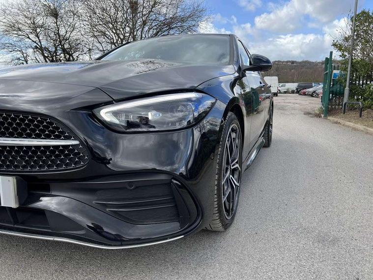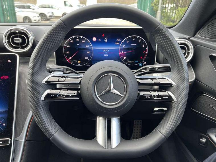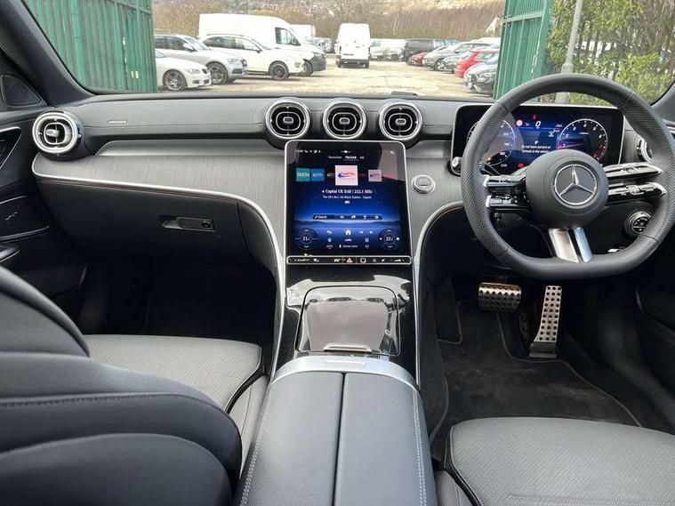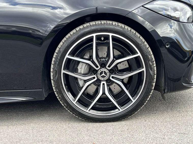 11.9" high resolution multimedia colour display, 12.3" digital instrument cluster display, Active blind spot assist, Active brake assist plus, Active lane keeping assist, Attention assist, Cruise control with speedtronic variable speed limiter, DYNAMIC SELECT with a choice of driving modes (Comfort, ECO, Sport, Sport+, Individual), E-call, Extended MBUX functions, Finger print sensor, Fluorescent jacket for driver, MBUX augmented reality for navigation, MBUX navigation premium, MBUX voice control activated by keywords "Hey Mercedes", Mercedes connect me, Mercedes me remote services, Outside temperature gauge, Pre-installation for digital key transfer, Remote boot release, Service indicator (ASSYST), Smartphone integration, Speed limit assist, Sports direct steer speed sensitive steering, Status display for rear seat belts in instrument cluster, Traffic sign assist, Wireless charging system for mobile devices, 66l fuel tank with increased capacity, 9G TRONIC 9 speed automatic transmission, Agility control sports suspension and lowered by 15 mm, Petrol Particulate Filter, Sporty engine sound system, DAB Digital radio, MBUX multimedia system, Adaptive brake lights, Adaptive high beam assist plus, AMG body styling front apron, rear apron and side skirts, AMG front bumper with sporty air intakes and chrome elements, AMG rear bumper with high gloss chrome elements, AMG side skirts in vehicle colour, B-pillar trim in glossy black, Body coloured bumpers, Body coloured door mirrors, Chrome beltline trim, Daytime running lights, Digital light LED headlamps, Electric windows with one touch opening/closing and obstruction sensors, Electrically adjustable and heated door mirrors, Green tinted glass, Heat insulating dark tinted glass, Illuminated front door sill panels, LED Indicators, LED tail lights, LED third brake light, Noise acoustic glass, Powerdomes on bonnet, Privacy glass, Radiator diamond grille with integrated Mercedes Benz star and louvre silver with chrome pins, Radio aerial integrated into rear window, Rain sensor with automatic windscreen wiper activation, Rear boot, Rear side wing doors, Two visible exhaust pipes integrated into rear bumper, 3 seat bench in 2nd row, 3 spoke flattened bottom AMG multifunction steering wheel in black nappa leather with chrome inserts and perforated leather in grip area, 40:20:40 split folding rear bench seat, Ambient lighting premium, AMG sports seats, Artico man-made leather upholstery, Audio and onboard settings control on multifunction steering wheel, Auto Mercedes-Benz child seat recognition sensor, Black air vents with silver chrome elements, Black floor mats with AMG lettering, Black roof liner, Door trim elements high gloss black with silver chrome surroundings and switches, Double cupholder in centre console, Electrically height/reach adjustable steering column, Folding rear seat backrest, Front and rear head restraints, Front centre armrest with storage compartment, Gearshift paddles on steering wheel, Heated front seats, Illuminated door sills with Mercedes Benz lettering, Illuminated glove compartment stowage, Overhead control unit in high gloss black, Rear top tether child seat ISOFIX attachment, Single front passenger seat, Sports pedals with stainless steel surfaces and rubber studs, Sunvisors with illuminated vanity mirrors, THERMATIC 2 zone automatic climate control, Interior lighting package - C Class, Memory package - C Class, Mirror pack - C Class, Parking package with 360 degree camera - C Class, Seat comfort pack - C Class, Stowage space pack - C Class, USB package plus - C Class, 3 rear 3 point seatbelts, Active bonnet pedestrian safety measure which detects an impact and raises bonnet, Adaptive brake system with HOLD function and brake drying in the wet, Anti-lock braking system (ABS), Black seat belts, Brake calipers with Mercedes-Benz lettering + perforated front brake discs, Child proof door locks, Drivers knee airbag, Drivers pelvis airbag, Dual stage driver/passenger airbags, Electric parking brake, Electronic Stability Programme (ESP), Front centre airbag between driver and front passenger seats, Front side airbags, Larger brake discs on front axle, Rear seatbelt warning indicator, Sports braking system, Tyre pressure monitoring system, Warning triangle and first aid kit, Window airbags for driver, front passenger and rear passenger, Central locking with interior switch, automatic locking and crash sensor with emergency opening function, Chrome surround in electric key, Dashcam, Keyless Go, URBAN GUARD vehicle protection (Thatcham Category 1) consisting of break-in, anti-theft alarm system (ATA), interior monitoring and tow-away protection, Artico man-made leather dashboard with contrast stitching, Centre console trim in metal weave, 19" AMG multi spoke light alloy wheels painted himalayas grey with high sheen finish, Noise reduced tyre with foam absorber, Summer tyres, TIREFIT with tyre inflation compressor,