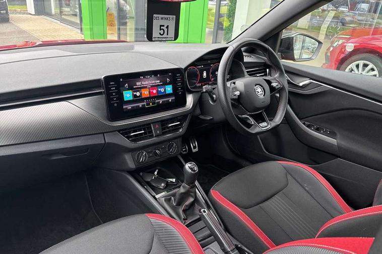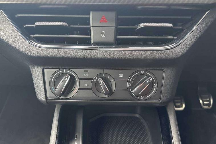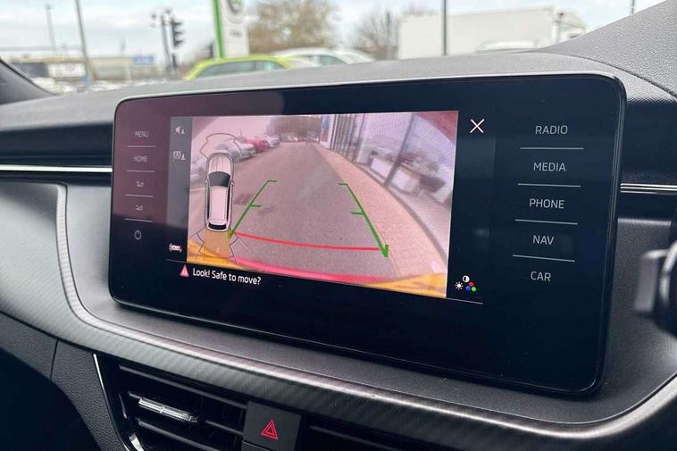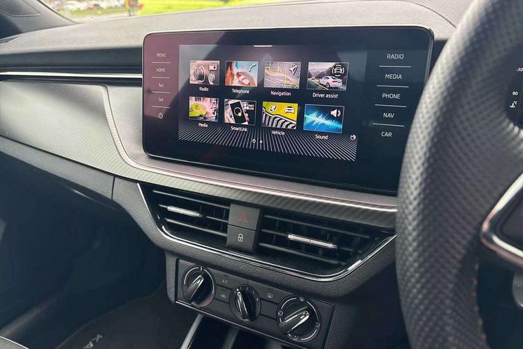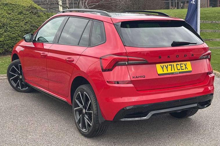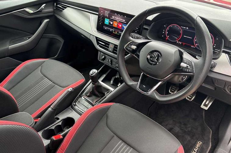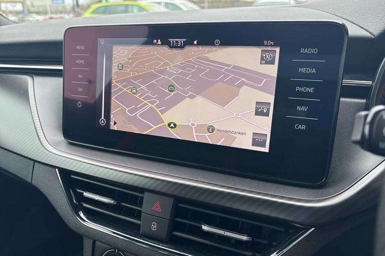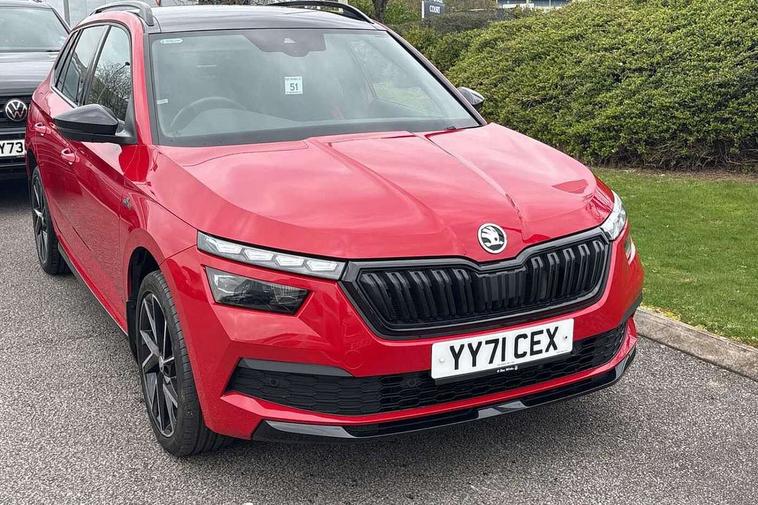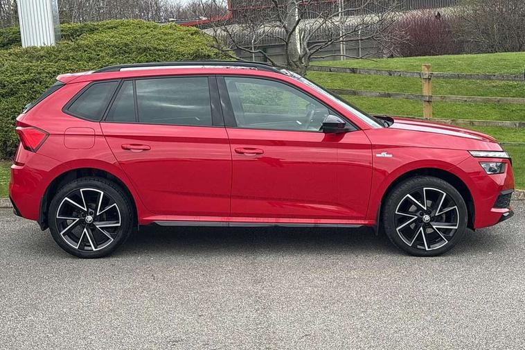 Amundsen satellite navigation with 9.2" touchscreen display, voice control, virtual cockpit and web radio, Bluetooth system, E-call, Front assist system, Gesture control, PAS, Service indicator, Speed limiter, Virtual cockpit with 10.25" display, Wireless SmartLink for apple car play, android auto and mirrorlink, 2 USB - C ports with 1x adaptor cable, Auxiliary input socket, DAB Digital radio, Auto dimming rear view mirror, Black door mirrors, Black radiator grille, Black rear diffuser, Body colour bumpers, Body colour door handles, Body colour roof spoiler, Boot lettering in black, Chrome grille surround, Electrically adjustable and heated door mirrors, Fixed panoramic sunroof with black roof rails, Front and rear electric windows, Front sport bumper, Full LED headlights with adaptive front light system, dynamic indicators, cornering function and fog lights, Headlight range control, Heated rear window, High functionality rear led lights with dynamic indicators, KAMIQ Door sills, Light sensors, Monte carlo plaque, Privacy glass, Rear fog lights, Rear wiper, 12V Accessory socket in centre console, Aluminium pedals, Black ceiling for black/beige interior, Chrome inner door handles, Cloth upholstery, Front head restraints, Glove compartment with illumination, Height adjustable passenger seat, Ice scraper, Isofix child seat fittings on outer rear seats, ISOFIX on front passenger seat, Leather gear lever, Manual lumbar support for front seats, Rake/reach adjustable steering wheel, Reading lights, Sports seats, Sun visors with illumination on front passenger, Textile floor mats, Third rear headrest, Top tether for front passenger seat, Umbrella in driver's door, 3x3 point rear seatbelts, Airbags - driver and front passenger, ESP, Front passenger airbag deactivation switch, Front side airbags with curtain airbags, Hill hold control, Manual parking brake, One tone horn, Rear disc brakes, Seatbelt reminder for driver an co-driver, Traction control, Tyre pressure monitor, Anti-theft alarm system with interior monitoring, backup horn, towing protection and remote central locking with SAFE system, Anti-theft wheel bolts, Electronic engine immobilizer, Chrome air vent surrounds, 18" Vega alloy wheels in black,