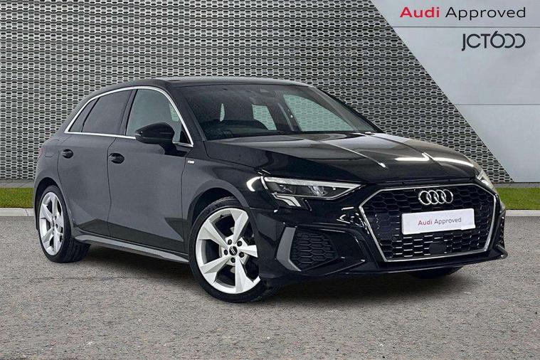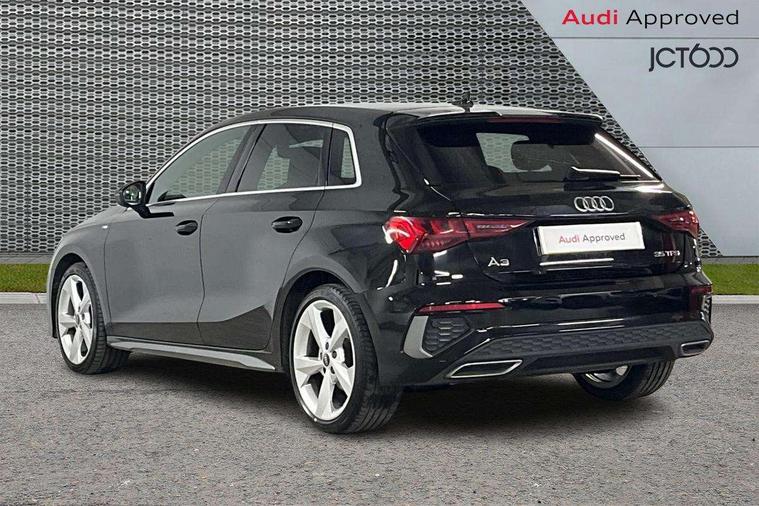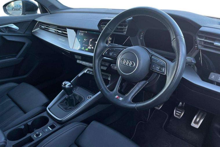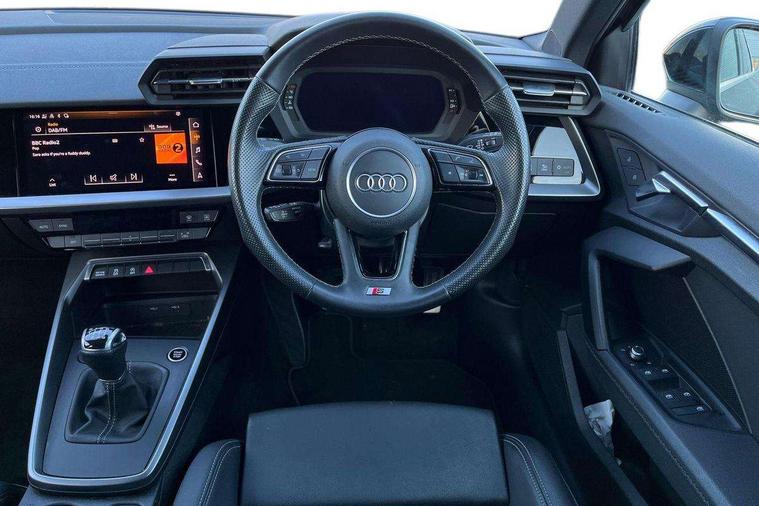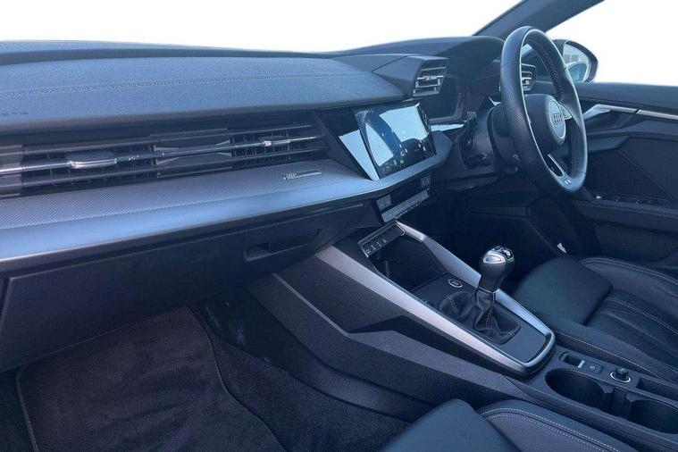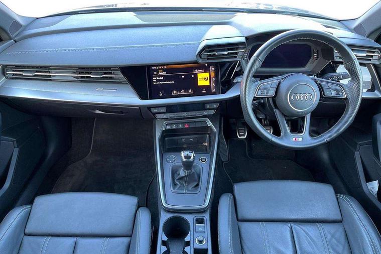 Audi drive select (Auto, Comfort, Dynamic, Efficiency and Individual), Audi smartphone interface, Audi Virtual Cockpit - 10.25" digital and colour instrument cluster, Automatic start/stop system with recuperation, Bluetooth interface, Collision avoidance assistant, Cruise control, e-Call (emergency call), Electromechanical power speed sensitive steering, Lane departure warning system, MMI Navigation Plus with high resolution 10.1" colour touch screen display, Rear parking sensors, Service indicator, Trip computer, Voice control system with natural language interaction, 2xUSB-C connection with data and charging functions, 6 passive loudspeakers, DAB Digital radio, 3rd brake light, Acoustic glass windscreen, Aluminium window trim, Auto dimming frameless rear view mirror, Electrically adjustable/heated/folding/auto dimming door mirrors with integrated LED indications + kerb view function for passenger side, Front electric windows, Illuminated aluminium inserts front door sills with S logo, LED daytime running lights, LED headlights with LED rear lights and dynamic rear indicators, Light and rain sensors, Privacy glass - dark tinted rear window, rear door and side windows, Rear electric windows, Rear side air outlets in grained matt black, Rear side wing doors, Rear wiper, S line bumpers, S roof spoiler, 12V socket and storage compartment in front centre console, 3 seat bench in 2nd row, 40/20/40 split folding rear seat bench with cupholder, Black cloth headlining, Dual zone electronic climate control, Front and rear centre armrest in leather, Front and rear headrests, Front/rear floor mats, Height and reach adjustable steering wheel, Illuminated vanity mirror, Interior lighting - glove compartment light and right hand side, Luggage compartment floor covering, Manual boot compartment lid, Manually adjustable front seats, Seat side bolsters, Single front passenger seat, Stainless steel pedals and front footrest in black, Twin leather upholstery with front sports seats S embossed logo, Aluminium interior elements pack - A3 Sportback, LED interior lighting pack - A3 Sportback, S line styling pack - A3 Sportback, 3x3 point rear seat belts, Audi pre sense front, Driver and front passenger airbag with passenger airbag deactivation, Electronic Stabilisation Control (ESC) including ABS, ASR and EDL, First aid kit with warning triangle and 2 safety vests, Front side airbags with head airbags and interaction airbag, Pre-sense front with pedestrian and cyclist detection, Seatbelt monitoring, Tyre pressure loss indicator, Anti theft alarm, Anti-theft wheel bolts, Electronically operated child lock, Immobiliser, Remote control central locking, Accent surfaces in the dashboard and centre console in platinum grey silk effect paint finish, Dark spectrum aluminium inlays,
