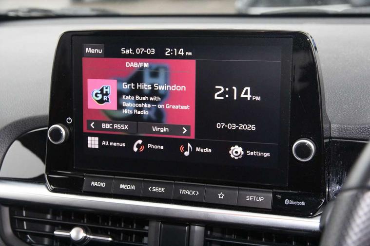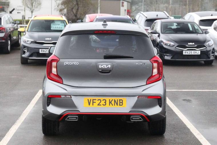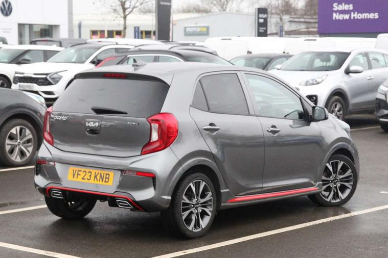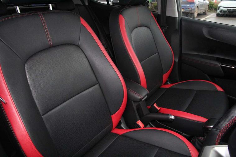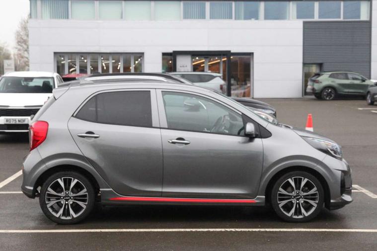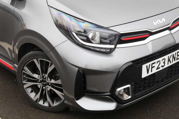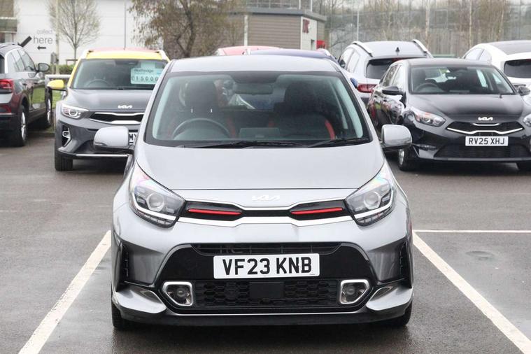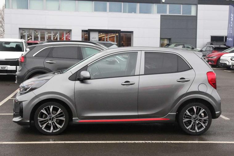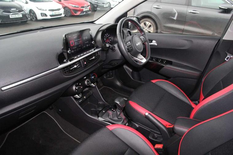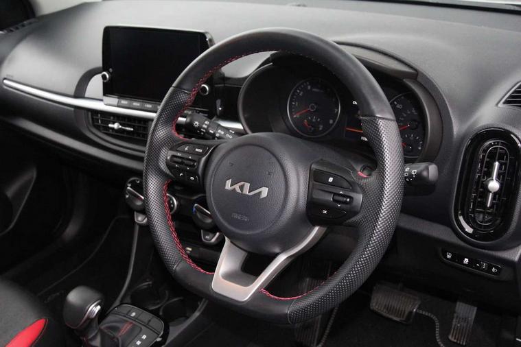 8" touchscreen display with RDS and DAB, Apple car play/Android Auto with voice control, Emergency call service, Emergency stop signalling system, External temperature gauge, Motor driven power steering, Reversing camera system with dynamic guidelines (Integrated into centre fascia screen), Tachometer, Trip computer, 6 speaker audio system, Bluetooth with music streaming, Steering wheel mounted controls, USB ports for connection of a media device, Automatic headlight control system, Bi-function projection headlights, Black beltline mouldings, Black grille with silver surround, Body colour B pillars, Body colour bumpers, Body colour mirrors and door handles, Body colour side sill mouldings, Day/night rear view mirror, Electric adjustable/heated/folding door mirrors with LED indicators lights, Front and rear electric windows with drivers's auto up/down function, Front fog lights, Headlamp levelling, Heated rear window, High mount brake light, LED daytime running lights, LED rear fog lights, LED rear lights, Privacy glass - Rear windows and tailgate, Rain sensor, Rear side wing doors, Rear wash/wipe, Speed variable front wipers, Sports front and rear bumpers with gloss black skid plates twin exhaust, Tinted glass, Visible VIN plate, Welcome and follow-me home light functionality, 1 x rear coat hook, 12V power point front, 2 seat bench in 2nd row, 3 x passenger assist grips, 60/40 split/folding 2nd row of seats, All round height adjustable headrests, Black and red accents front door armrest, Centre Console with Storage Box and Sliding Armrest, Cupholders in centre console, D-cut steering wheel with red stitching, Driver and front passenger sunvisor with vanity mirror, Driver seat height adjust, Faux leather upholstery, Front cabin lights, Glovebox, High gloss lower centre fascia trim, door armrest and air vents, ISOFIX Child seat top tethers and anchor fixings, Leather trimmed steering wheel and gearshift, Luggage area light, Luggage area parcel shelf, Manual air conditioning, Passenger front seatback pockets, Satin chrome interior door handles, Single front passenger seat, Slide/reclining front seats, Tilt adjustable steering wheel, Advanced Driver Assistance Pack - Picanto, 2 x 3-point rear seatbelts, ABS/EBD, Automatic unlocking of doors in case of impact, Dual front airbags, ESC + BAS + VSM + HAC, Front passenger airbag cut-off switch, Front seatbelt height adjusters, Front seatbelt pretensioners + load limiters, Hill hold control, Knee airbags, Rear child proof door locks, Seatbelt warning, Side impact protection, Torque vectoring brake based and straight line stability (SLS), Traction control, Twin curtain airbags, Twin front side airbags, Tyre pressure monitoring system, Anti theft alarm, Engine immobiliser, Folding key, Locking wheel nuts, Remote central door locking, 16" alloy GT-Line wheels, Tyre mobility kit,