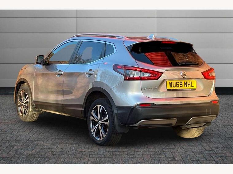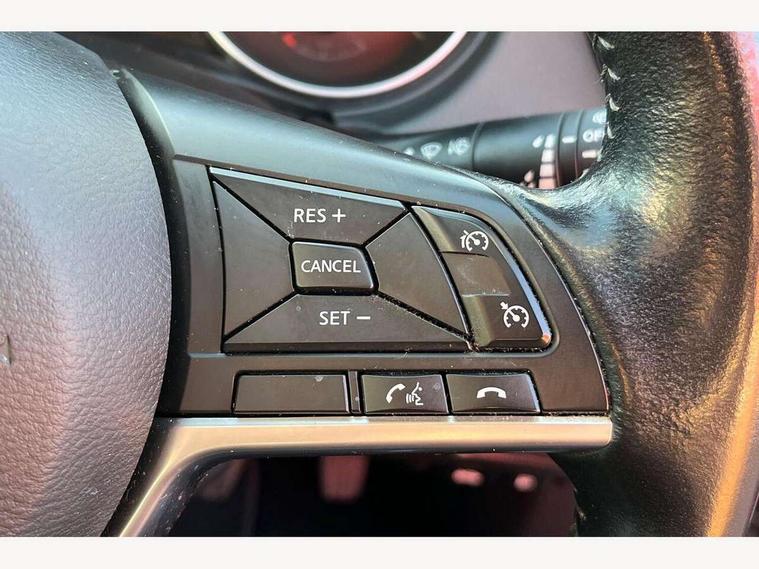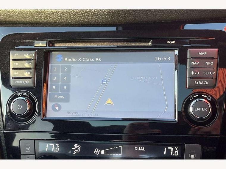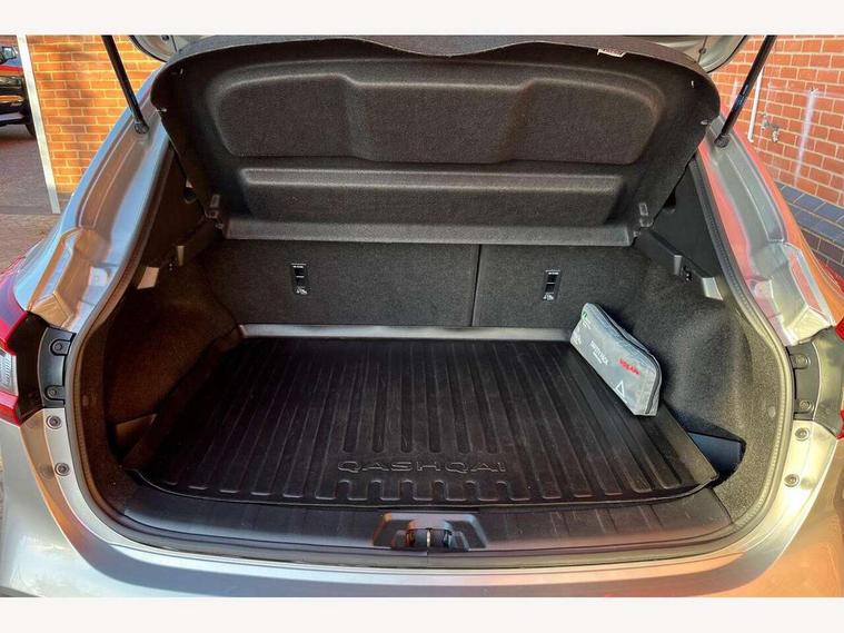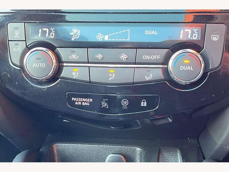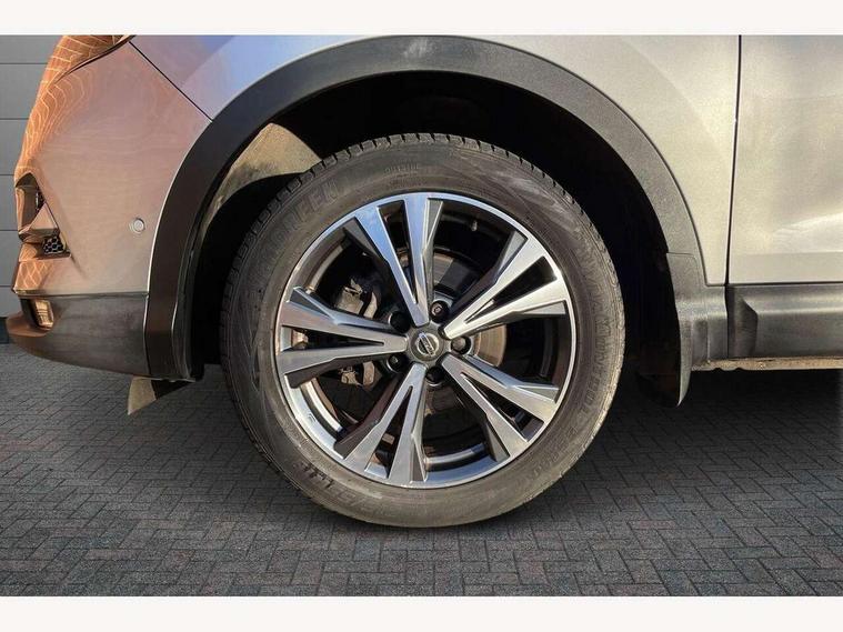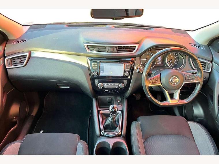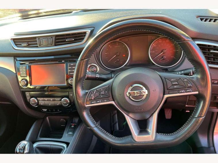 Advanced drive assist display 5'' TFT coloured screen, Android Auto, Apple CarPlay preparation, Bluetooth connectivity, Electric speed sensitive power steering, Front parking sensors, Intelligent around view monitor, Intelligent parking assist, Lane departure warning system, Nissan connect evo 7" touchscreen navigation and entertainment system, Normal or sport selectable steering, Outside temperature sensor, Push button starter, Rear parking sensors, Rear view camera, Service interval indicator, Smartphone integration, Stop/start system, Tomtom connected services, Traffic sign recognition, Trip computer, Voice control system, Diesel particulate filter, 6 speakers, AM/FM radio, CD audio system, Aux-in socket, DAB Digital radio, Steering wheel mounted audio controls, USB port, Anti dazzle rear view mirror, Auto wipers, Body colour bumpers, Body coloured door handles, Body coloured door mirrors, Chrome window surround, Daytime running lights dip function when turn signal applied, Electric folding door mirrors, Electric front and rear windows with one touch illuminated window controls, Electric front/rear windows, Electrically adjustable door mirrors, Front fog lights, Heated door mirrors, High beam assist, Intelligent auto headlights, LED indicators in door mirrors, Matt silver roof rails, One touch 4x auto windows with illuminated switches, Privacy glass, Rear roof spoiler, Rear wiper with reverse link, Shark fin antenna, Underbody vortex generators, 2 X front 12v power sockets, 3 height adjustable rear headrests, 60/40 split folding rear seat, Ambient lighting, Ambient lighting in centre console, Boot lighting, Centre console storage box/armrest, Chrome interior door handles, Cloth upholstery, Configurable luggage board system, Driver's seat manual height adjust, Dual zone climate control, Front and rear door pockets with bottle holders, Front and rear seat belt pre-tensioners with load limiters, Height adjustable front headrests, ISOFIX restraints on outer rear seats x2, Leather D shaped steering wheel, Leather gear lever, Leather knee pad, Manual height adjustable front passenger seat, Manual lumbar support on driver seat, Manual lumbar support on passenger seat, Monoform front seats with plastic backboard, Parcel shelf stow function under luggage board, Pollen filter, Rear armrest with 2 cupholders, Synthetic leather wrapped door handle with contrasting stitching, Tilt/telescopic adjustable steering wheel, Safety shield plus pack - Qashqai, 6 airbags - Driver, front passenger, curtain and side airbags, ABS, ESP, EBD and brake assist, Auto hold function, Child locks on rear doors, Electronic parking brake, Front and rear seat belt warning, Front passenger airbag deactivation, Height adjustable front seatbelts, Hill start assist, Intelligent emergency braking with pedestrian recognition, Three 3 point rear seatbelts, Tyre pressure monitoring system, Anti-theft immobiliser, Intelligent Key, Remote central locking, Thatcham Cat.1 alarm, Carbon graphite dash trim, Tyre puncture repair kit,