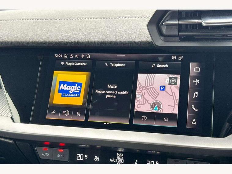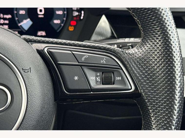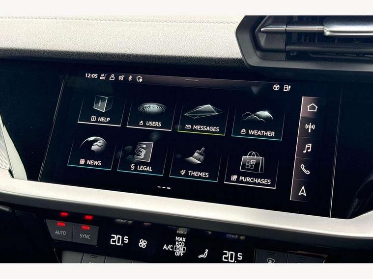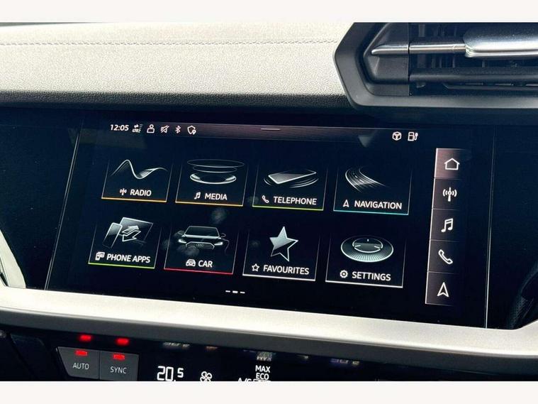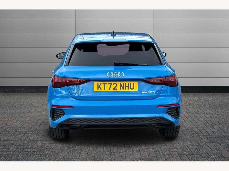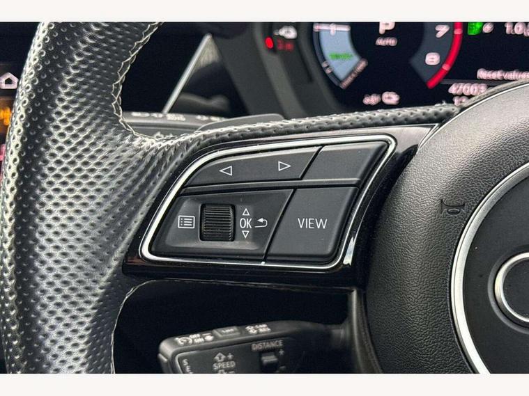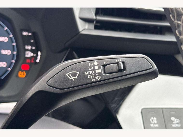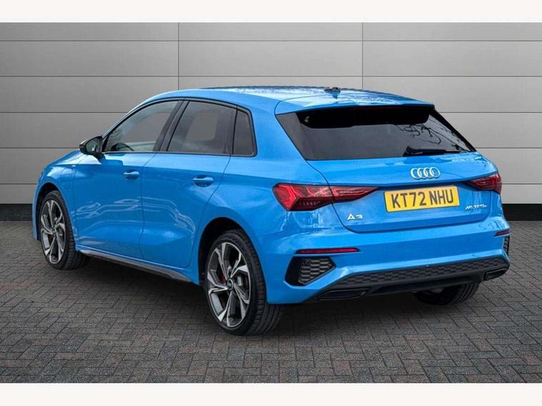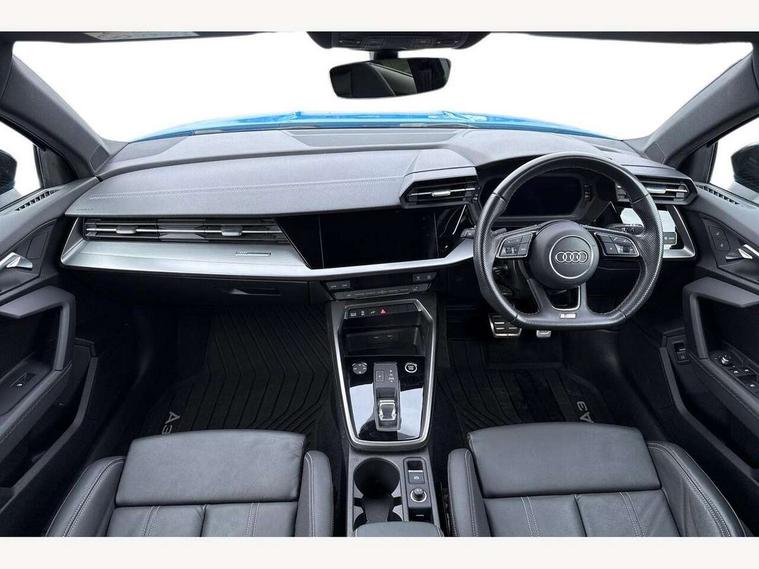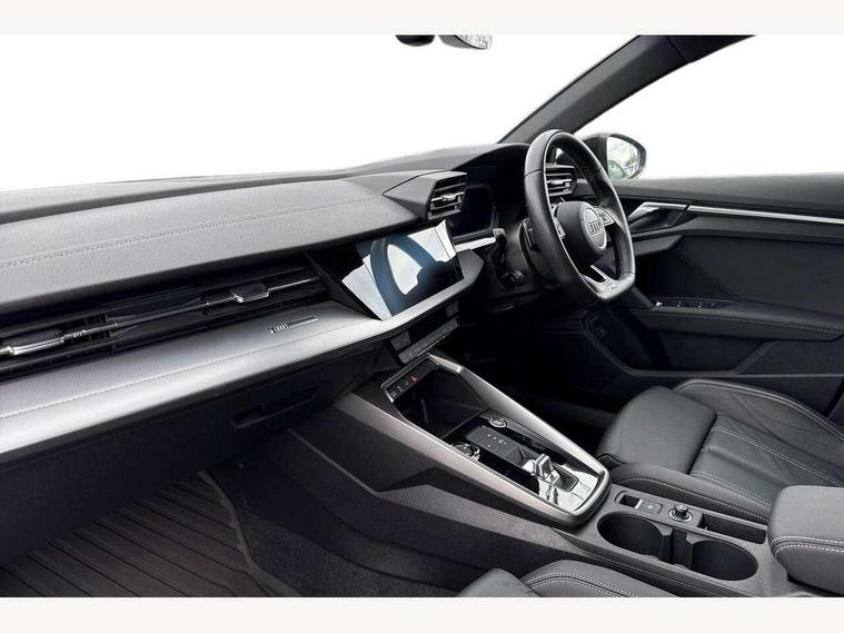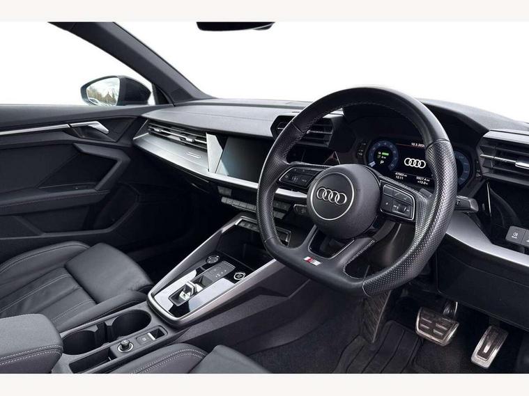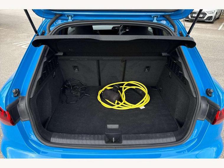 Audi drive select (Auto, Comfort, Dynamic, Efficiency and Individual), Audi smartphone interface, Audi Virtual Cockpit - 10.25" digital and colour instrument cluster, Automatic start/stop system with recuperation, Bluetooth interface, Collision avoidance assistant, e-Call (emergency call), Electromechanical power speed sensitive steering, Lane departure warning system, MMI Navigation Plus with high resolution 10.1" colour touch screen display, Service indicator, Trip computer, Voice control system with natural language interaction, 2.9 kW On-board charger, 3 pin 10 amp domestic charging cable, Standard suspension, Type 2 mode 3 32 amp charging cable, Type 2 socket for AC charging, 2xUSB-C connection with data and charging functions, 6 passive loudspeakers, DAB Digital radio, 3rd brake light, Acoustic glass windscreen, Aluminium window trim, Auto dimming frameless rear view mirror, Electrically adjustable/heated/folding/auto dimming door mirrors with integrated LED indications + kerb view function for passenger side, Front electric windows, Illuminated aluminium inserts front door sills with S logo, LED daytime running lights, LED headlights with LED rear lights and dynamic rear indicators, Light and rain sensors, Privacy glass - dark tinted rear window, rear door and side windows, Rear electric windows, Rear side air outlets in grained matt black, Rear side wing doors, Rear wiper, S line bumpers, S roof spoiler, 12V socket and storage compartment in front centre console, 3 seat bench in 2nd row, 3 spoke leather multifunction steering wheel with paddle shift, 40/20/40 split folding rear seat bench with cupholder, Black cloth headlining, Dual zone electronic climate control, Front and rear centre armrest in leather, Front and rear headrests, Front/rear floor mats, Height and reach adjustable steering wheel, Illuminated vanity mirror, Interior lighting - glove compartment light and right hand side, Luggage compartment floor covering, Manual boot compartment lid, Manually adjustable front seats, Seat side bolsters, Single front passenger seat, Stainless steel pedals and front footrest in black, Twin leather upholstery with front sports seats S embossed logo, Aluminium interior elements pack - A3 Sportback, Black styling pack - A3 Sportback, LED interior lighting pack - A3 Sportback, S line styling pack - A3 Sportback, 3x3 point rear seat belts, Audi pre sense front, Driver and front passenger airbag with passenger airbag deactivation, Electronic Stabilisation Control (ESC) including ABS, ASR and EDL, First aid kit with warning triangle and 2 safety vests, Front side airbags with head airbags and interaction airbag, Pre-sense front with pedestrian and cyclist detection, Red brake calipers, Seatbelt monitoring, Tyre pressure loss indicator, Anti theft alarm, Anti-theft wheel bolts, Electronically operated child lock, Immobiliser, Remote control central locking, Accent surfaces in the dashboard and centre console in platinum grey silk effect paint finish, Dark spectrum aluminium inlays, Tool kit, Tyre repair kit,