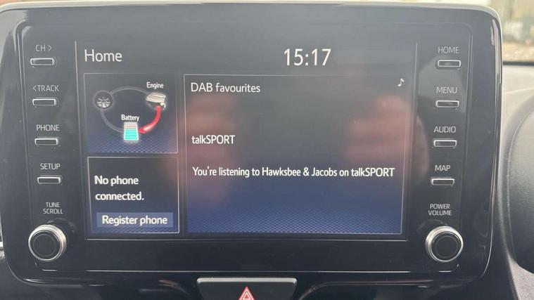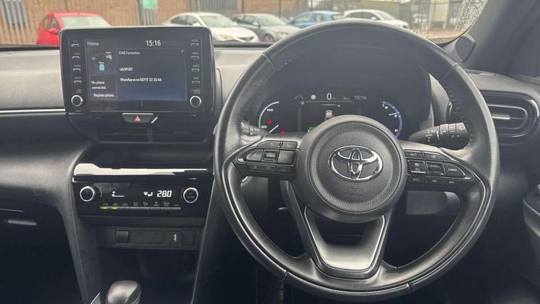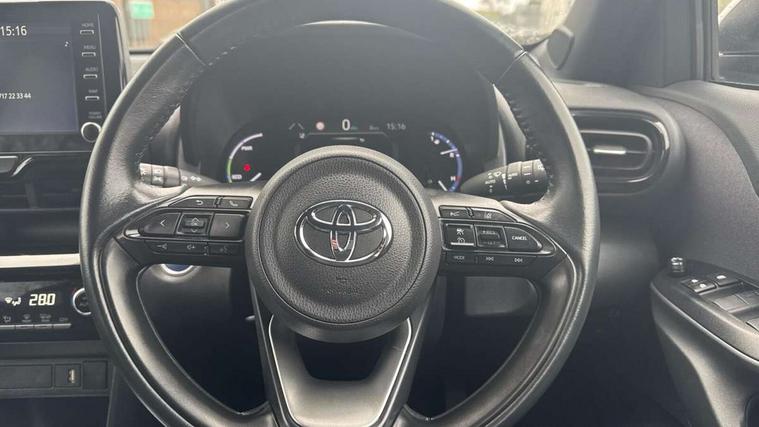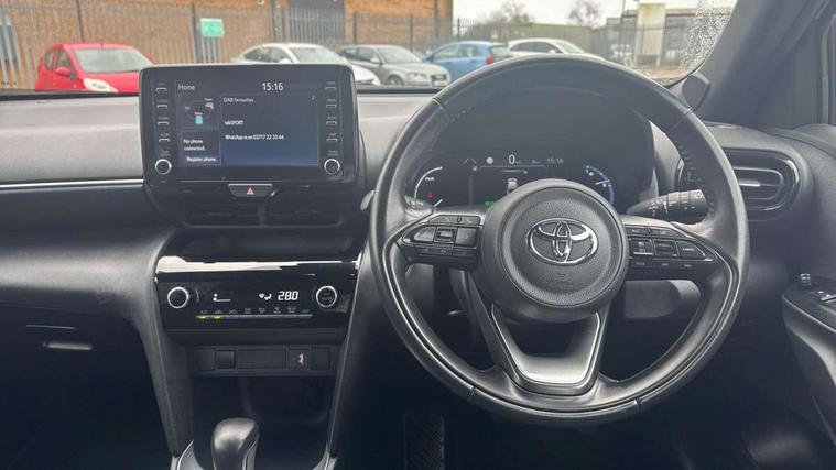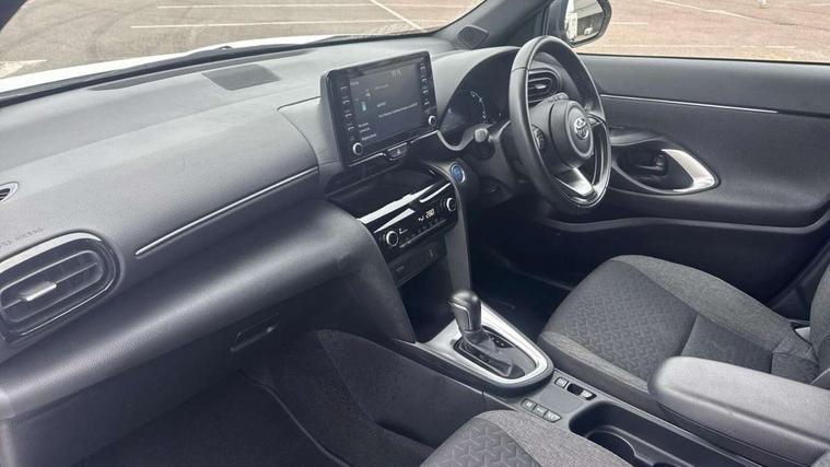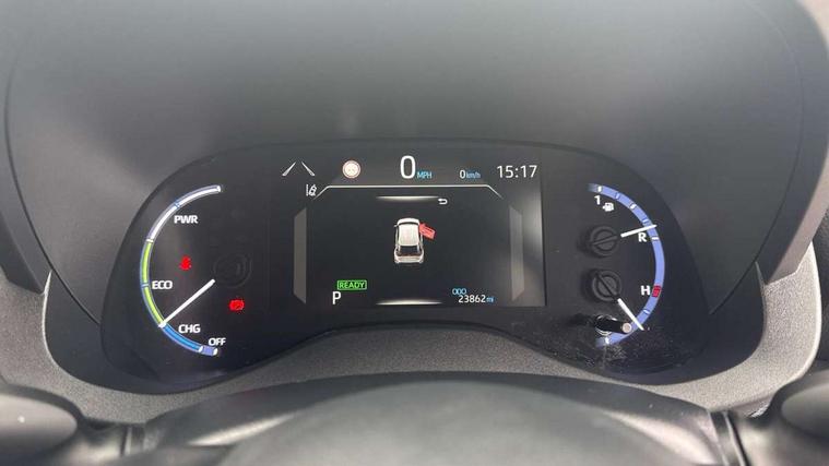7" Multi information display screen, 8" Toyota touch 2 multimedia system with Smartphone integration with Apple CarPlay and Android auto, Adjustable speed limiter, Bluetooth connectivity, Driver attention alert system, eCall emergency system, Electric power steering, Full range intelligent adaptive cruise control, Hybrid system indicator, Key reminder warning, Lane trace assist, Multimedia, audio, telephone and voice recognition switches on steering wheel, My T Connected services, Pre-collision system enhanced with emergency steering assist, Reversing camera, Road sign assist - RSA, Steering assisted vehicle stability control, 6 speakers, DAB Digital radio, USB connection, 3rd brake light, Acoustic windscreen glass, Aluminium roof rails, Anti-jam protection on power windows, Auto high beam [AHB] with on/off switch, Automatic headlights, Black lower front grille, Black Shark-fin antenna, Black upper front grille, Black wheel arch mouldings, Body colour door handles, Body colour front bumper, Body colour rear bumper, Electric adjustable heated door mirrors, Follow me home headlights, Front and rear electric windows with auto up/down function, Front intermittent wipers, Headlight cut off reminder, Indicators integrated on door mirrors, Intermittent rear wiper, LED daytime running lights guide, LED front fog lights, LED front light guide, LED Indicators, LED projector headlights, LED rear light guide, Manual headlight levelling, Manually retractable door mirrors, Noise reduction layer on windscreen, Privacy glass, Rain sensor, Rear LED lights with sequential indicators, Rear side wing doors, Rear spoiler, Rear window defogger, 12v power outlet - front, 2x Rear coat hooks, 3 seat bench in 2nd row, 3 spoke leather steering wheel, 40:20:40 split folding rear bench seat, Adjustable speed limiter switch on steering wheel, Auto air conditioning, Black roof lining, Boot light, Central armrest, Centre console in light blue ambent lighting, Driver and front passenger personal lights, Fabric door trim, Fabric upholstery, Footwell in light blue ambient lighting, Front console box, Front cup holders, Front head restraints, Glovebox, Height adjustable driver's seat, Height adjustable front passenger seat, Hooks for luggage holding belts, ISOFIX child restraint system, Lane departure alert switch on steering control, Leather gearshift, Light blue ambient lighting on front doors, Manual telescopic and tilting steering wheel, Mirror on driver and passenger sun visor, Pollen air filter, Rear cup holders, Rear head restraints, Single front passenger seat, Soft tonneau cover, 3x3 point rear seat belts, ABS+EBD+Brake assist, Driver and passenger central airbags, Driver and passenger front airbags, Driver and passenger side airbags, Electronic parking brake, Emergency brake light system (EBS), Front seat belt reminder, Hill start assist control (HAC), Passenger airbag on/off switch, Pre-collision system with pedestrian and cyclist detection, Rear door child safety locks, Rear passenger side airbags, Rear seat belt reminder, Traction control, Tyre pressure warning system, Immobiliser, Intrusion alarm, Keyless smart entry with push button start, Power door locks, Power passenger window lock, Remote door lock, Tyre repair kit,
