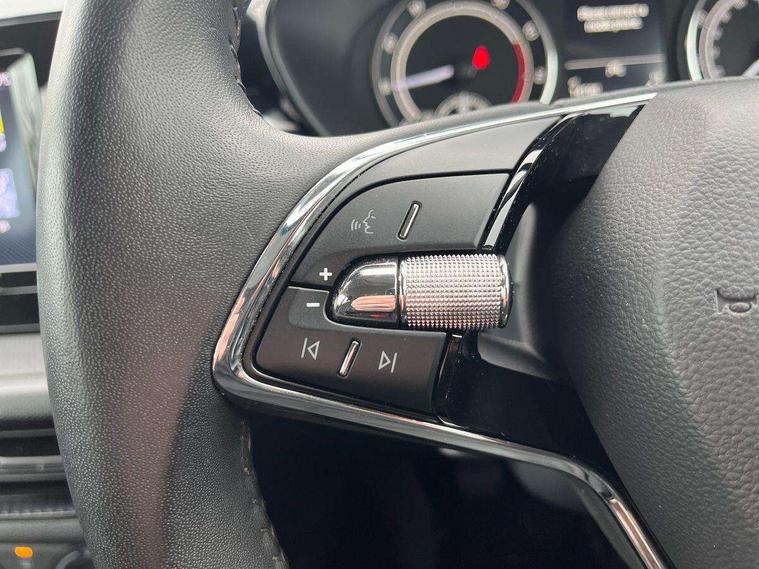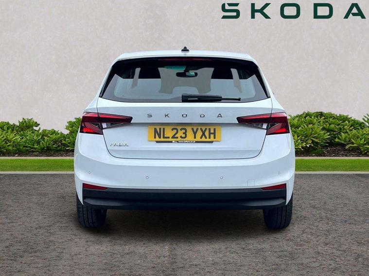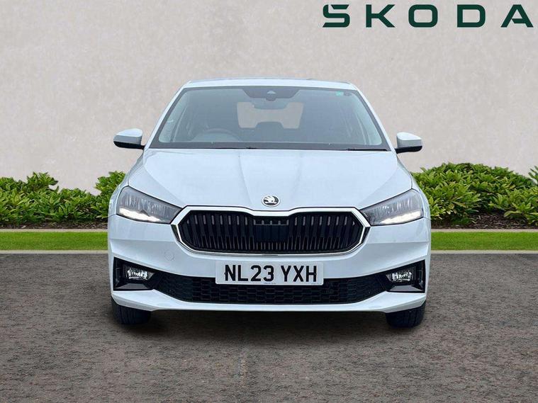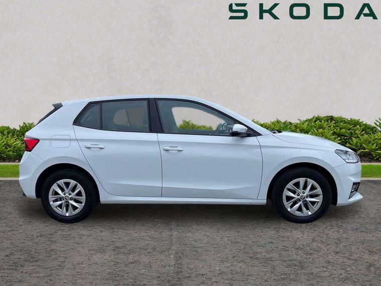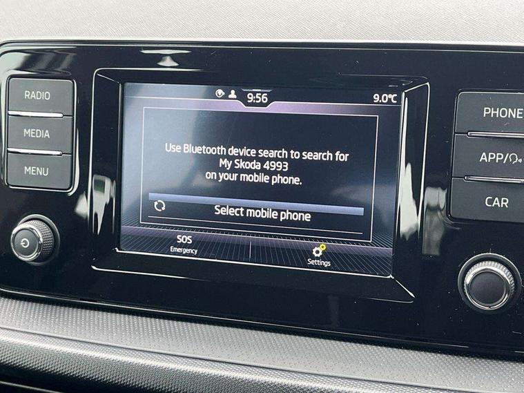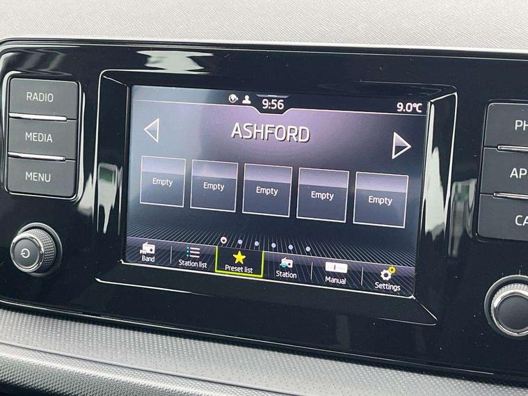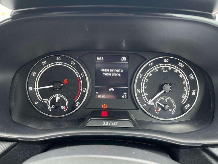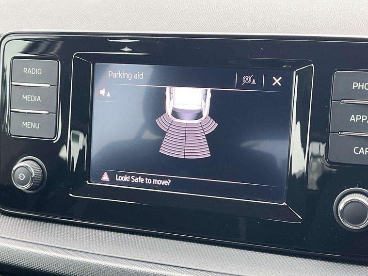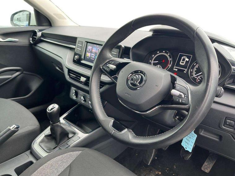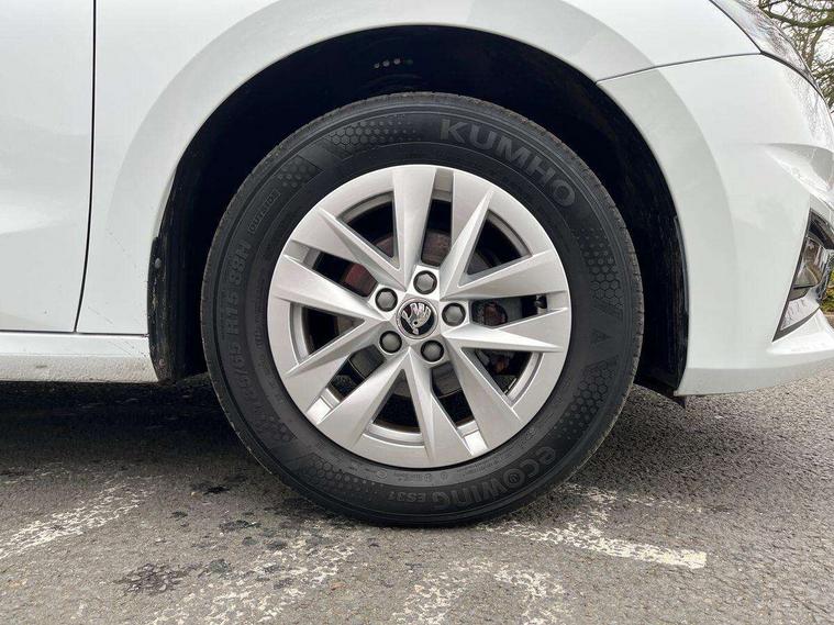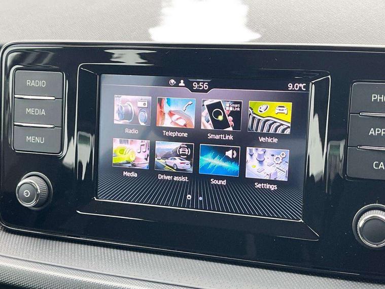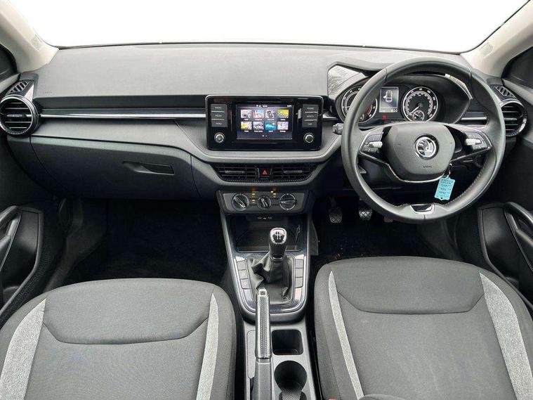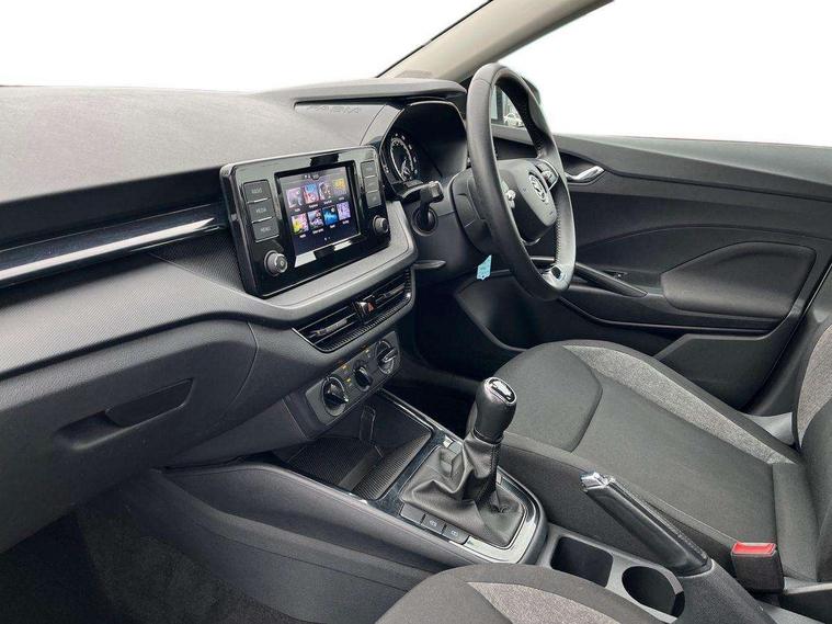 Bluetooth connection, Driver alert system - DAS, Electromechanical power steering, Exterior temperature gauge, Lane assist including road edge detection, Multifunction trip computer in black and white, Service interval indicator, Speed limiter, 2x USB-C in the front (for data transmission and charging), 4 speakers in front, Auxiliary socket for external MP3 player, DAB digital radio reception, Radio Swing with 6.5" colour display, Basic LED Headlights, Basic rear lights, Body colour door mirrors, Body coloured bumpers, Dimming rear view mirror with black frame, Door mirror integrated indicators, Electrically adjustable and heated door mirrors, Electrically adjustable front windows with function auto up/down, Front fog lights, Front window wiper intermittent control, Headlight range control - Automatic, Ice scraper in fuel cap, LED daytime running lights with coming and leaving home feature, Mechanical adjustable rear windows, Rain sensor, Rear LED fog light, Rear side wing doors, Rear window wiper with washing nozzles, Roof mounted spoiler, SKODA tailgate lettering in chrome, Third brake light, 2 reading lights in front and 2 reading lights in rear, 2 spoke leather multifunction steering wheel, 3 rear headrests, Backrest split and folding, Central console with fixed cup holder and storage box, Chrome handbrake release button, Fabric upholstery, Gearshift knob/handle in leather, Grain satin black interior door handles, Hand brake lever handle in leather, Height adjustable front headrests, Height adjustable front seats, Height adjustable steering wheel, ISOFIX and TopTether anchorage points to the outer rear seats, ISOFIX and TopTether on the front passenger seat, Luggage compartment lighting, Manual air conditioning, Manually adjustable lumbar support in front seats, Pollen filter, Rear seat bench unsplit, Single front passenger seat, Storm grey headlining, Sun visors with mirror and airbag label on passenger side, Ticket holder, 3-point height adjustable front seats belts with pretensioner and force limiter, Automatic warning lights in case of crash, Driver and passengers airbag with switch off function, e-Call+, ESC including ABS, MSR, ASR, EDS, HBA and XDS, Front and rear seat belt warning, FRONT ASSIST (AEB City and AEB Inter Urban), Front side airbags, Head airbags, One tone horn, Pedestrian protection, Three rear 3-points safety seat belts with pretensioner and force limiter including stop function for outer rear seat belts, Tyre pressure monitoring system, Anti-theft alarm system including immobiliser, interior monitoring, backup horn, and towing protection, Central locking with radio remote control, interior controls, SAFE function and 2 foldable keys, Black painted air vents, Glossy black decorative trim, Grain satin black central console cover, Grain satin black lower decorative trim, Satin black door and side trim panel in front, Anti-theft wheel bolts protection, Super-low rolling resistance tyres,