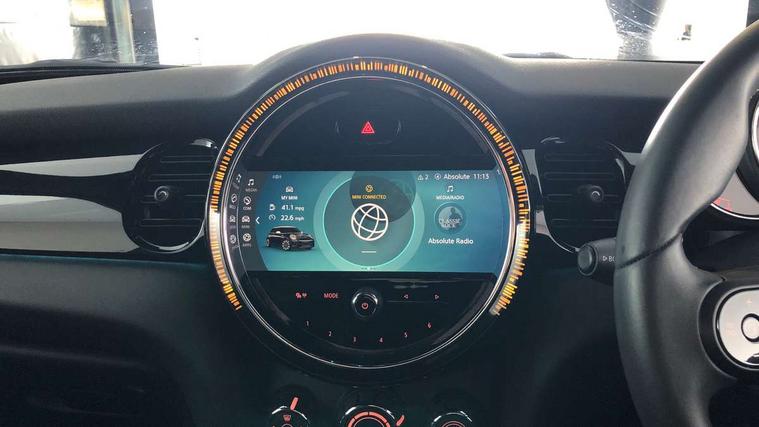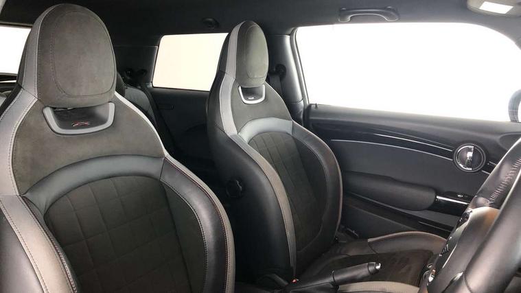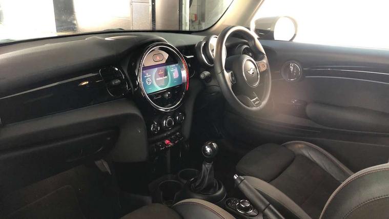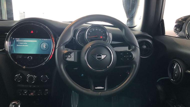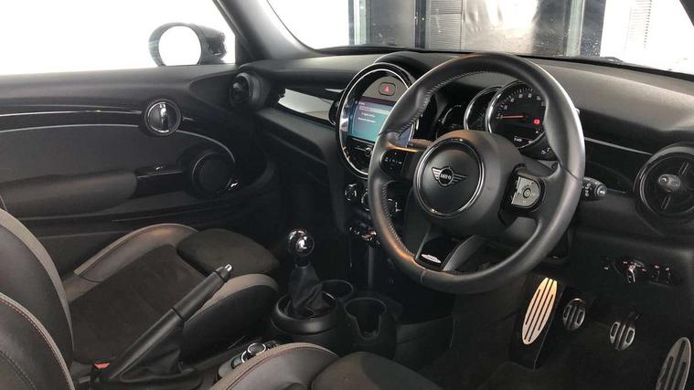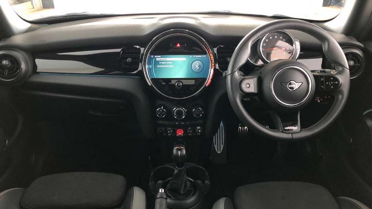 Apple CarPlay, Automatic start/stop function with brake energy recuperation, Compatible mobile phone bluetooth with audio streaming, Cruise control with brake assist, Electro-mechanical speed dependant steering assistance, Flexible car sharing preparation, Instrument cluster, MINI Driving Modes - centre toggle switch to control driving setting (sport, mid and green), Mini E-call, MINI TeleServices, On board computer, Rear park distance control, Service interval indicator, 6 Speed manual transmission including gear change indicator display, Double Vanos system, Fully variable valve control, High precision injection, Intelligent adaptive suspension, Performance Control, 8.8" touchscreen with LED ring, FM tuner and DAB digital radio, 3rd brake light, Automatic headlight activation switch, Body colour fuel filler cap, Chrome border high gloss black slats radiator grille, Dynamic brake lights, Electric front windows, Exhaust tailpipe on left with chrome finisher, Heated rear window, Heated windscreen washer jets, JCW Aerodynamic kit - Front and rear bumpers with sporty JCW styling and part-painted side sills with MINI John Cooper Works door sill finishers, John Cooper Works rear spoiler, LED headlight with closed ring and daytime driving lights, Metal door sill strips with MINI imprint, Model logo Cooper on right of tailgate, Rain sensor window wipers, Rear fog lights, Rear LED lights with union jack design, Rear window wiper, Side scuttle panel with integrated indicator, Sun/heat protection glass, White indicator lenses, 12V Accessory socket in centre console, 2 seat bench in 2nd row, 4 lashing eyes in luggage compartment, 60/40 split folding rear seat, Anthracite headliner including grab handles and clothes hooks, Carbon black colour line - Knee roll and door armrest, Chrome interior highlights, Cupholders, Front and rear isofix with front passenger airbag deactivation, Front floor mats in velour, Glove compartment, Height and length steering column adjustment, Interior lighting with 12 different colours across the dashboard, underneath door bezel with illuminated laser-engraved design on central display, JCW Sport seats with integrated headrests, adjustable thigh support and John Cooper Works logo, Leatherette gearshift lever and handbrake gaiters, LED reading lights, vanity mirror lights, front foot well light and spotlight on front seats, Manual air conditioning, Mechanical seat adjustment - forward/back & backrest for front seats and driver seat height adjust, Multifunction steering wheel, Passenger seat height adjuster, Single front passenger seat, Storage compartments in doors, Sunvisors with vanity mirrors, Walknappa leather steering wheel with grey seam and John Cooper Works badge on Piano Black lower steering wheel spoke, Piano black exterior pack - Mini Hatchback Cooper, 3 point seatbelts on all four seats, 6 Airbags - front, side, head and seat belt tensioners, Anti-lock braking system (ABS), DSC - Dynamic Stability Control, Front and rear disc brakes, Single tone fanfare horn, Tyre pressure monitoring system, Alarm system with tilt sensor, monitoring doors, bonnet interior and tailgate, Electronic vehicle immobiliser, Start/stop toggle with keyless go, Piano black interior trim, Tool kit,