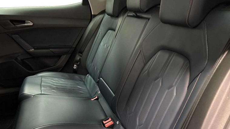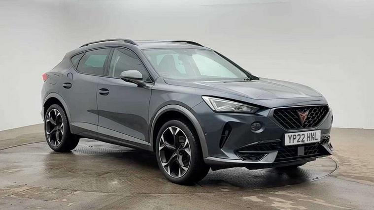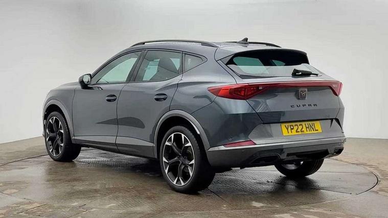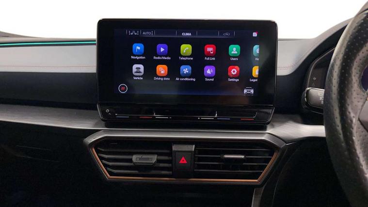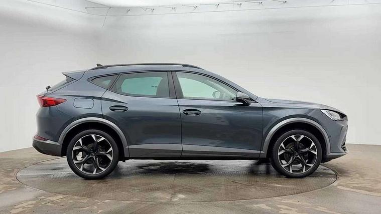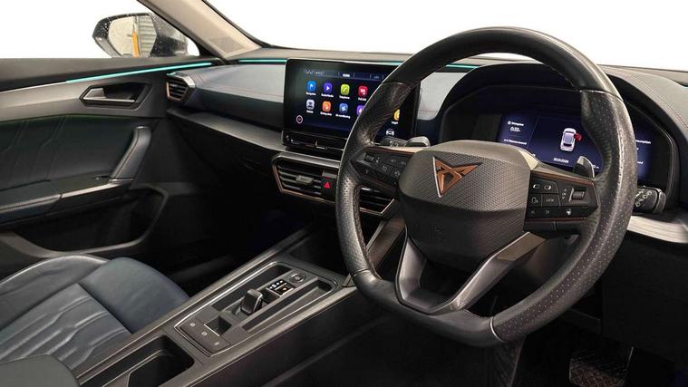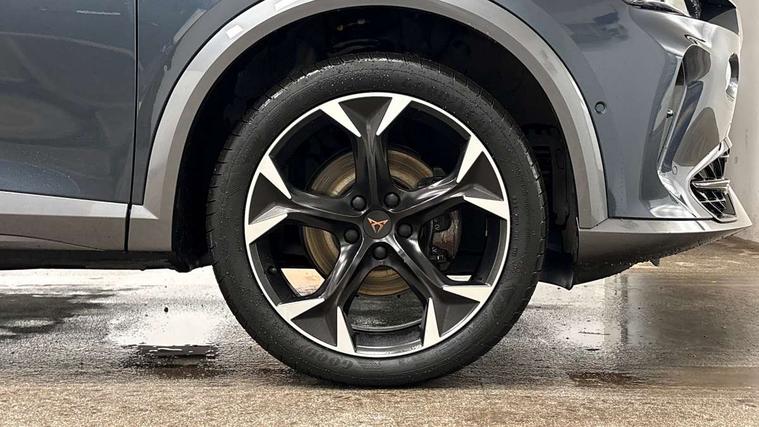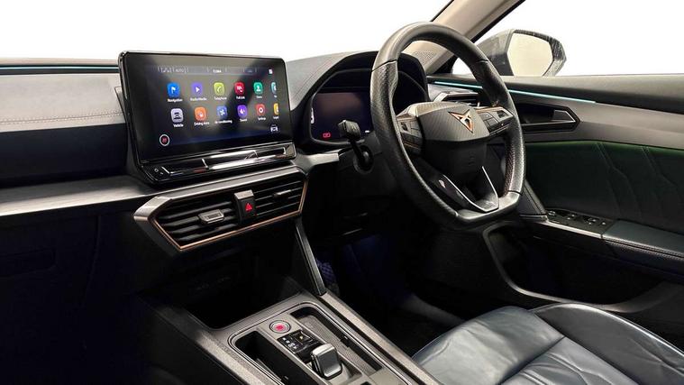 Digital cockpit and configurable dashboard, Driver alert system, Driving profile selection, E-call, Forward collision warning with automatic braking, Lane assist, Park assist (inc front/rear parking sensors), PAS, Predictive adaptive cruise control with speed limiter, Rear view camera, RPM, trip computer, outside temp gauge, instrument light brightness, low fuel warning light, lights on reminder, gearshift indicator, Service interval indicator, Start/stop system with regenerative braking, Wireless apple carplay, Wireless phone charger, Electronic locking differential and dynamic traction support, Standard suspension, 2 front and 2 rear USB type C sockets, Auxiliary input socket, DAB radio, Auto dimming rear view mirror, Body colour door handles, Body coloured bumpers, Dark grey wing mirror, Daytime running light with automatic headlight control and coming home feature, Dynamic headlight range control, Electric front/rear windows, Electrically adjustable heated and folding door mirrors with memory function, Front fog lamps with cornering function, Gloss black roof rails and window surrounds, LED Headlights, LED Taillights with dynamic indicator, Rain sensing wipers, Rear diffuser with black simulated exhaust pipes, Rear side wing doors, Rear wash/wipe, Third brake light, Tinted rear windows, Welcome lights, 12v power supply in centre console, 12V socket, 12v socket in loadspace, 2 front and 2 rear reading lights, 230V socket, 3 seat bench in 2nd row, 60/40 split rear bench seat with armrest and mechanical seat release, Dust/pollen filter, Front and rear head restraints, Front centre armrest, Height/reach adjust steering wheel, Illuminated interior front door sills, Illuminated sunvisor with mirror, Isofix, Leather multi function heated steering wheel with gear shift paddles, Luggage tie-down hooks, Single front passenger seat, Three zone climate control with control panel in rear, Variable luggage/load compartment floor, Wraparound lighting, Genuine Nappa leather Pack - Cupra, Navigation system pack with 10" navigation system - Formentor, 3 point seatbelts on all rear seats, ABS, Brake control system - ESC and brake booster, Child proof door locks, Driver and front passenger airbags with front passenger airbag de-activation, Electronic parking brake, Front and rear disc brakes, Front side curtain airbags, Hill hold control, Seat belt reminder for front and rear seats, Tyre pressure monitoring system, Anti theft alarm system, Keyless entry and start system (KESSY), Locking wheel bolts, Copper and aluminium interior detailing, 19" 'Exclusive' machined sport matte black and silver alloy wheels,