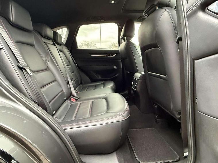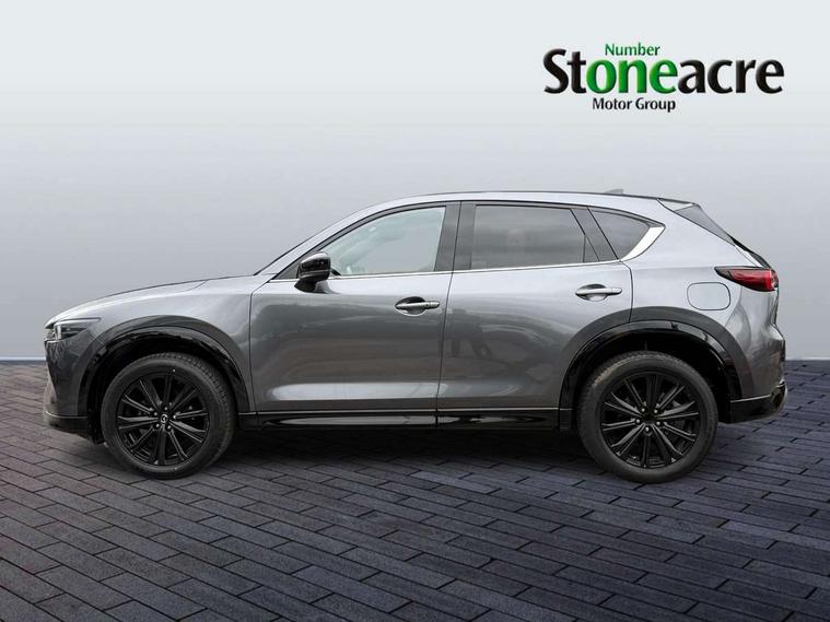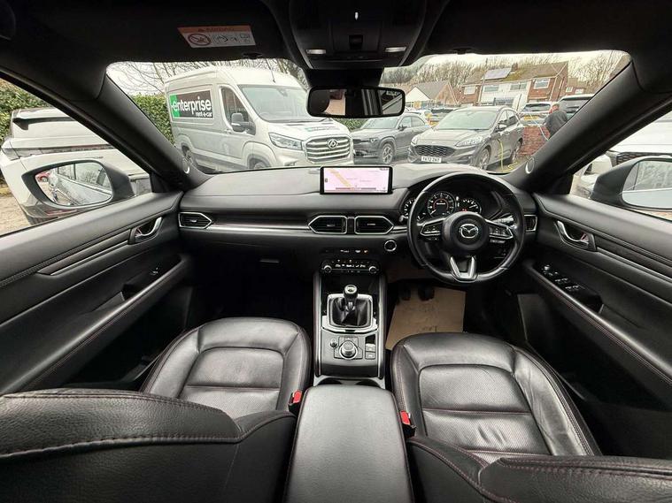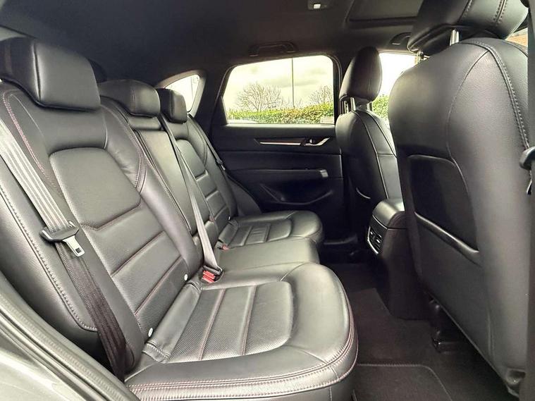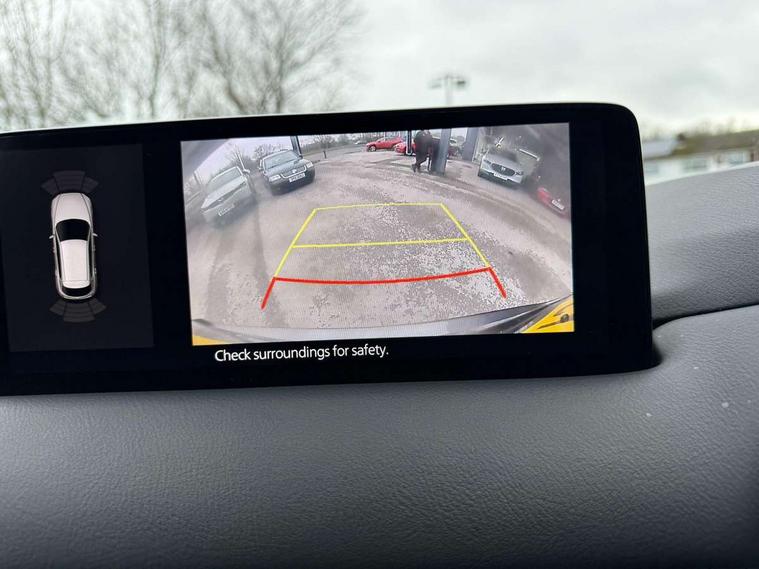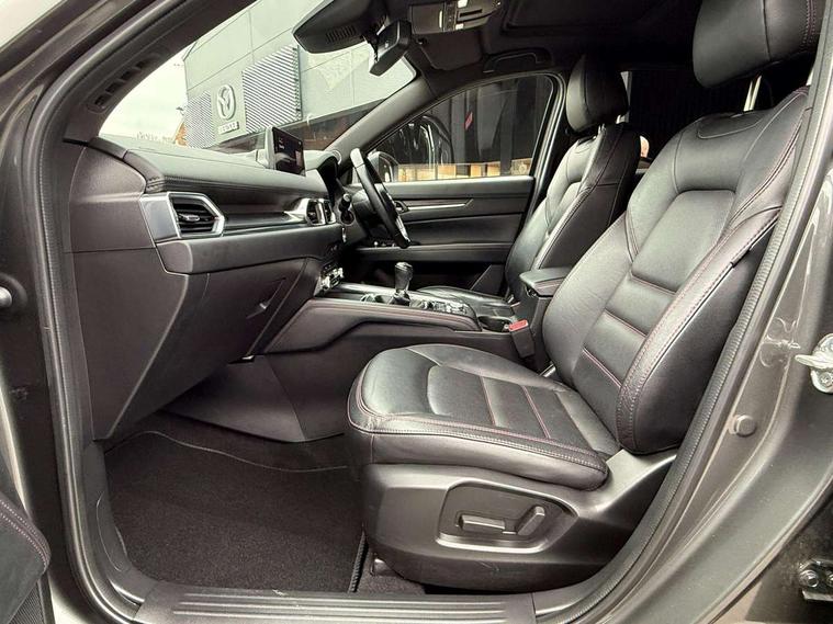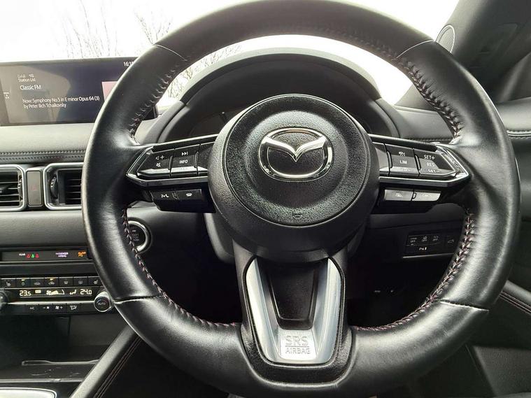 10.25" display with Mazda Connect infotainment, 7" colour TFT display, Advanced blind spot monitoring, Bluetooth connectivity with voice control, Collision prevention assist, Connected services, Cruising Traffic Support, Electric power steering, Emergency stop signalling system, Engine start/stop button, Forward collision warning, Front and rear parking sensors, Integrated navigation system, Intelligent speed assist, Lane departure warning system, Lane keep assist, Power liftgate, Qi wireless phone charging, Radar cruise control, Rear cross traffic alert, Reversing camera, Service indicator, Traffic sign recognition (TSR), Trip computer, Windscreen projected colour active driving display (HUD) with memory, Wireless apple car play/android Auto, Cylinder Deactivation, i-stop, AM/FM radio, Bluetooth audio streaming, Bose premium sound system with 10 speakers, DAB Digital radio, Multimedia Commander including separate volume dial, Steering wheel mounted audio controls, Adaptive front lighting system, Auto dimming rear view mirror, Automatic headlights, Black honeycomb door trim decoration panel, Black honeycomb interior decoration panel, Body colour roof spoiler, Coming/leaving home lighting function, Door mirror integrated indicators, Dual large chrome tailpipes, Dusk sensitive headlamps, Electric front/rear windows with one touch auto up/down, Front grille in gloss black finish, Front grille in gloss black with red accent + gloss black signature wing, Gloss black B and C pillars garnish, Gloss black door mirrors, Gloss black front and rear lower bumper mouldings, Gloss black tire arch and side mouldings, High beam assist, Intermittent rear wash/wipe, LED auto levelling, LED daytime running lights, LED front fog lights, LED Headlights, LED third brake light, Power folding and heated door mirrors, Power tilt/slide sunroof, Privacy glass (rear side windows only), Rain sensing front wipers, Rear side wing doors, Red front grille accent, Red stitching and accents on door trim, knee pad, console lid, steering wheel, shift boots, Scuff plates, Shark fin antenna, Signature LED rear combination lights, Variable intermittent front wash/wipe, Windscreen wiper de-icer, 12v electrical power outlet, 3 seat bench in 2nd row, 3 stage heated front seats, 40:20:40 Karakuri fold-flat seat system, 6 way electric adjustable passenger seat, 8 way electric driver seat with lumbar support + memory, Black roof lining, Cargo room flat floor board with waterproof undertray, Driver seat power slide, recline and height adjustment, Driver, Front passenger and two rear grab handles with coat hooks, Driver/passenger front seatback pockets, Driver/passenger sunvisors + illuminated vanity mirrors (drivers with ticket holder), Dual zone climate control, Folding centre armrest with 2 cup holders, Front and rear door pockets, Front centre storage with two cupholders, Front passenger seat power slide, recline and height adjustment, Gear shift indicator, Heated steering wheel, Humidity sensor, Illuminated glovebox, Interior dome light with integral spotlight, ISOFIX child seat anchorage points attached on outer rear seats, Karakuri tonneau cover, Leather upholstery, Leather wrapped steering wheel and gear knob, Luggage compartment LED lighting, Luggage compartment power outlet, Rear air vents, Rear headrests, Rear seat recline, Roof mounted sunglasses holder, Single front passenger seat, Three height adjustable head restraints, Tilt/height adjustable steering wheel, USB Connectivity (2x front Type-C, 2x rear Type-B), White interior LED illumination lighting, 3 point front seatbelts with pre-tensioners, 3 rear 3 point seatbelts, ABS, Advanced Smart City Brake Support - SCBS, Child locks on rear doors, Driver and front passenger side airbags, DSTC-Dynamic Stability and Traction Control, Dual front airbags, Electronic brake force distribution, Electronic parking brake with auto hold, ESP, Front and rear curtain airbags, Front passenger airbag deactivation, G-Vectoring control, Hill hold assist, Seatbelt reminder front and rear, Single stage passenger airbags, Smart brake support with forward obstruction warning, Tyre pressure monitoring system, Automatic door locking when moving off, Deadlock, Immobiliser, Power door locks, Remote central locking, Smart keyless entry, Thatcham Cat.1 alarm, 19" Black alloy wheels, Tyre repair kit,